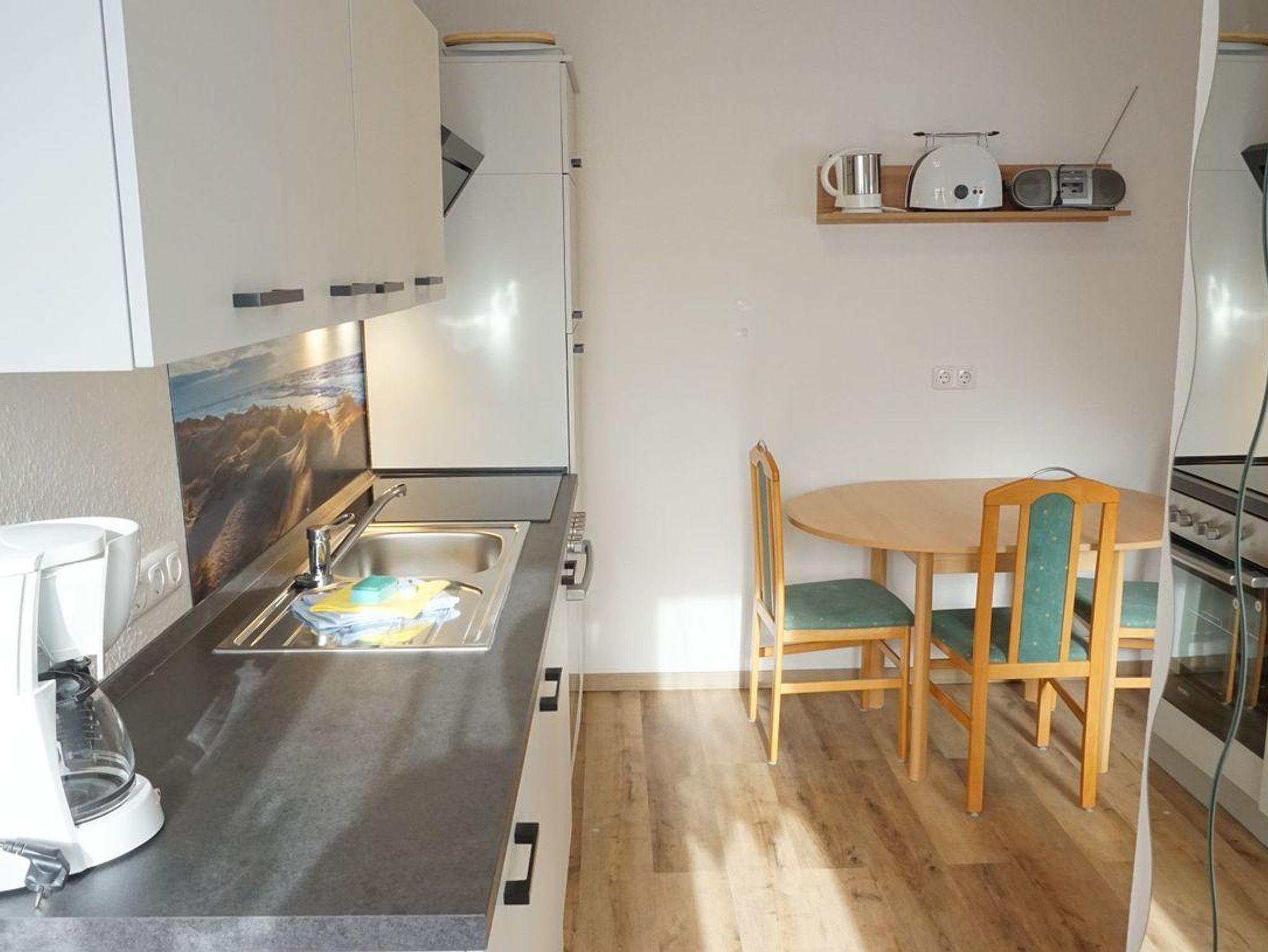 Die geschlossene Küche mit Esstisch lädt zu gemeinsamen Mahlzeiten ein. Das Duschbad ist mit einem WC und Waschbecken ausgestattet und bietet durch seinen Spiegelschrank und Regalen genug Platz zum verstauen. Ein Schreibtisch im Wohnzimmer bietet auch die Möglichkeit, während des Aufenthalts zu arbeiten.