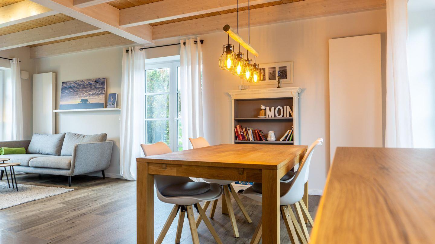 Im Herzen von Eiderstedt gelegen, ist unser Ferienhaus mit W-Lan der ideale Rückzugsort mit einem gemütlichen Wohnbereich, ausgestattet mit einem Kamin, der warme Gemütlichkeit verspricht. Die moderne, offene Küche mit Induktionsherd lädt zum gemeinsamen Kochen ein, während der angrenzende Essbereich zum Verweilen einlädt. Ein hochwertiges Vollbad mit Dusche und Badewanne, sowie ein zusätzliches Duschbad sorgen für Ihr Wohlbefinden. Eine Waschmaschine ist ebenfalls vorhanden.