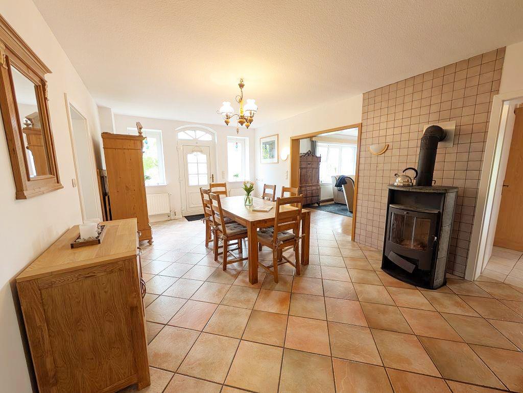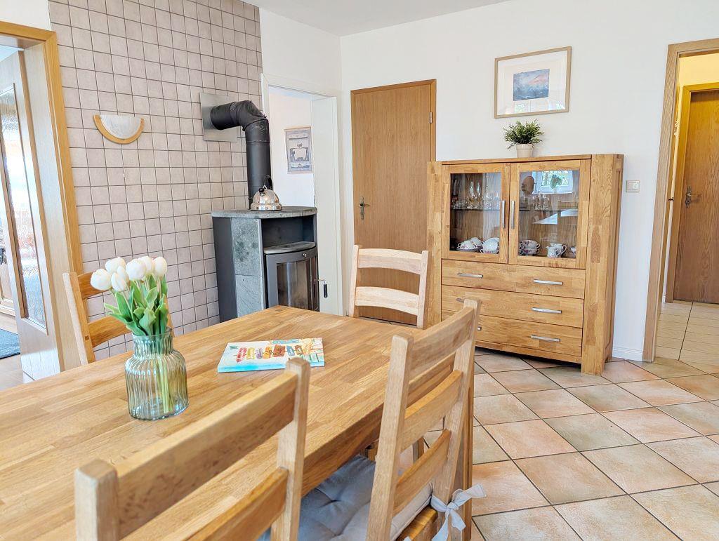 Die Unterkunft ist vollständig im Erdgeschoss gelegen und somit besonders geeignet für Familien mit Kindern oder Gäste, die barrierefreien Zugang bevorzugen. Ein gemütliches Wohnzimmer mit Kamin und Ofen bietet nicht nur Wärme an kühleren Tagen, sondern auch eine einladende Atmosphäre für gesellige Abendstunden.