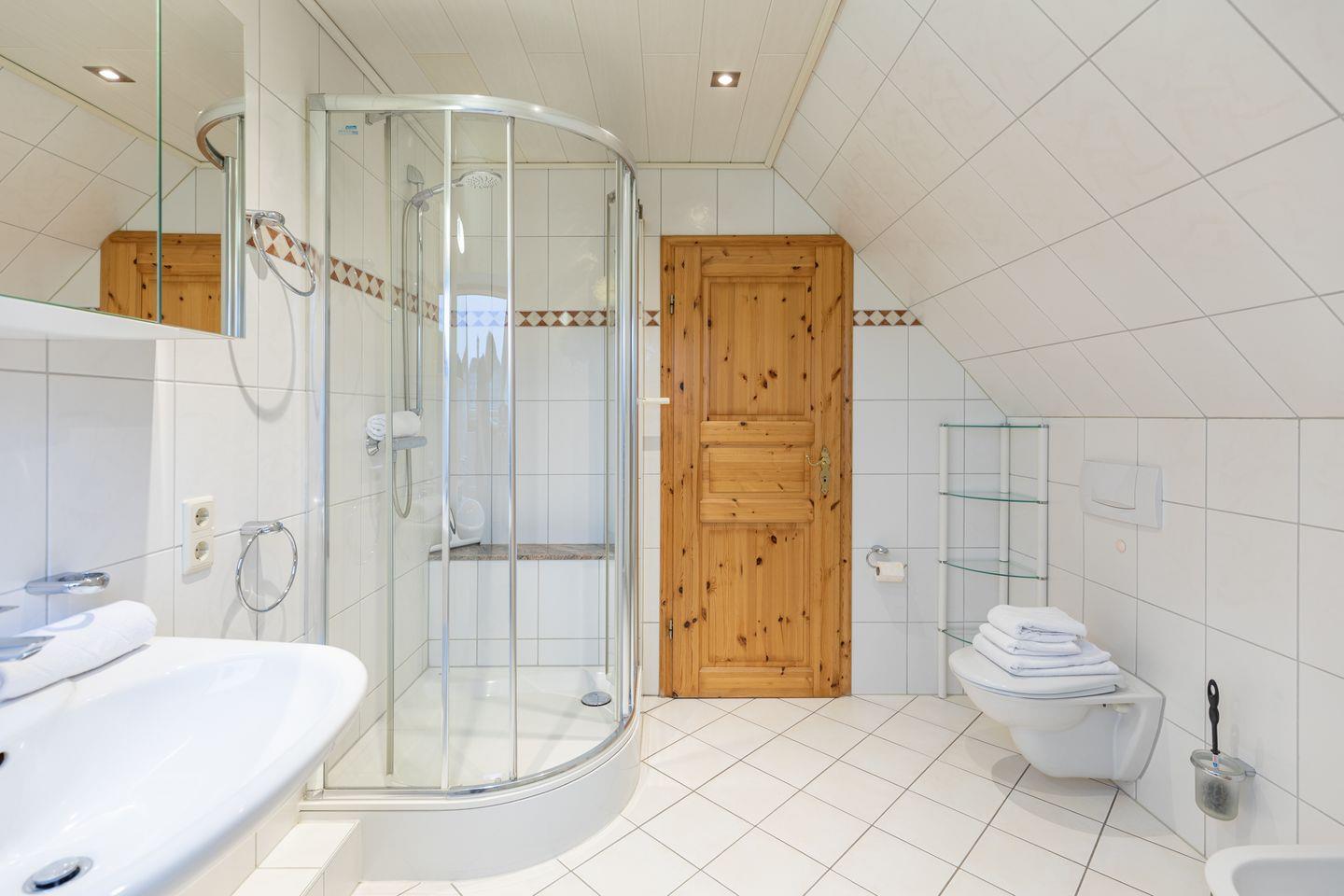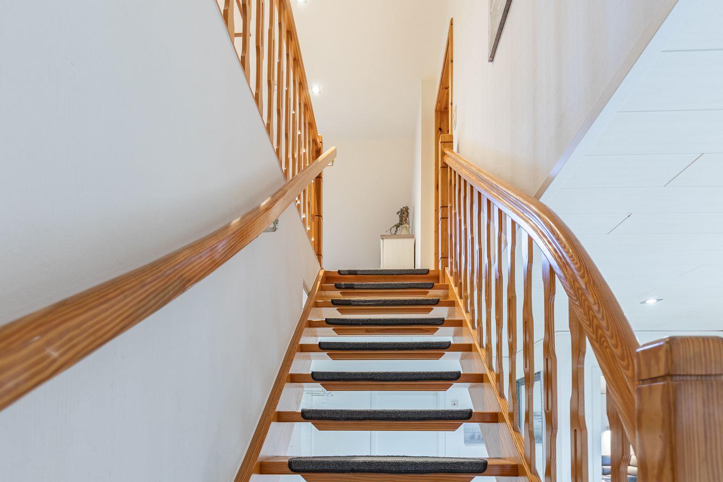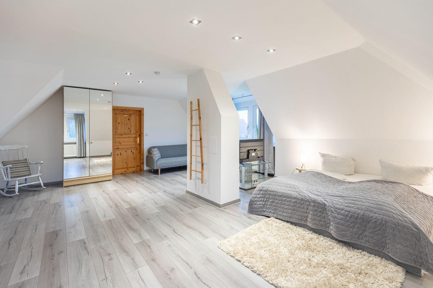 Über die offene Holztreppe gelangen Sie ins Dachgeschoss, wo Sie weitere Schlafräume, ein zweites Badezimmer sowie einen großen Wohn- und Schlafbereich mit zusätzlicher TV-Ecke erwarten.