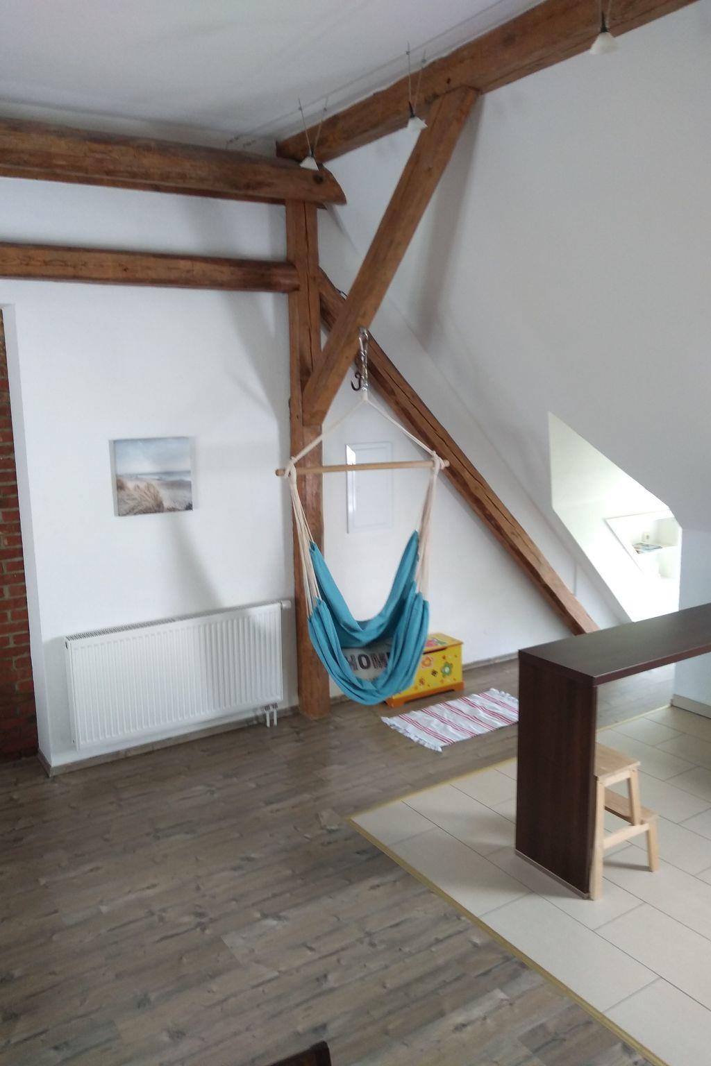 The living room has two three-seater leather sofas, hi-fi system, satellite TV, DVD player and a large selection of games and books for all ages, one of the three bedrooms has a double bed (1.80m x 2m), the other two each have a bed (1.60x2m) wardrobes and clock radios. On request, we can provide up to two cots and high chairs free of charge. The bathroom has a large corner bathtub with a clear view of the starry sky, as well as a large shower, and garden furniture is available in sufficient numbers for both flats. We also offer a barbecue, sandpit, swing, slide, football goal and basketball hoop free of charge. In our play barn you will find a sandpit, table tennis table, table football, darts and lots of children's toys. Washing machine and tumble dryer can be used for a small fee.