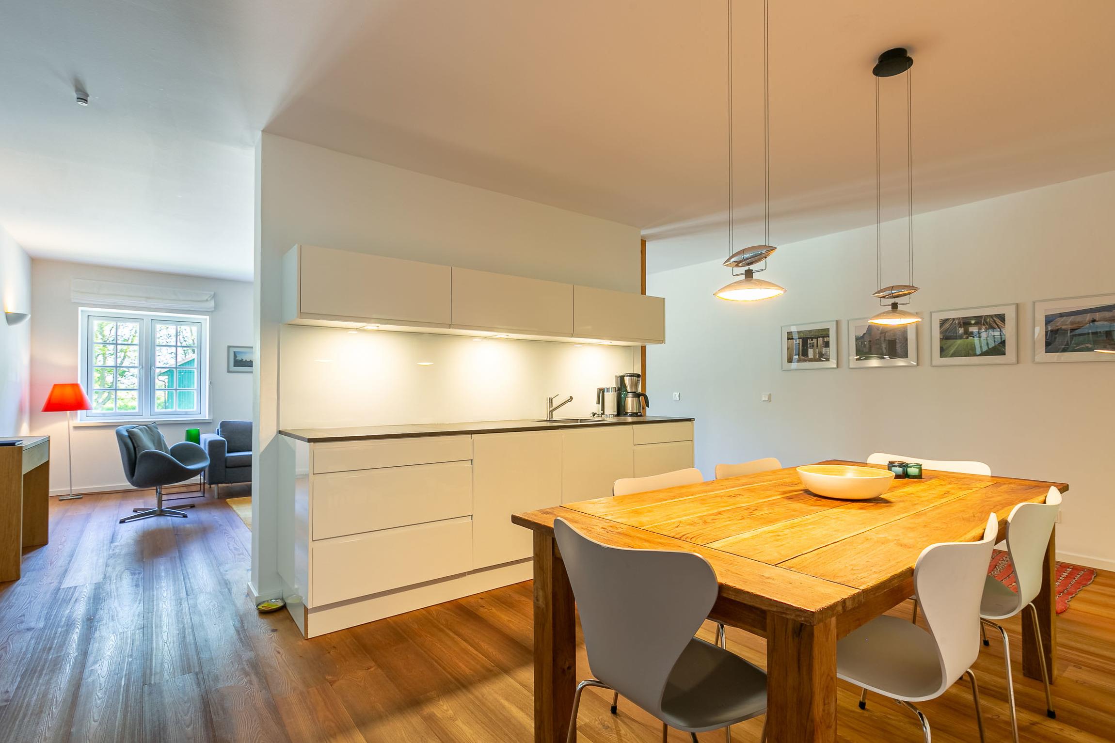 Selbst wenn es mal regnet, kann man in der großen Lohdiele noch wunderbare Abende außerhalb der eigenen Wohnung unter dem offenen Reetdach verbringen und - wenn man möchte - andere Gäste treffen oder Freunde empfangen.