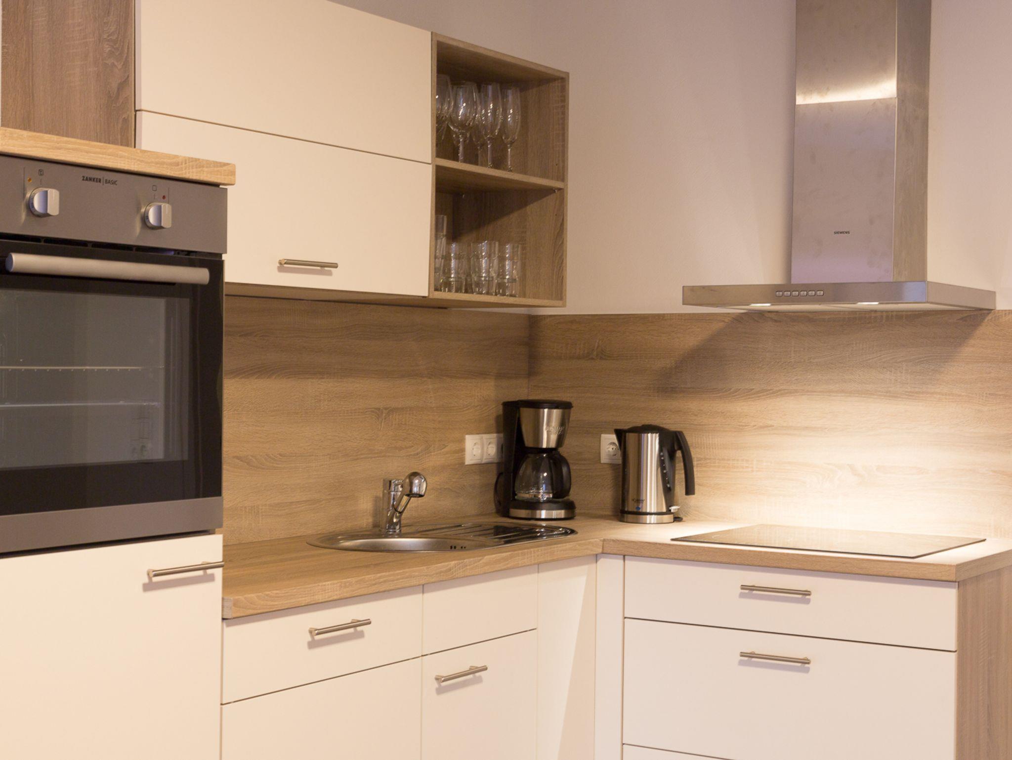 • Modern eingerichtete Küche mit Toaster, Kaffeemaschine, Mikrowelle, Cerankochfeld, Backofen, Geschirrspüler , 200 l Kühl/ Gefrierkombination, sowie LED TV,