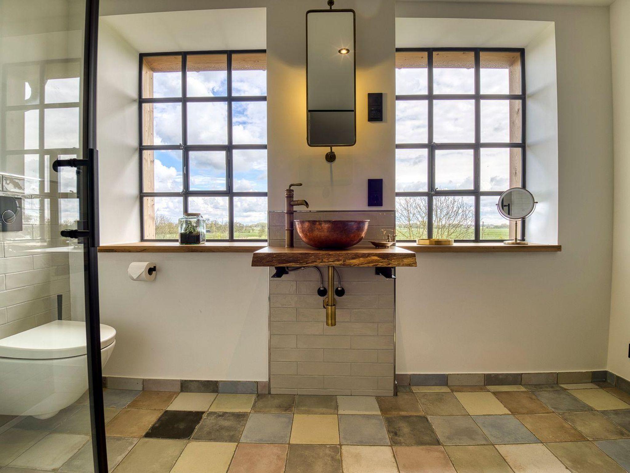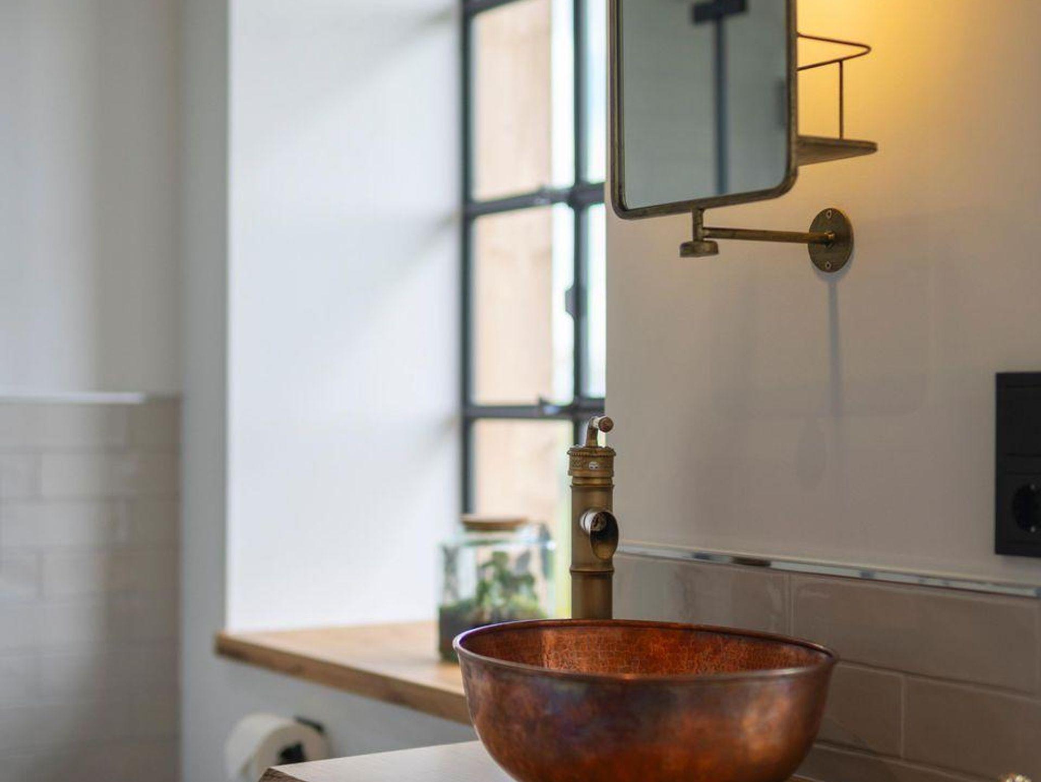 Die Treppe aus Stahl und Eichenholz führt Sie in den ersten Stock, wo ein großes Doppelbett (180er Breite) und ein geschmackvoll gestaltetes Duschbad auf Sie warten. Erleben Sie ein einzigartiges Wohnambiente, das traditionelle Elemente mit modernem Design vereint.