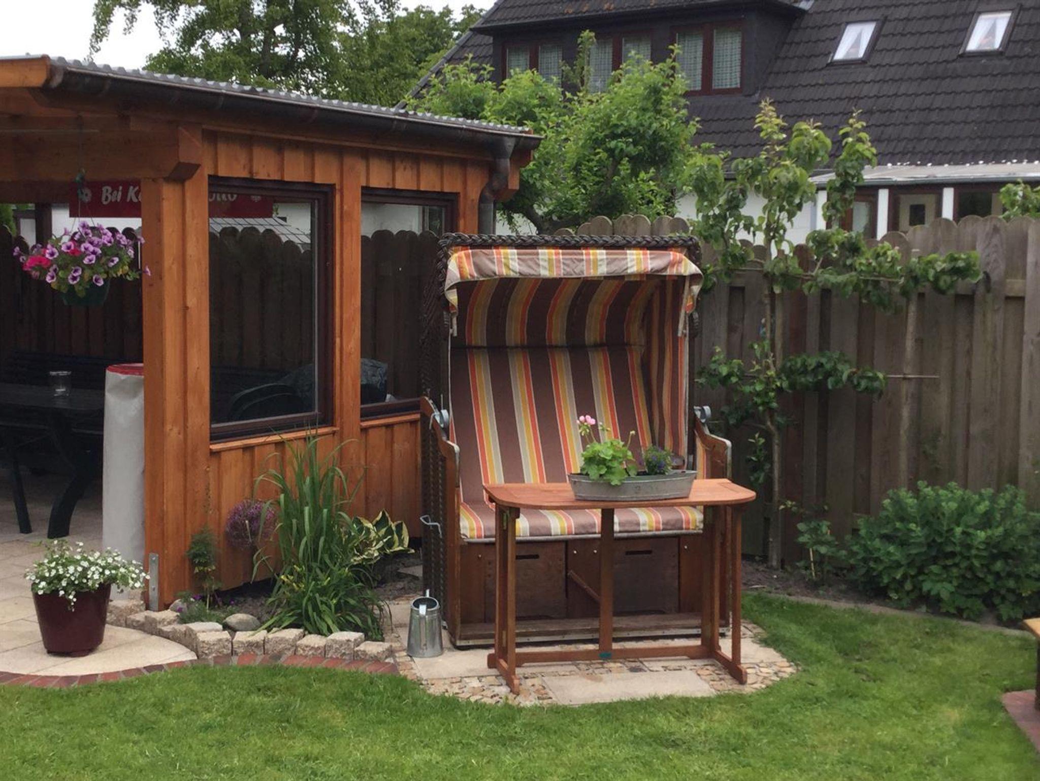 Sie finden einen großen Gemeinschaftsgarten mit Strandkorb, Gartenmöbeln einer Grillmöglichkeit