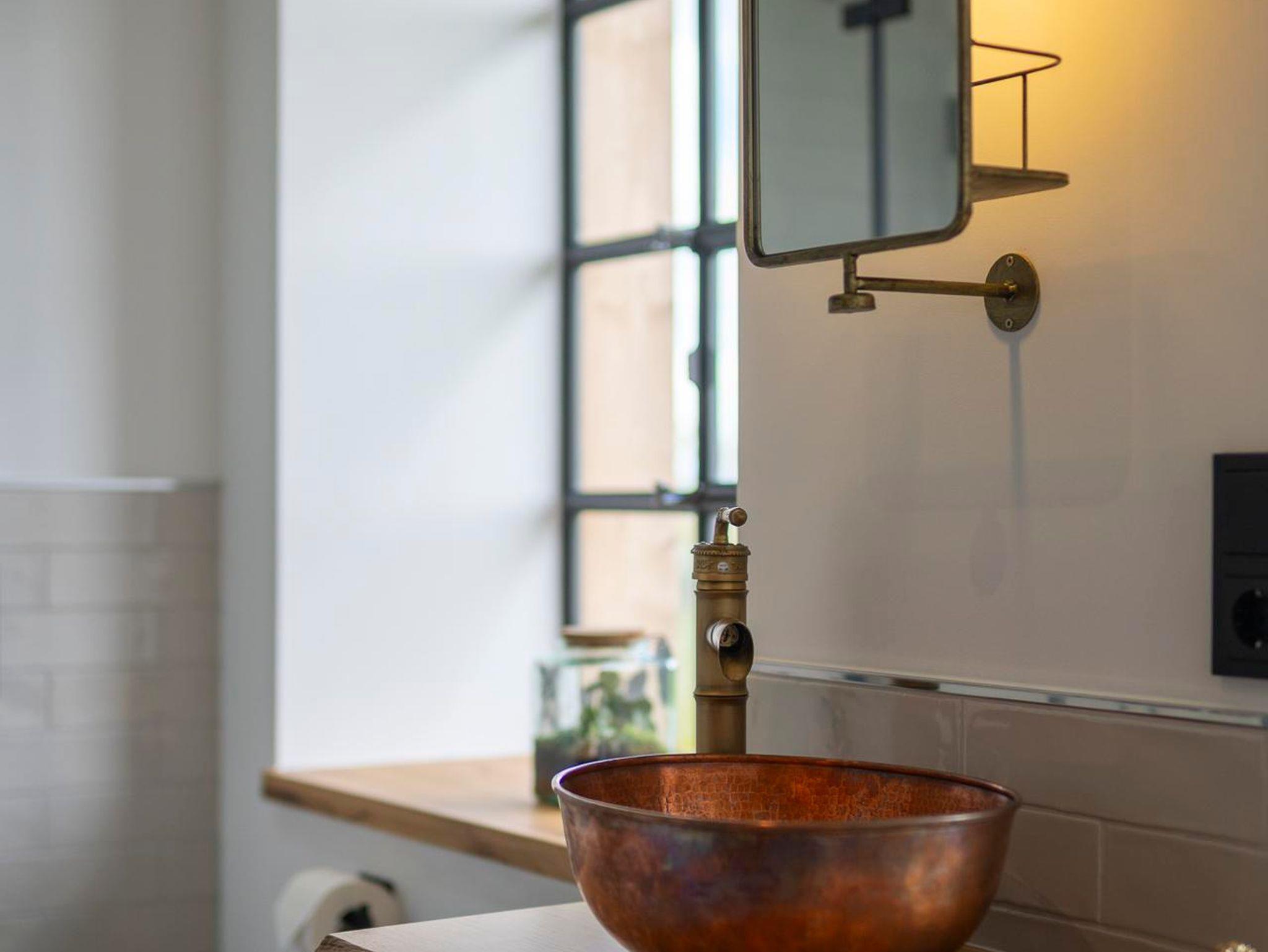 Die Treppe aus Stahl und Eichenholz führt Sie in den ersten Stock, wo ein großes Doppelbett und ein geschmackvoll gestaltetes Duschbad auf Sie warten. Erleben Sie ein einzigartiges Wohnambiente, das traditionelle Elemente mit modernem Design verein