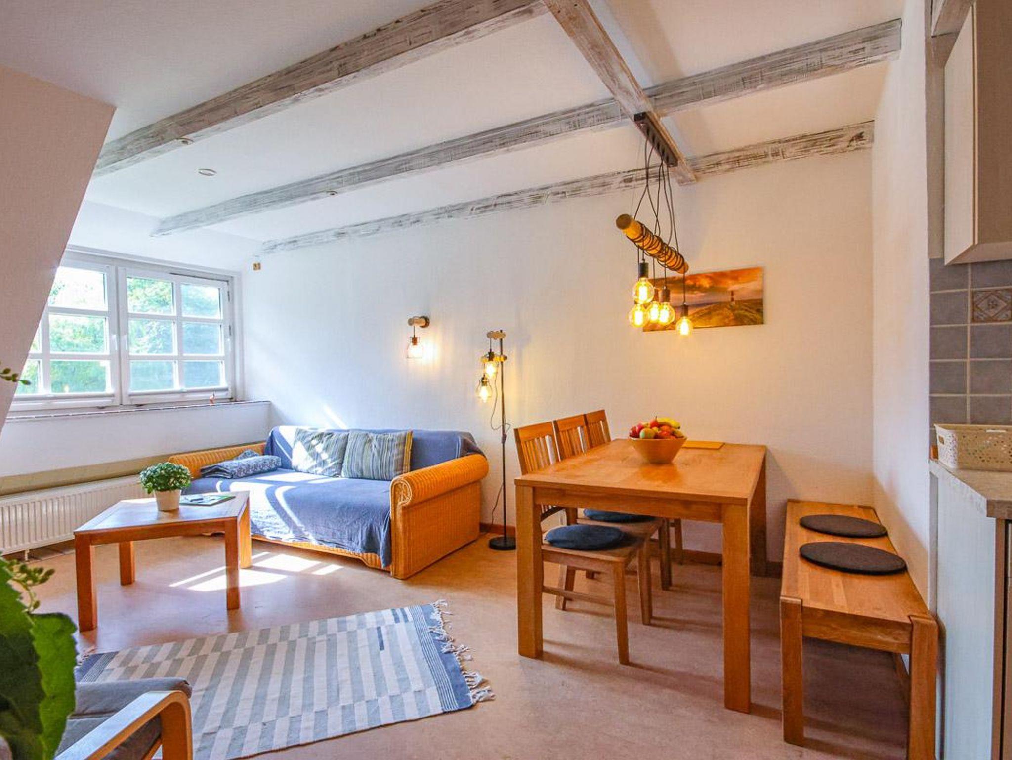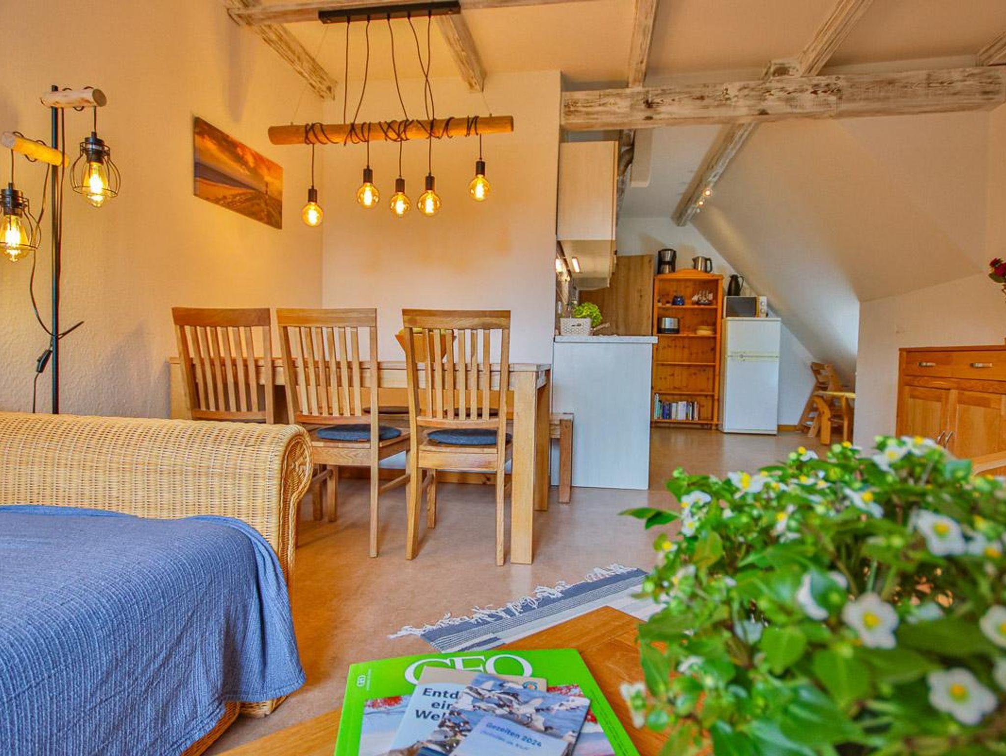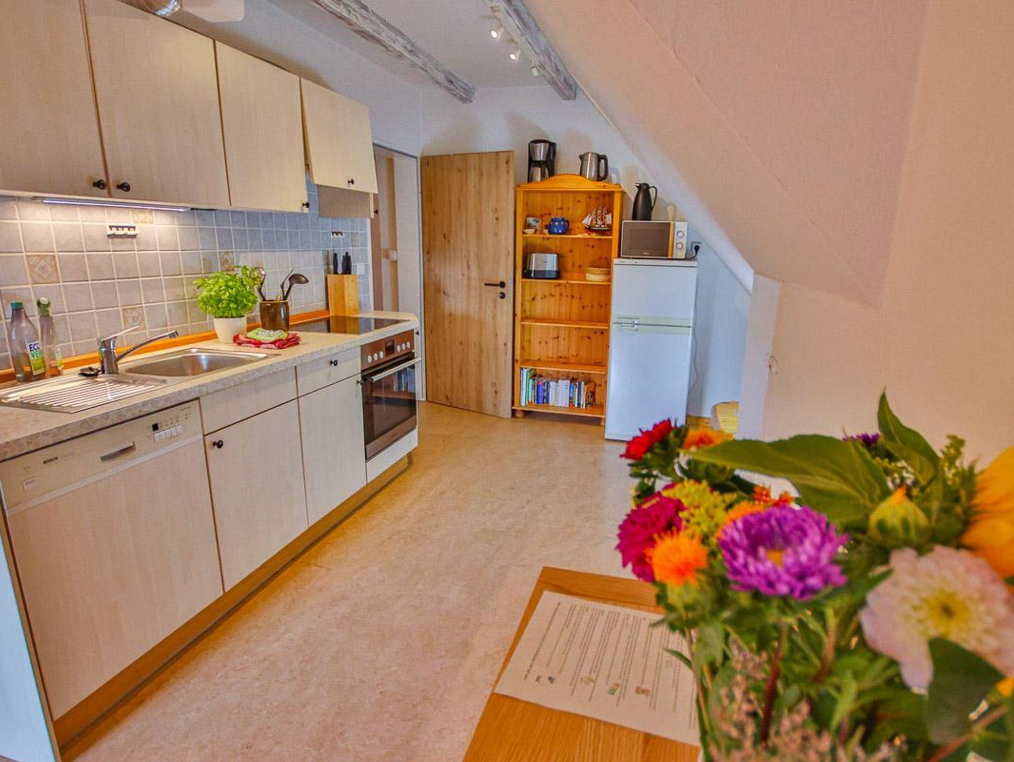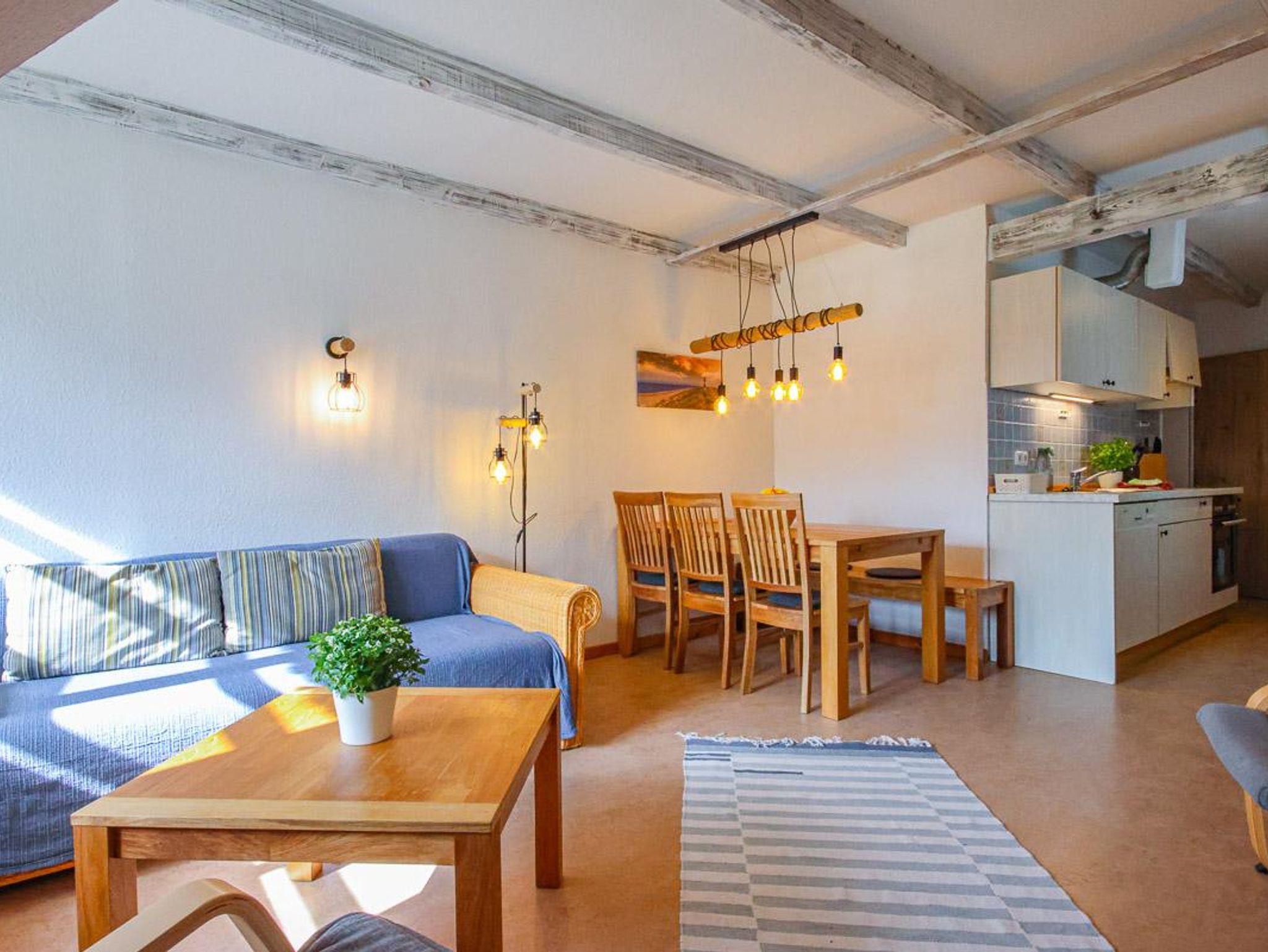 Wohnung im 1. Obergeschoss mit ca. 54 m² und Gartenblick. Geeignet für 4 Personen. Hunde sind in dieser Wohnung nicht erlaubt. Die Nichtraucher-Ferienwohnung ist ausgestattet mit SAT-TV, W-LAN auf Wunsch, Küchenzeile mit 4-Platten-Herd und Backofen, Geschirrspüler, Kühlschrank mit Gefrierfach, Kaffeemaschine, Toaster und Wasserkocher. Badezimmer mit Dusche, WC und Waschbecken. Im separaten Schlafzimmer befinden sich ein Doppelbett. Im Wohnraum kann die Couch zusätzlich als Schlafmöglichkeit verwendet werden. Kinderbett und Hochstuhl sind vorhanden.