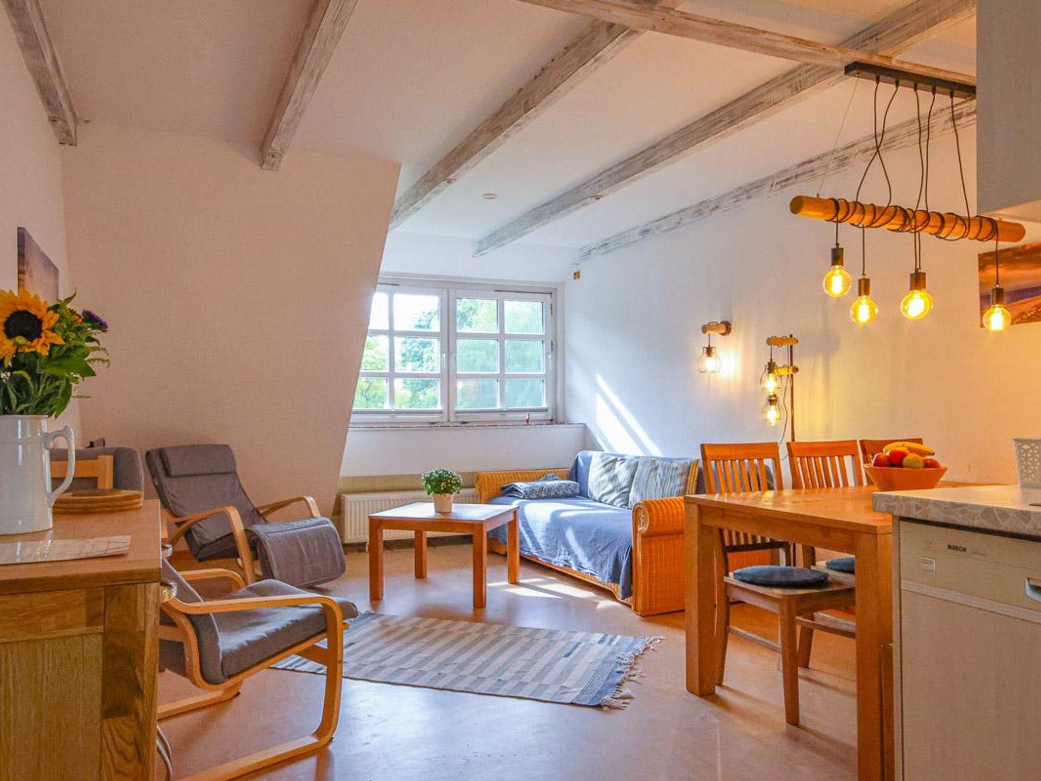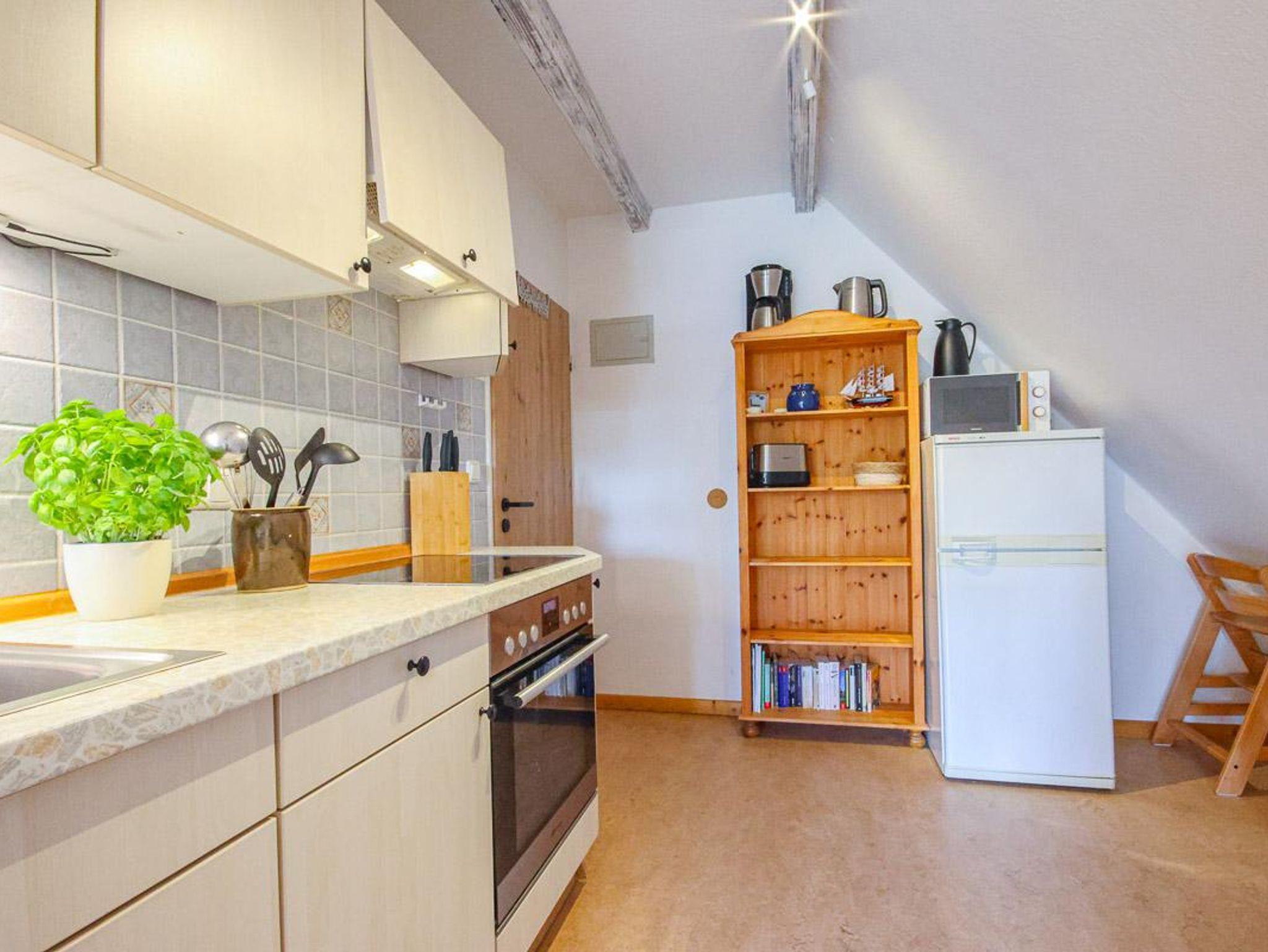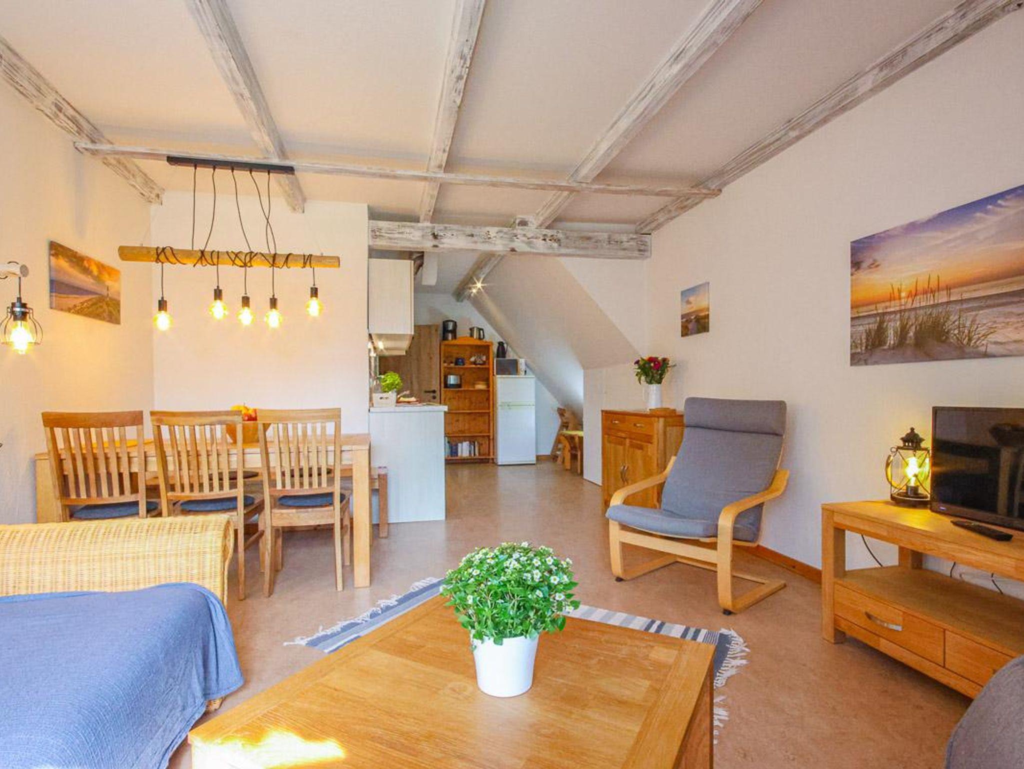 Wohnung im 1. Obergeschoss mit ca. 54 m² und Gartenblick. Geeignet für 4 Personen. Hunde sind in dieser Wohnung nicht erlaubt. Die Nichtraucher-Ferienwohnung ist ausgestattet mit SAT-TV, W-LAN auf Wunsch, Küchenzeile mit 4-Platten-Herd und Backofen, Geschirrspüler, Kühlschrank mit Gefrierfach, Kaffeemaschine, Toaster und Wasserkocher. Badezimmer mit Dusche, WC und Waschbecken. Im separaten Schlafzimmer befinden sich ein Doppelbett. Im Wohnraum kann die Couch zusätzlich als Schlafmöglichkeit verwendet werden. Kinderbett und Hochstuhl sind vorhanden.