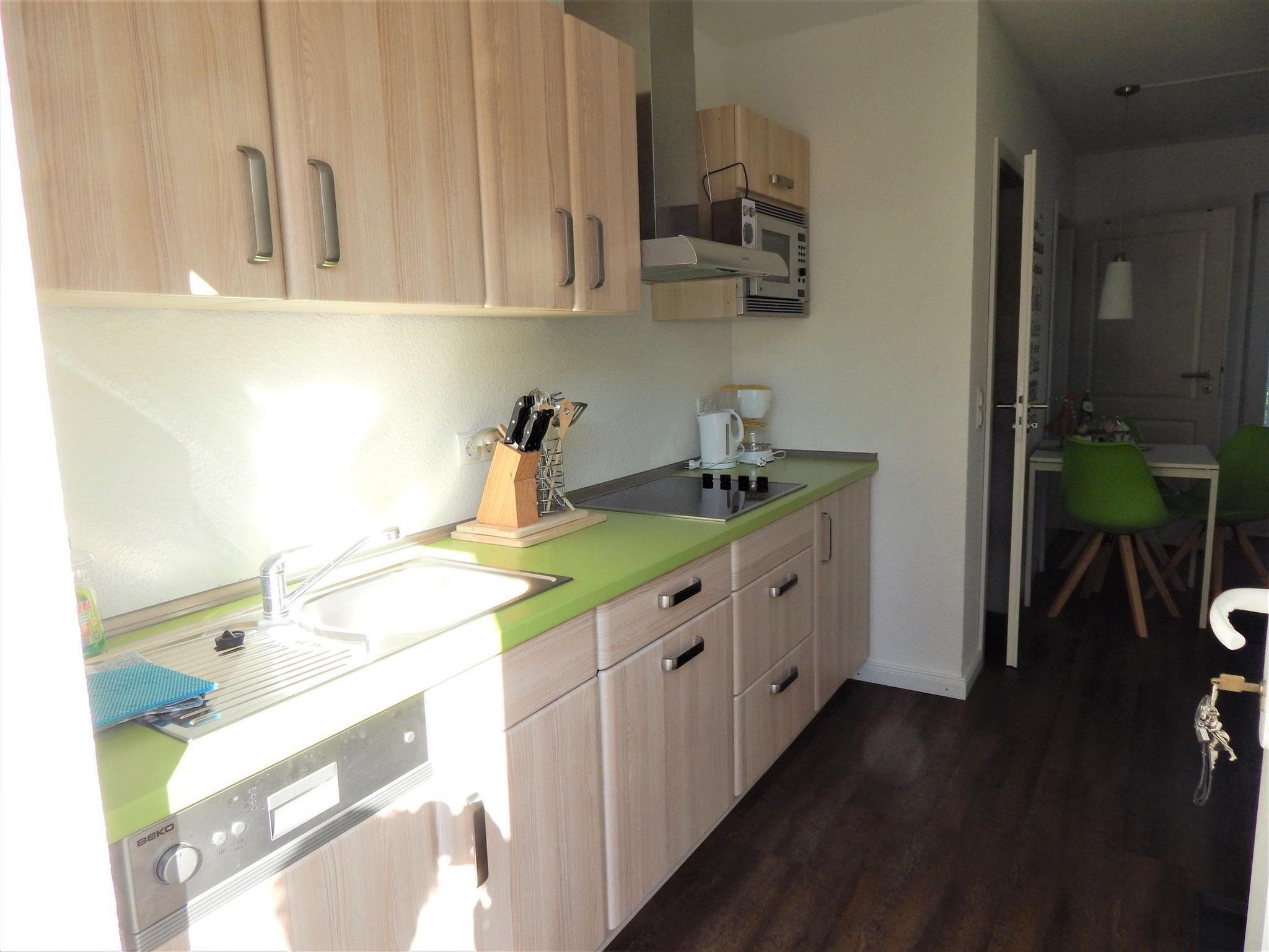 In der vorhandenen Einbauküche laden Herd, Mikrowelle und Geschirrspüler zum Kochen ein.