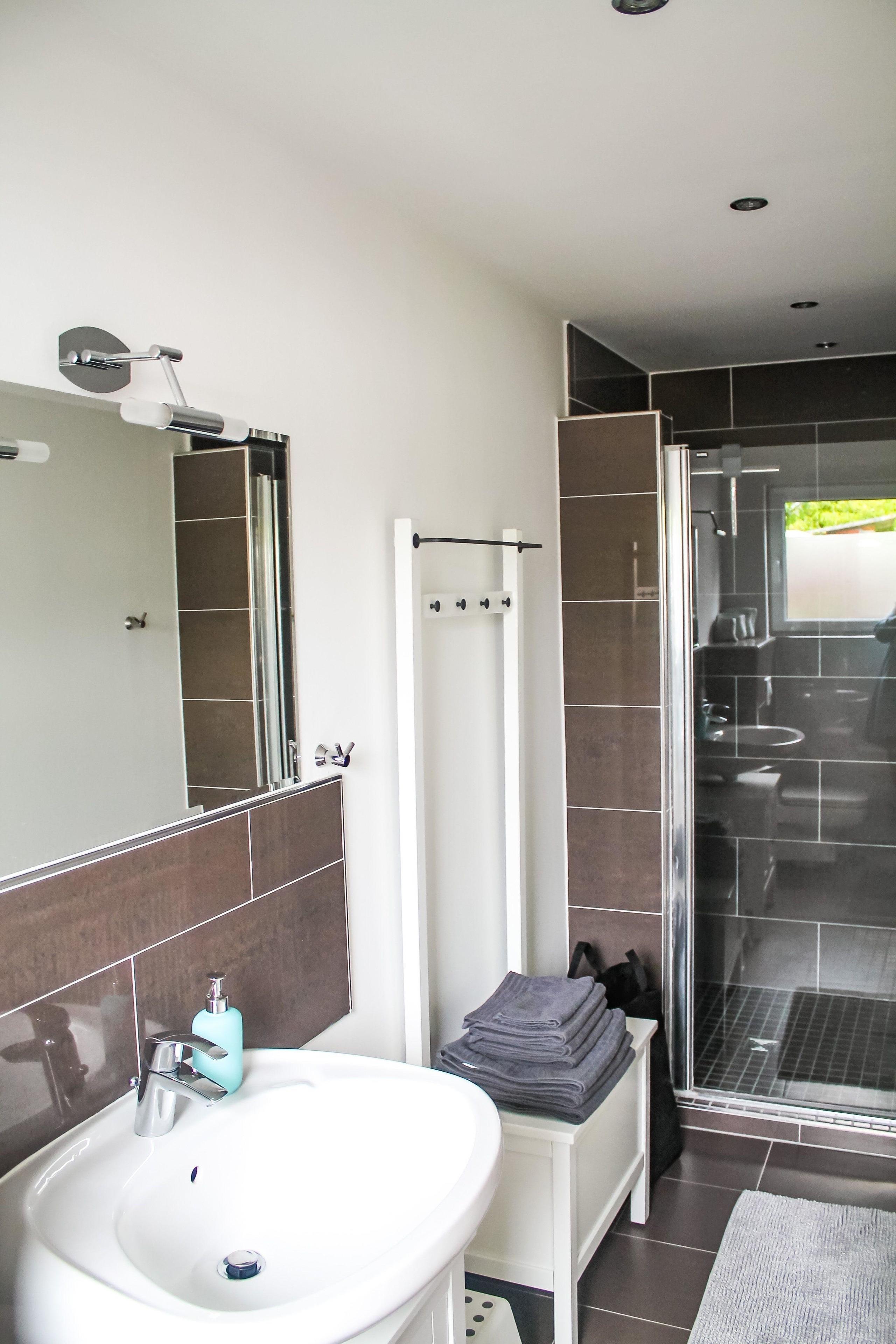 modernes Bad mit ebenerdiger Dusche, Spiegel, Fön