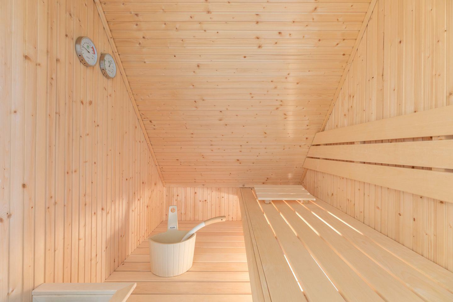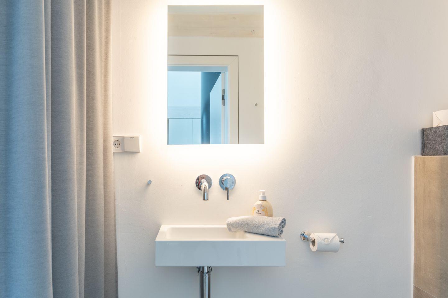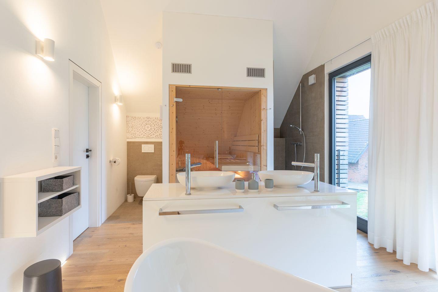 Ein Highlight des Hauses ist das geräumige Badezimmer mit freistehender Badewanne, Dusche, zwei Waschbecken, Sauna und einem überzeugenden Lichtkonzept für schöne Wellnessstunden.