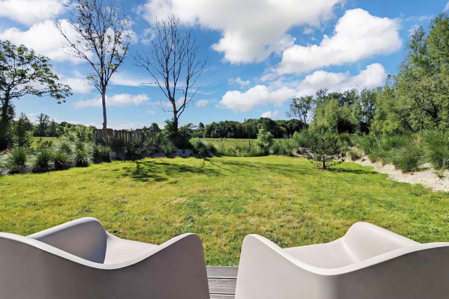 Der Außenbereich sticht zusätzlich hervor durch seinen Garten mit Dünenwall und Holzelementen. Von hier aus genießen Sie den unverbauten und bezaubernden Ausblick über die angrenzenden Weiden. Auf der großzügigen Terrasse stehen Ihnen Gartenmöbel zur Verfügung.