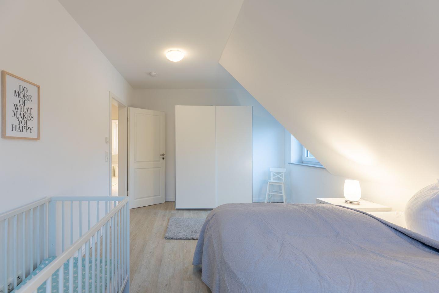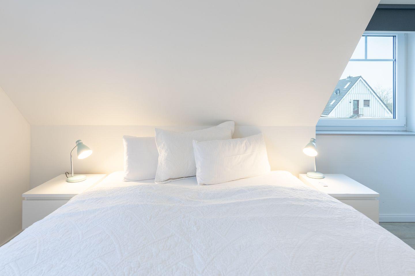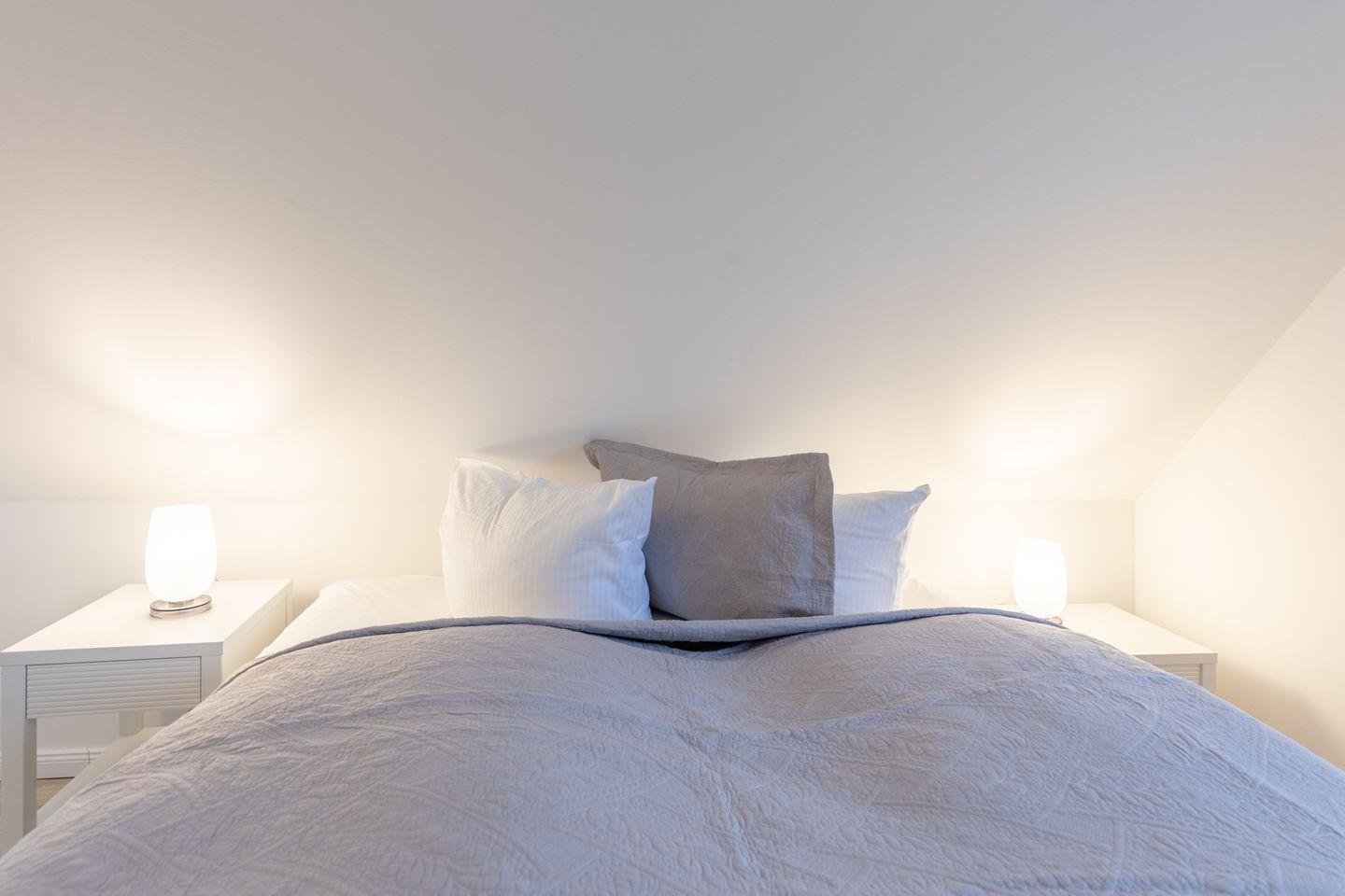 Über eine schöne Holztreppe gelangen Sie ins Obergeschoss mit drei Schlafzimmern: Zwei Schlafzimmer sind mit hochwertigen bequemen Doppelbetten (je 180 x 200) ausgestattet und ein weiteres mit zwei Einzelbetten. Das große Bad mit Fenster im Obergeschoss begeistert mit einer ebenerdigen Dusche, Wanne und Handtuchheizung.