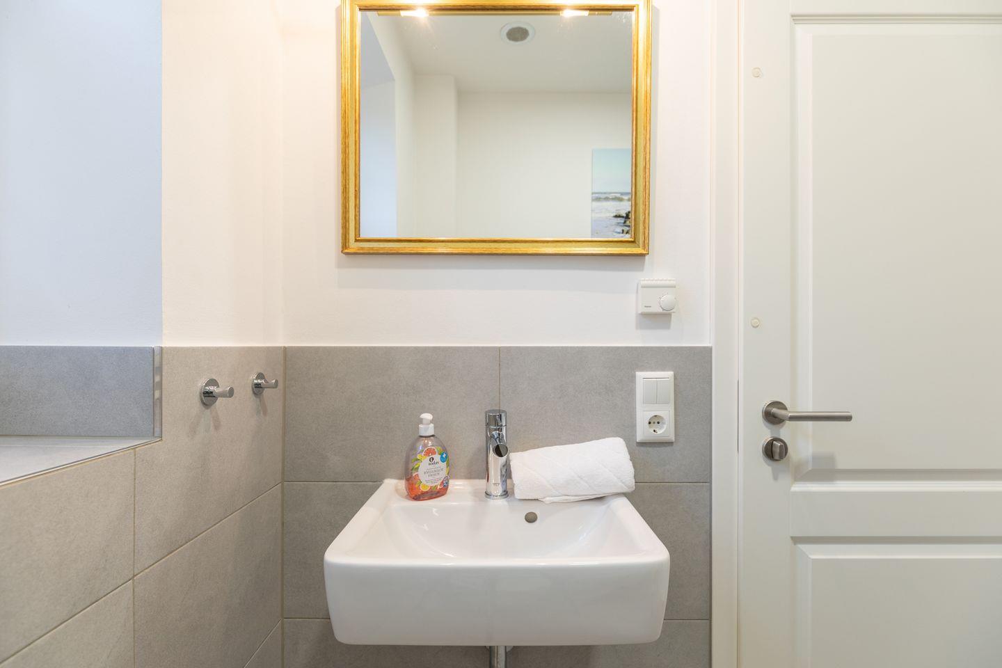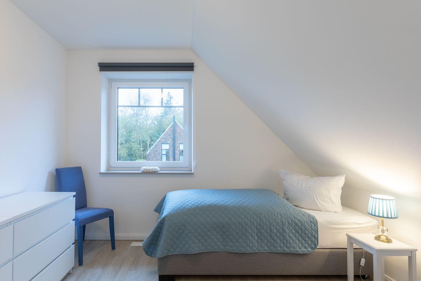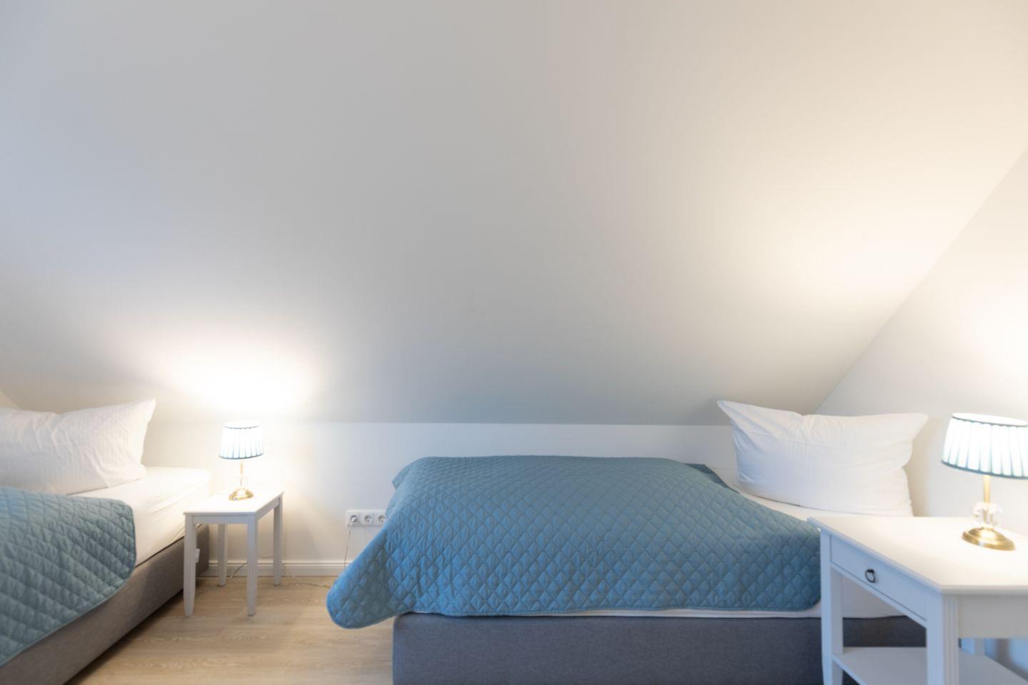 Über eine schöne Holztreppe gelangen Sie ins Obergeschoss mit drei Schlafzimmern: Zwei Schlafzimmer sind mit hochwertigen bequemen Doppelbetten (je 180 x 200) ausgestattet und ein weiteres mit zwei Einzelbetten. Das große Bad mit Fenster im Obergeschoss begeistert mit einer ebenerdigen Dusche, Wanne und Handtuchheizung.