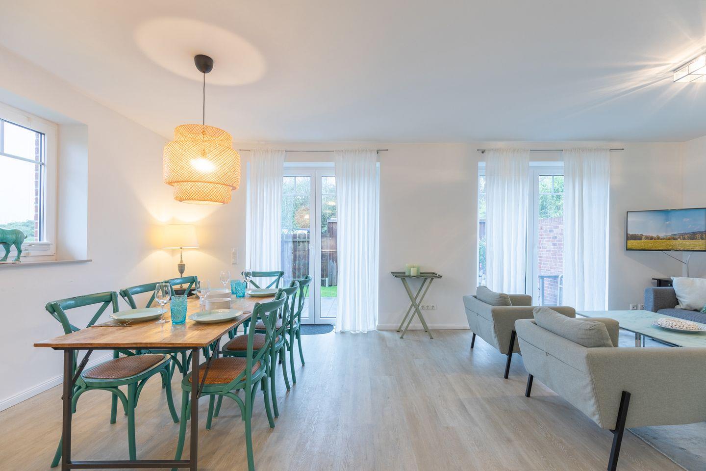 Im Wohnbereich entspannen Sie sich auf dem großen 3er Sofa und zwei weiteren Sesseln bei einem Film. Fernseher und Internet stehen Ihnen kostenlos zur Verfügung. Am Esstisch ist ausreichend Platz für eine größere Familie.