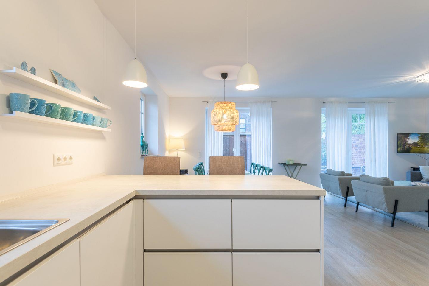 Die moderne, offene Küche ist umfangreich ausgestattet, so dass die ganze Familie spielend leicht versorgt ist. Ein angrenzender Tresen mit Barhockern bildet den Übergang zum Essbereich. Ein Duschbad im Erdgeschoss und ein Hauswirtschaftsraum mit Waschmaschine und Trockner runden das Bild ab.