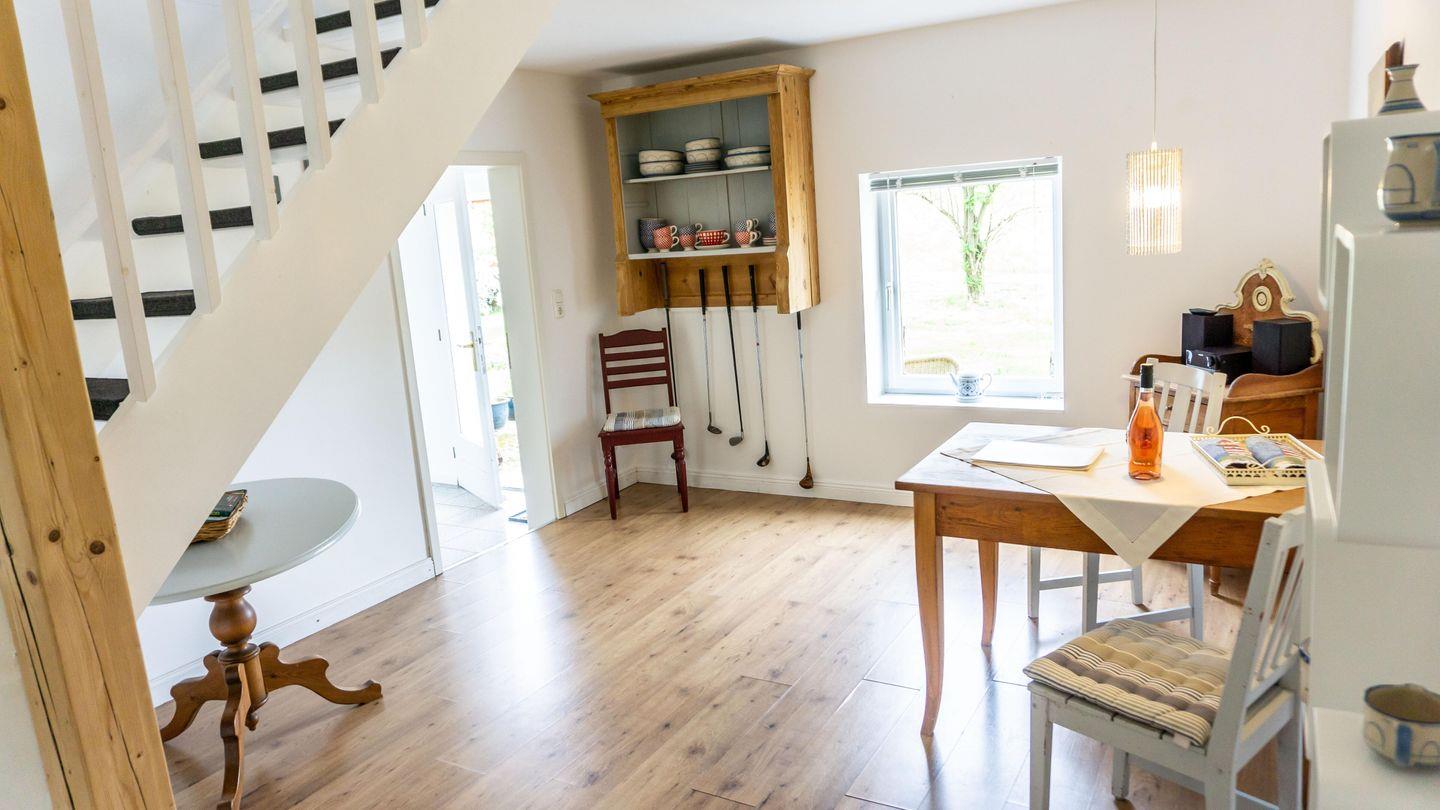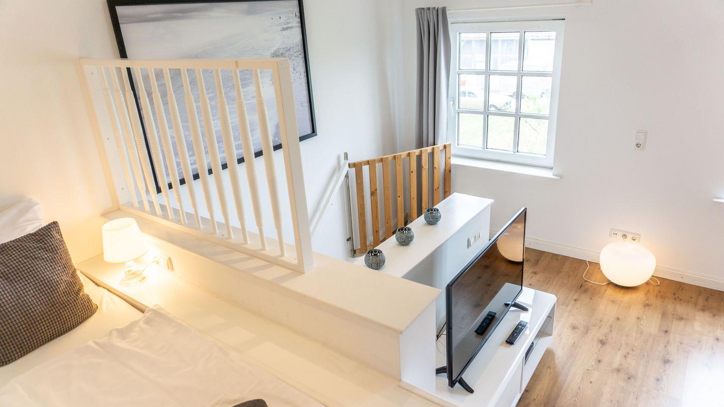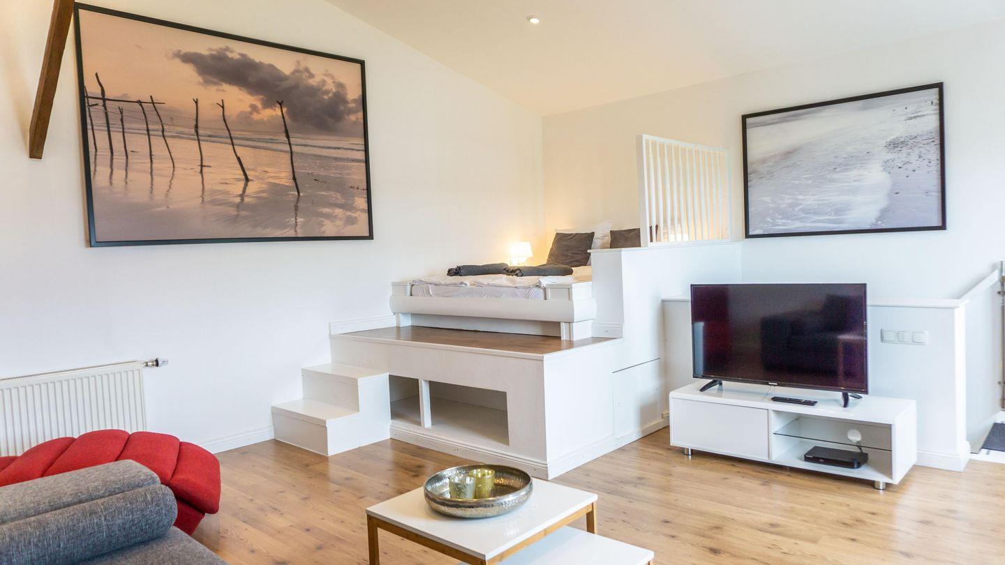Die Unterkunft ist in einem hellen und freundlichen Stil gestaltet und verfügt über ein Esszimmer und einer vollständig ausgestatteten Küche. Die Küche ist mit 2 Kochplatten,, Backofen, Kühlschrank, Toaster, Wasserkocher, Mikrowelle und einer Kaffeemaschine ausgestattet. Sie finden hier alle notwendigen Küchenutensilien, sodass Sie sich wie zu Hause fühlen können.Der Wohnbereich im 1. OG hat auf einer Empore das Doppelbett ( 180cm x200 cm) integriert. Er bietet eine gemütliche Sofaecke, ideal für entspannte Abende mit Blick auf den Fernseher.