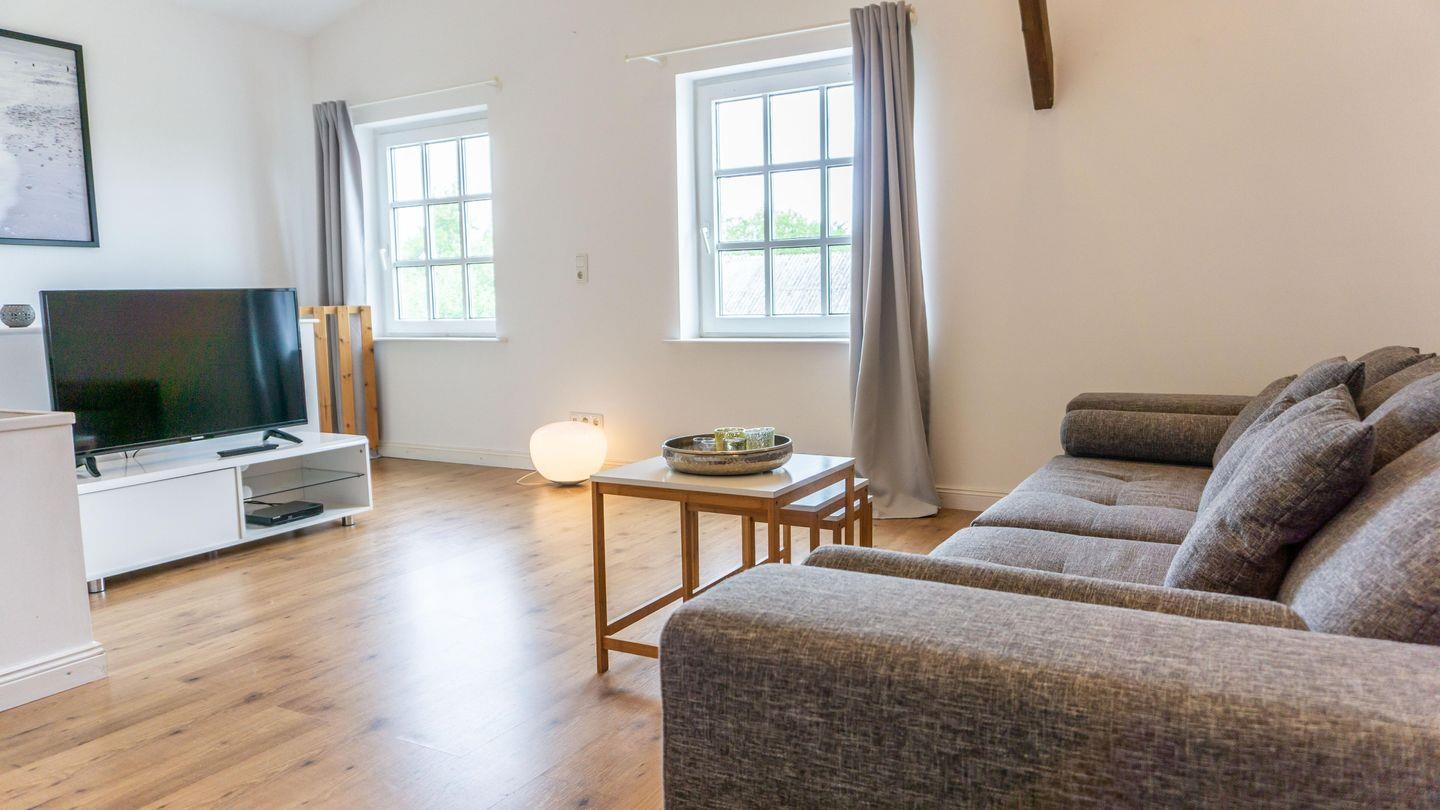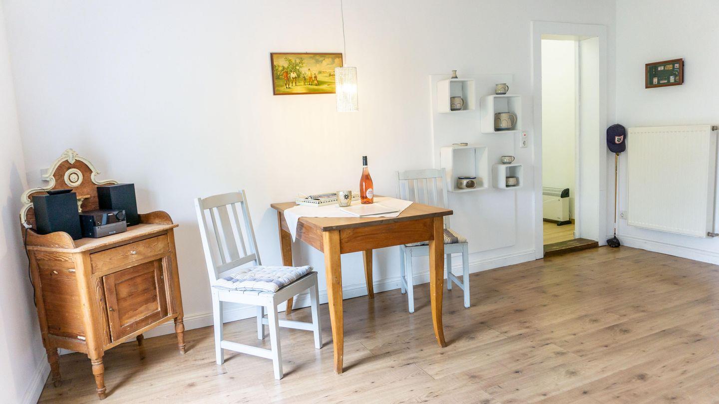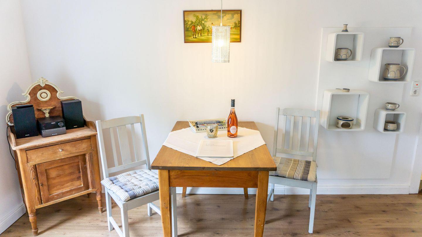 Die Unterkunft ist in einem hellen und freundlichen Stil gestaltet und verfügt über ein Esszimmer und einer vollständig ausgestatteten Küche. Die Küche ist mit 2 Kochplatten,, Backofen, Kühlschrank, Toaster, Wasserkocher, Mikrowelle und einer Kaffeemaschine ausgestattet. Sie finden hier alle notwendigen Küchenutensilien, sodass Sie sich wie zu Hause fühlen können.Der Wohnbereich im 1. OG hat auf einer Empore das Doppelbett ( 180cm x200 cm) integriert. Er bietet eine gemütliche Sofaecke, ideal für entspannte Abende mit Blick auf den Fernseher.