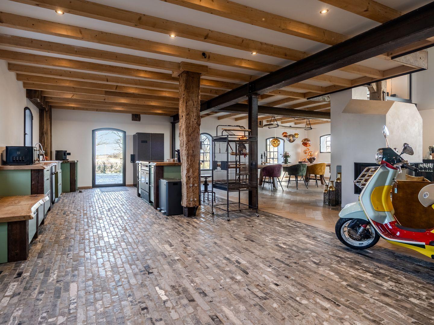Der einmalige Wohnbereich als Loft im Parterre ist als offenes Konzept gestaltet: Die Küche ist offen zum Wohnzimmer und Essbereich angelegt. Parkett als Bodenbelag in Wohn- und Schlafzimmern sorgt für ein stimmiges, gepflegtes Ambiente, während Fußbodenheizung und Heizung insgesamt auch in kühleren Jahreszeiten angenehmen Wohnkomfort bieten. Für entspannte Stunden stehen eine Sofaecke mit Sofa, TV sowie eine HiFi-Anlage bereit; insgesamt sind 5 TVs (44–55 Zoll) vorhanden und somit auch in jedem Schlafzimmer. Ein Kaminofen ergänzt das Wohngefühl an ruhigeren Abenden. WLAN ist verfügbar aber aufgrund der etwas ländlichen Lage langsam.