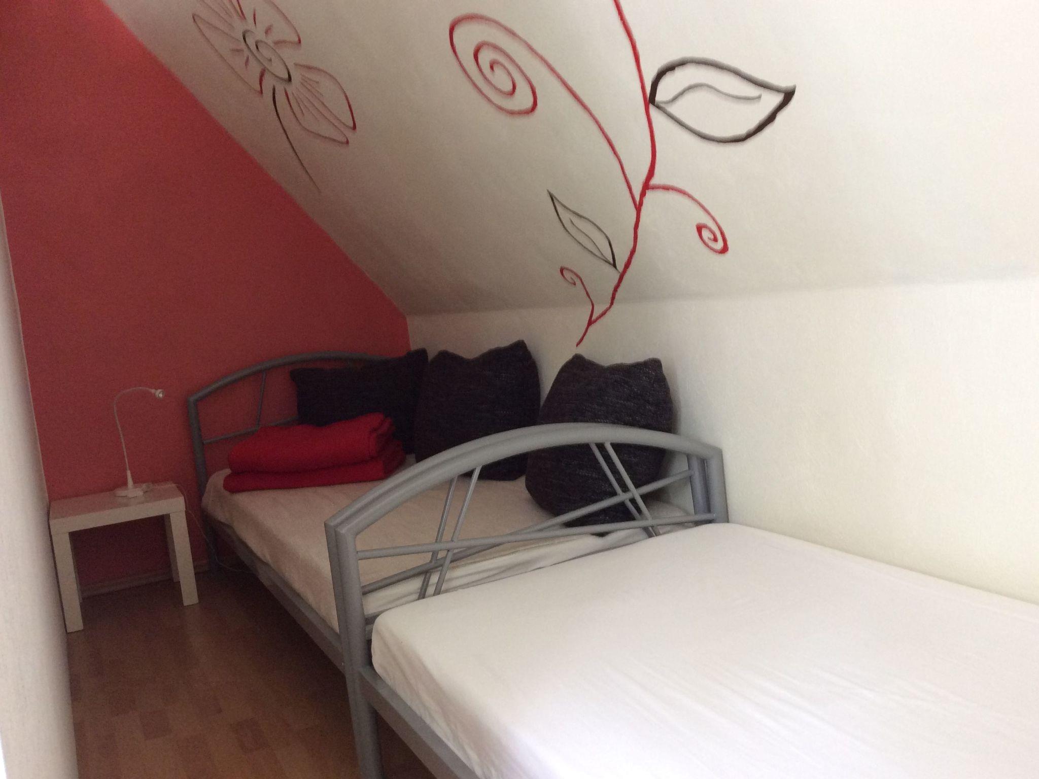 With a living space of approx. 85 m², this accommodation offers enough space for a maximum of six people. The living room has a cosy sofa, a coffee table and a flat-screen TV. A children's painting corner, a children's play corner and two single beds (0.90 metres wide) behind a partition. The kitchen is fully equipped with an oven, fridge, hob, dishwasher, toaster, kettle, egg boiler, fully automatic coffee machine and a dining table with four chairs (two additional chairs are also available in the flat) so that you can start a relaxing holiday. In the bedroom there is a double bed (2 metres wide) and a large wardrobe. Behind the next door you will find another bedroom with two beds facing each other and shelves for your clothes. The bathroom features a walk-in shower, two washbasins, a WC and a hairdryer. The landlord will be happy to provide you with a highchair and a cot/baby bed free of charge on request. There is heating in all rooms of the flat and WLAN is also available throughout the flat free of charge.