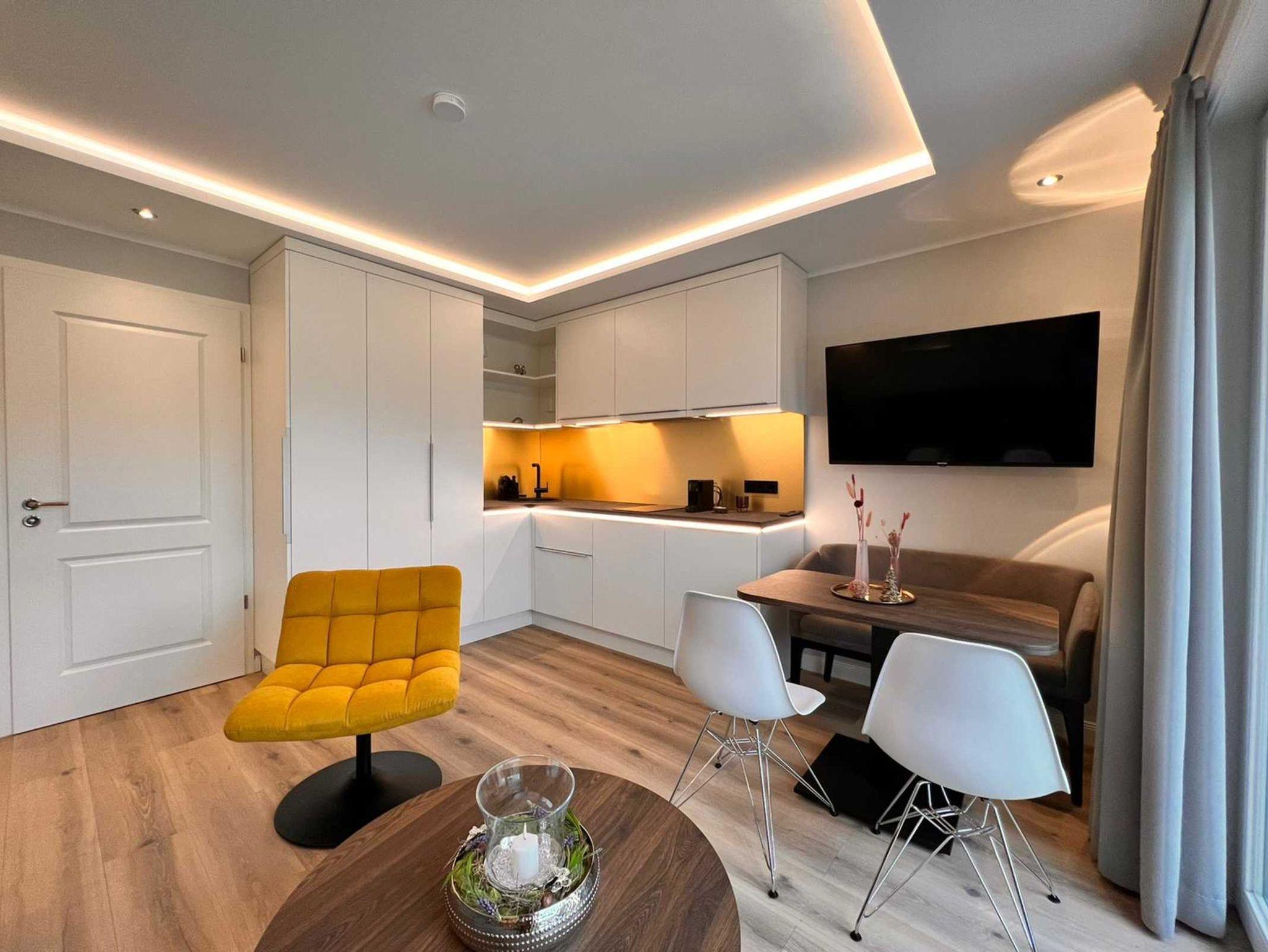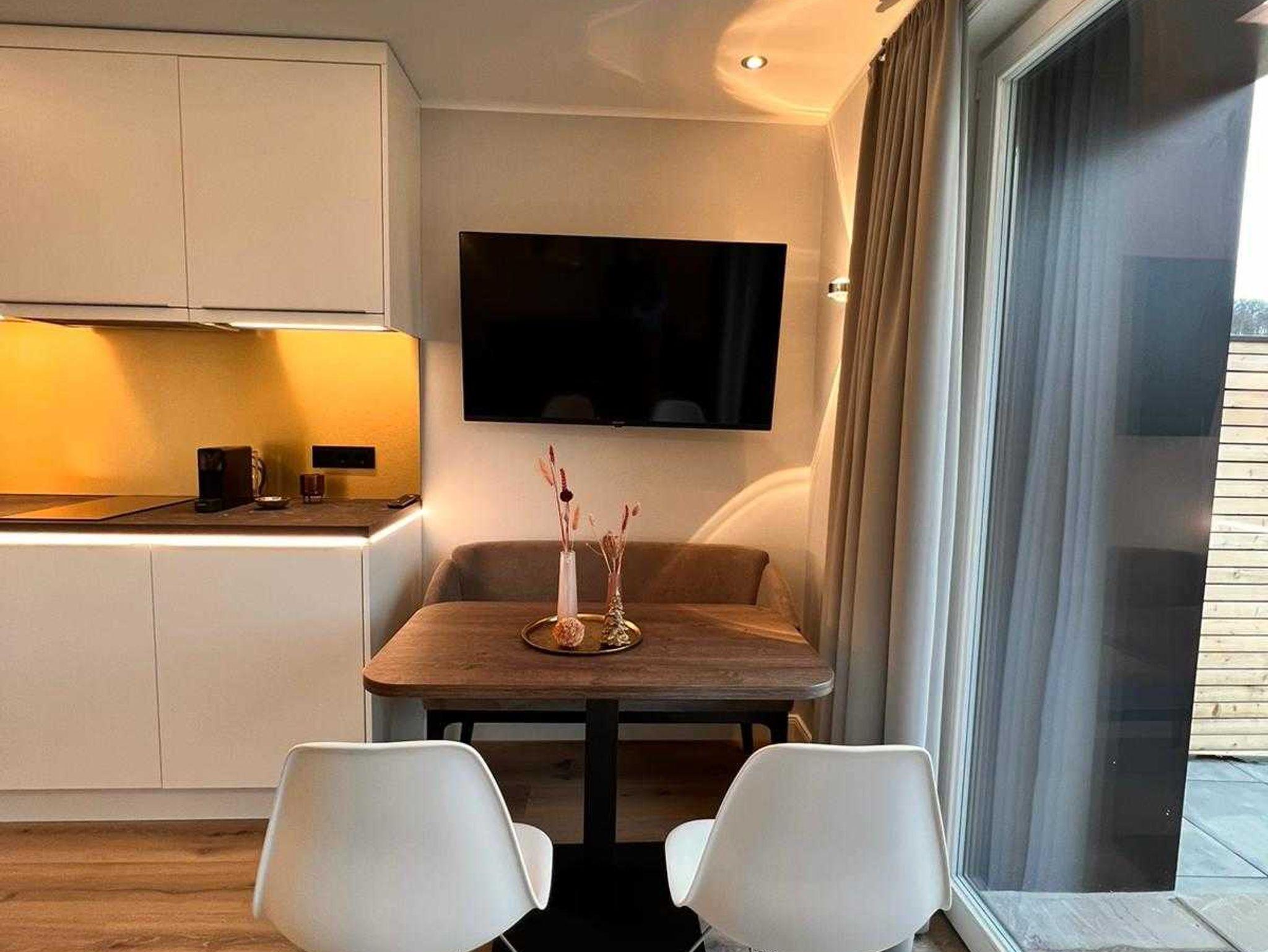 Hier steht Ihnen ein stilvoll eingerichtetes ca. 32 qm großes Hotel-Apartment mit Klimaanlage und Fußbodenheizung in unserem 4 Sterne Hotel zur Verfügung. Das Apartment teilt sich auf in 2 Räume. Der erste Raum ist der Wohn-/Essbereich mit offener Küche. Die Küche ist voll ausgestattet mit Herd, Spülmaschine, Kühlschrank, Mikrowelle, Kaffeemaschine, Geschirr usw. An die Küche grenzt der Tisch mit Sitzbank und 2 weiteren Stühlen an. Weiterhin finden Sie ein gemütliches Sofa mit Tisch und einem Sessel. Das Sofa ist ein Schlafsofa in Bettqualität, denn es verfügt über eine Matratze und ein Lattenrost, so dass man die Nacht darauf sehr gut verbringen kann. Ein Fernseher ist natürlich auch vorhanden. Der Wohnbereich ist aufgrund großer Fernsterflächen lichtdurchflutet. Abends kann der Wohnbereich durch blickdichte und lichundurchlässige Gardinen verdunkelt werden. Vom Wohnbereich gelangen Sie direkt auf die eigene großzügige Sonnenterrasse mit einem herrlichen Blick in den Park und aufs Naturschutzgebiet. Aufgrund der Südausrichtung haben Sie bis abends Sonne. Vom Wohnbereich gelangen Sie zudem in den 2. Raum, der als Schlafzimmer mit abgetrenntem, aber offenem Badezimmer konzipiert ist. Das Schlafzimmer ist mit einem Doppelbett ausgestattet und verfügt ebenfalls über einen Fernseher. Die Fenster können mit blickdichten und lichundurchlässigen Plissees ebenfalls verdunkelt werden.