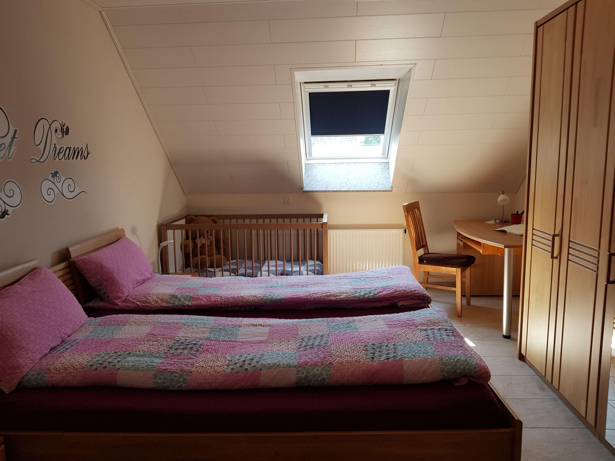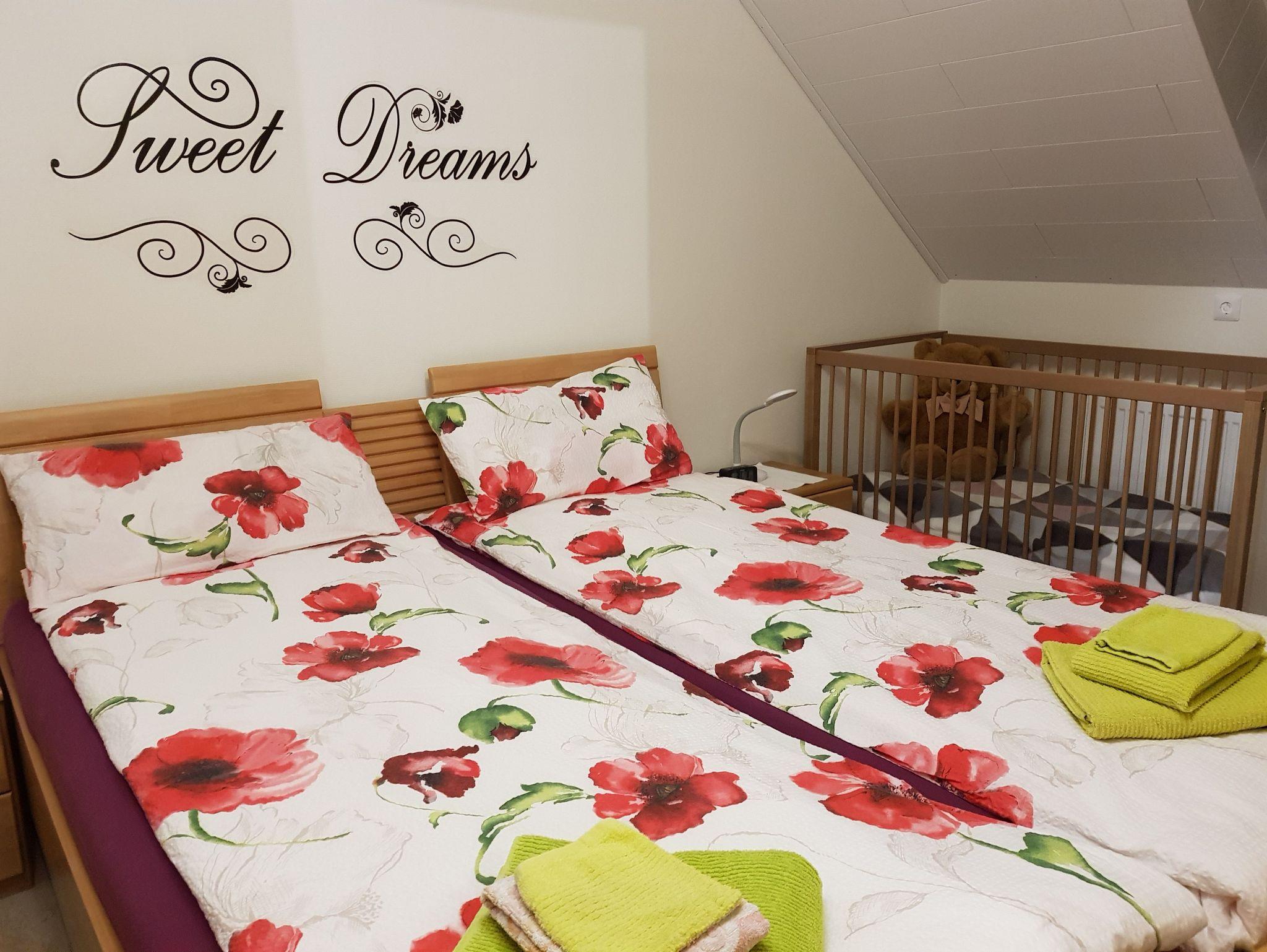 Sweet Dreams versprechen das helle Schlafzimmer. Es verfügt über ein Doppelbett, Kinderbett und viel Stauraum im Kleiderschrank. In einem weiteren Schlafraum befinden sich weitere 2 Betten und ein Schrank.