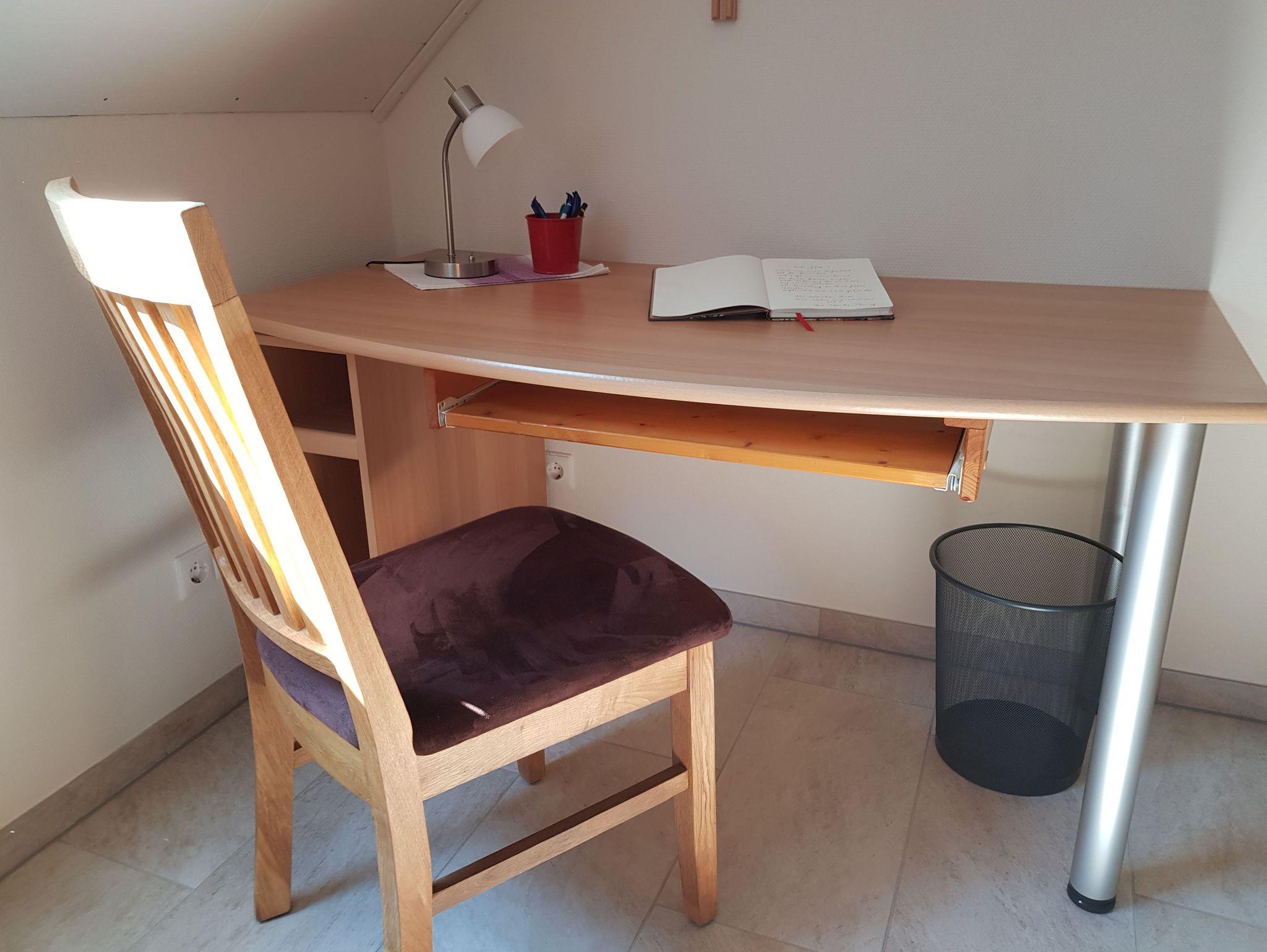 Decken, Schreibtisch mit Schreibutensilien, Sitzgelegenheit, Wecker, Ganzkörperspiegel