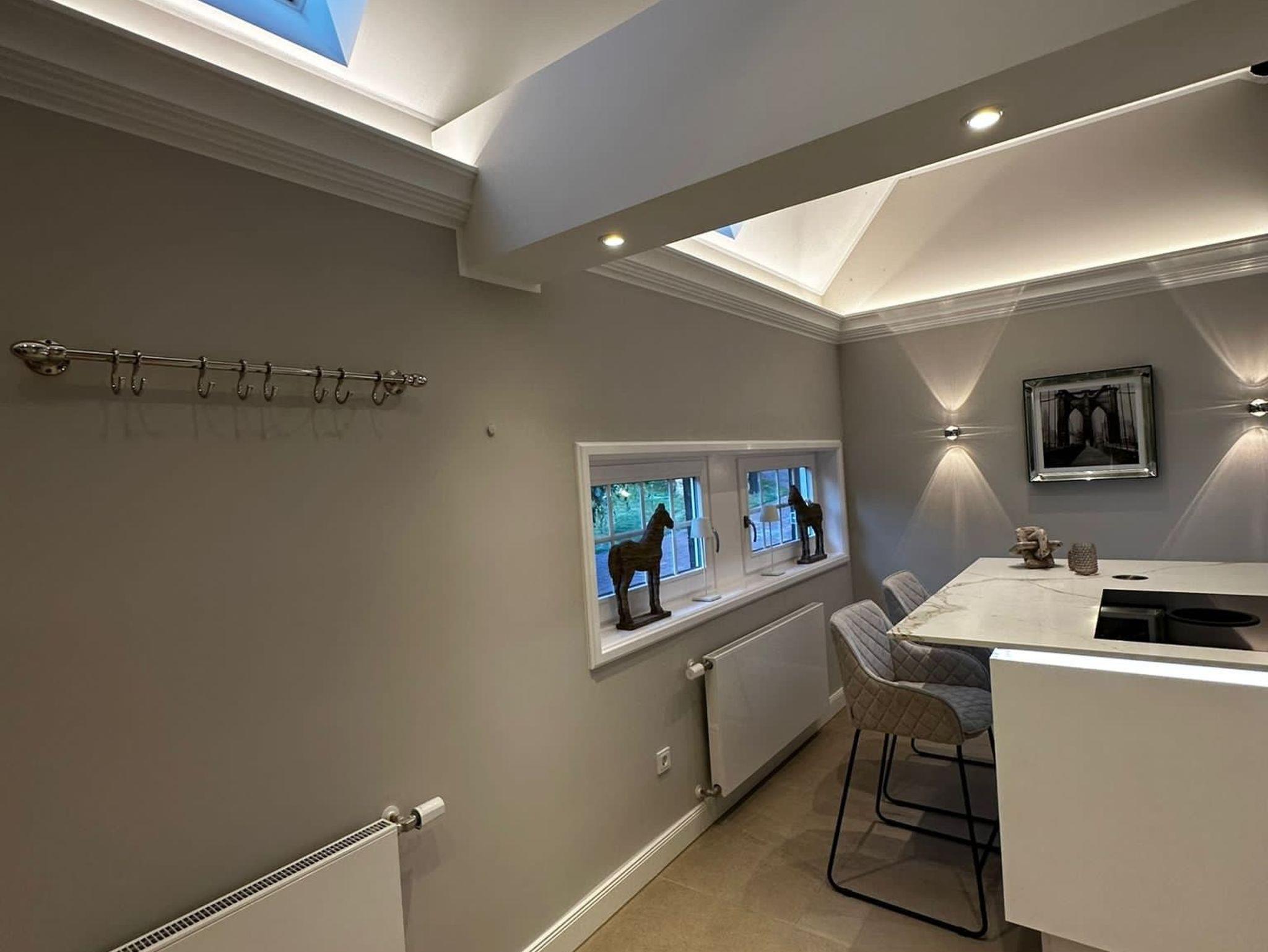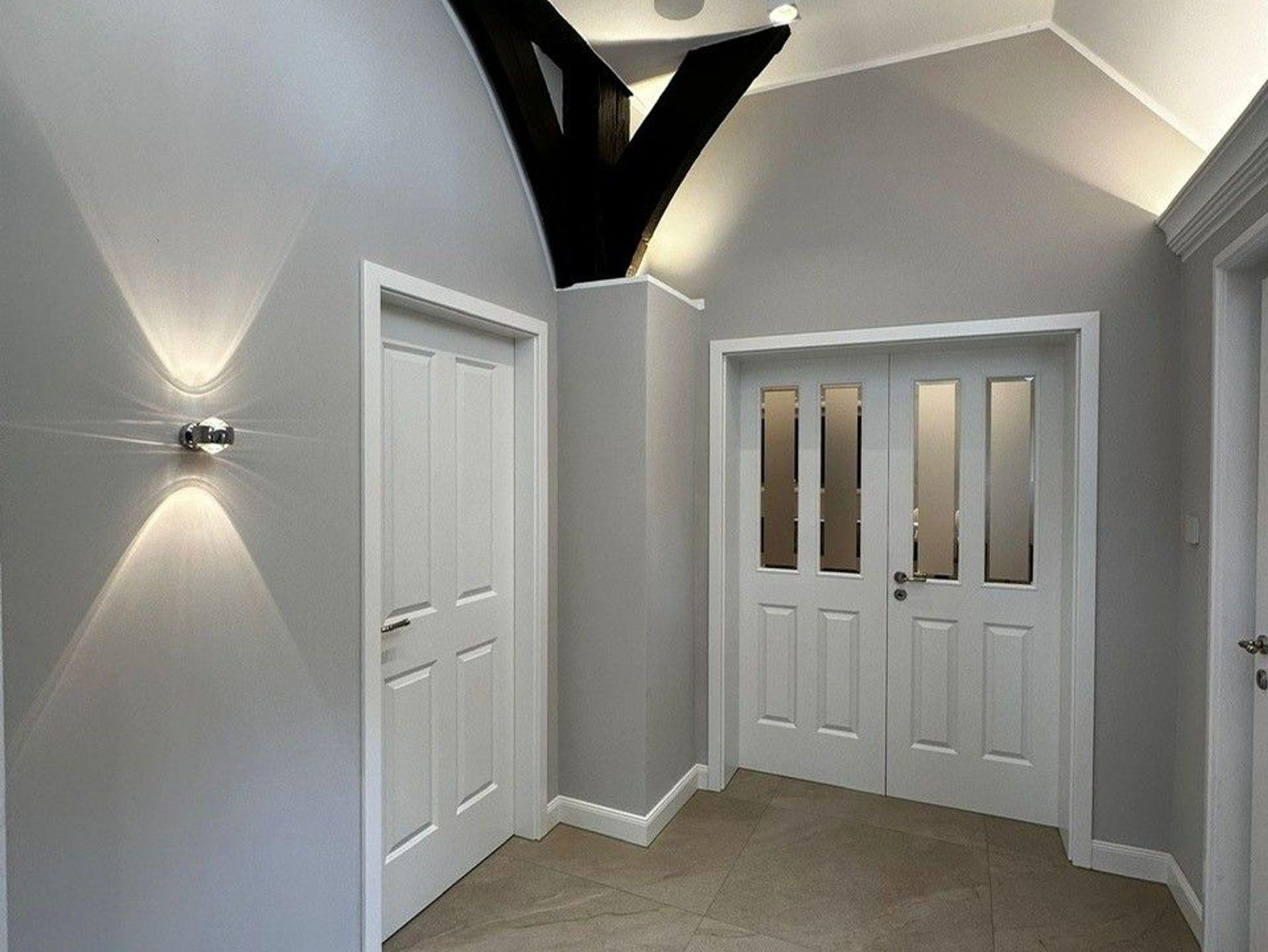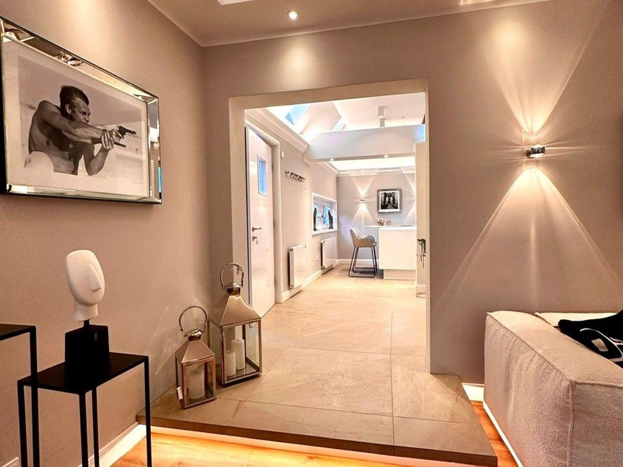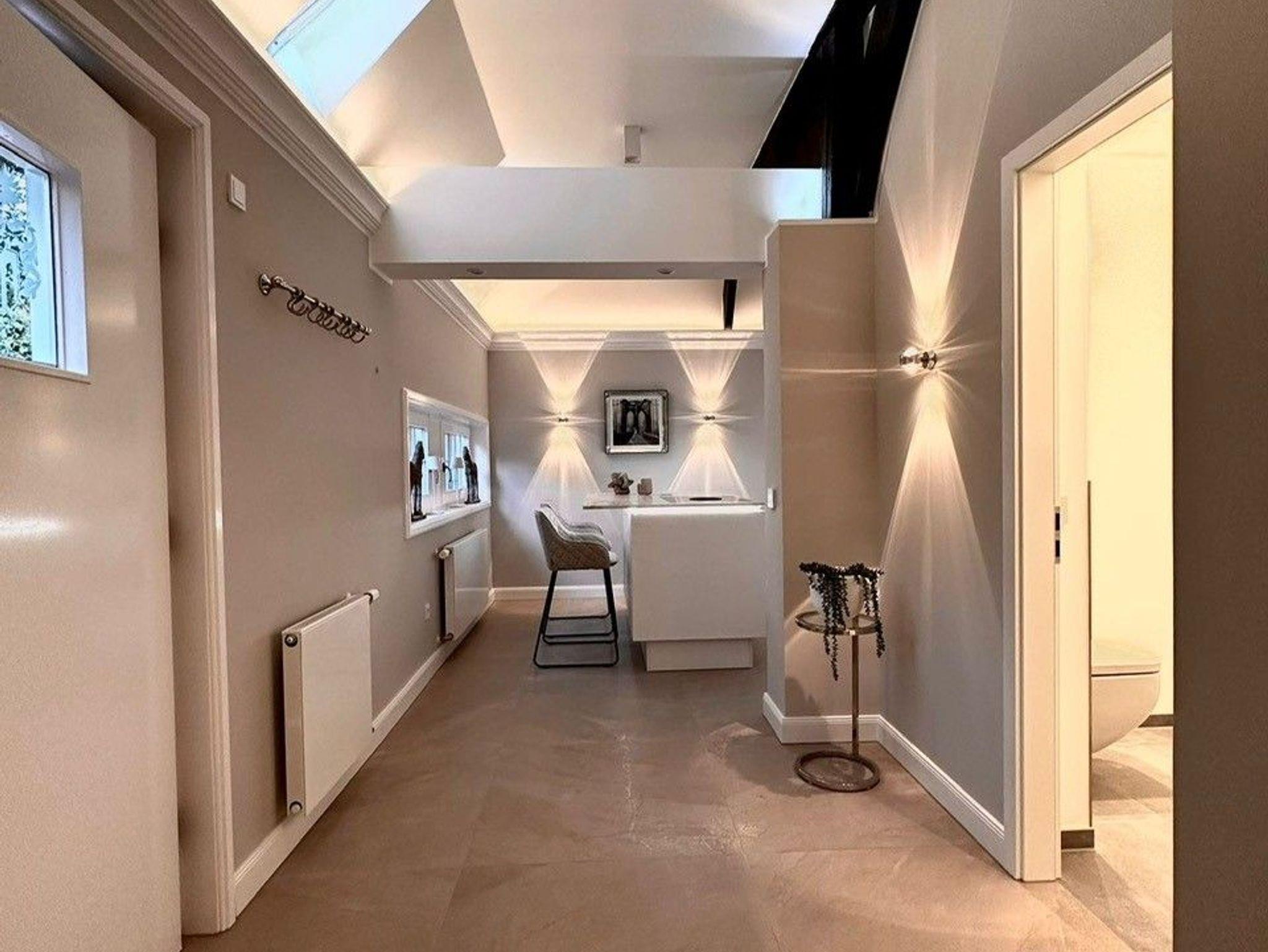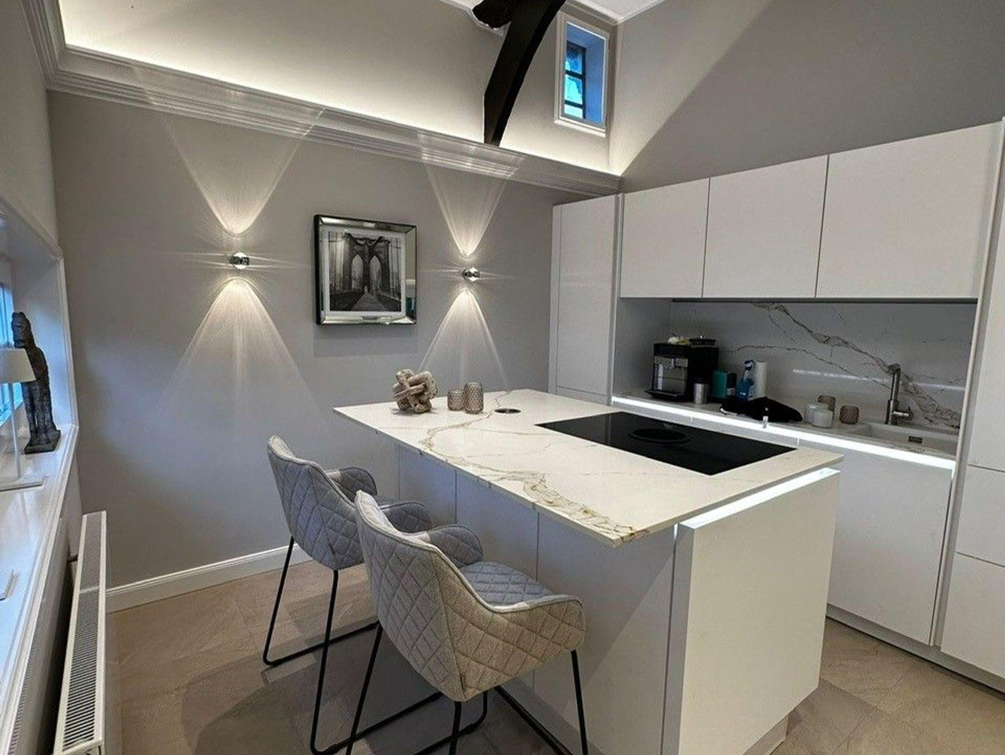 Die Suite ist in 2022 vollständig renoviert und mit exclusiven Möbel ausgestattet worden. Die Suite verfügt über einen eigenen Hauseingang mit elektronischem Zugangssystem. Betritt man die Suite gelangt man in den offenen Eingangsbereich mit helllen Fliesen, hohen Decken und Fachwerkelemente. Man hat einen direkten Blick auf die wunderschöne helle Küche mit Kochinsel und Stühlen zum Verweilen. Die Küche verfügt über einen Kaffeevollautomaten, der mit frischen Bohnen gefüllt ist. Einem wunderbaren Kaffee, Espresso oder Milchkaffee steht damit nichts im Wege.