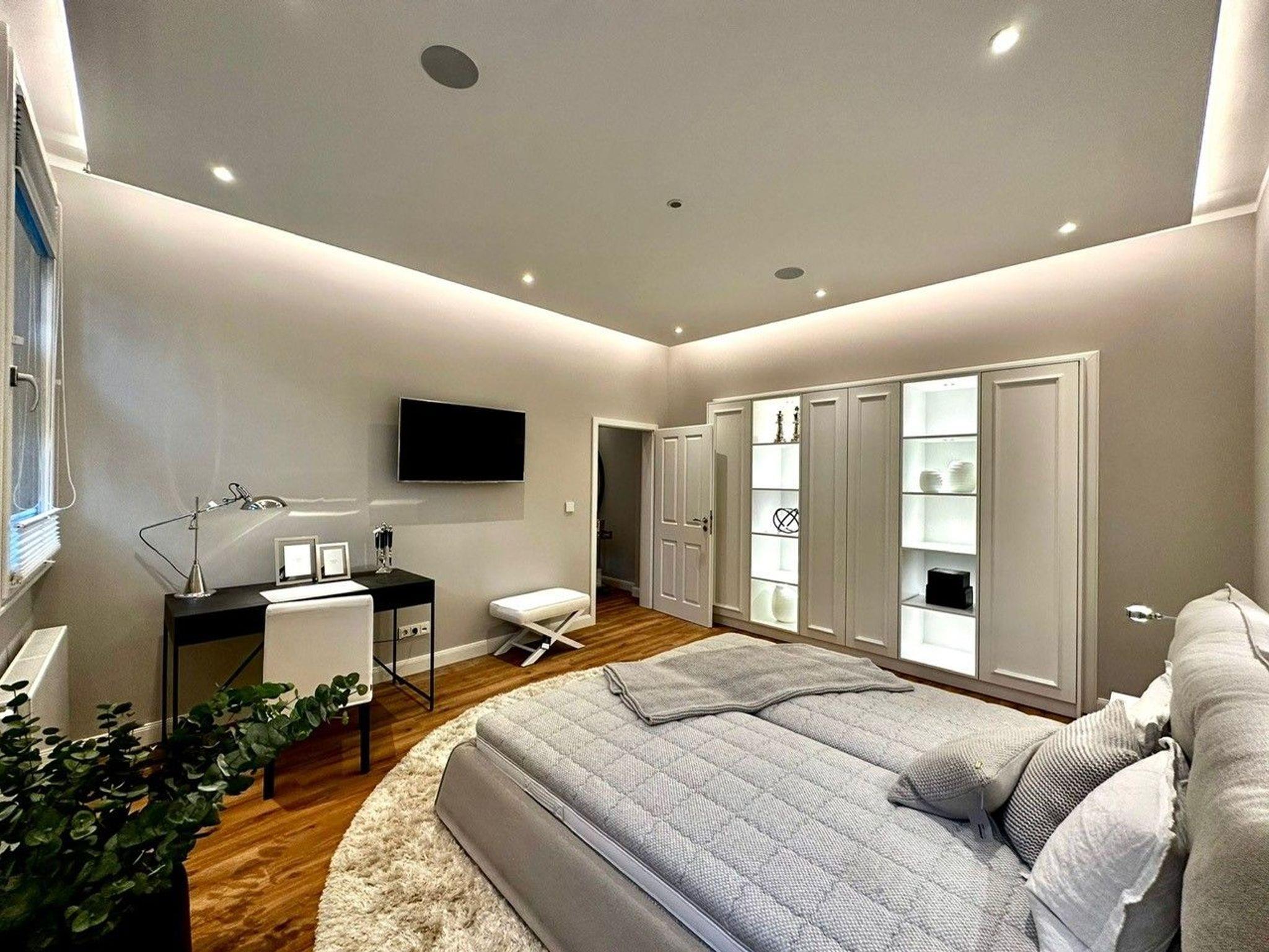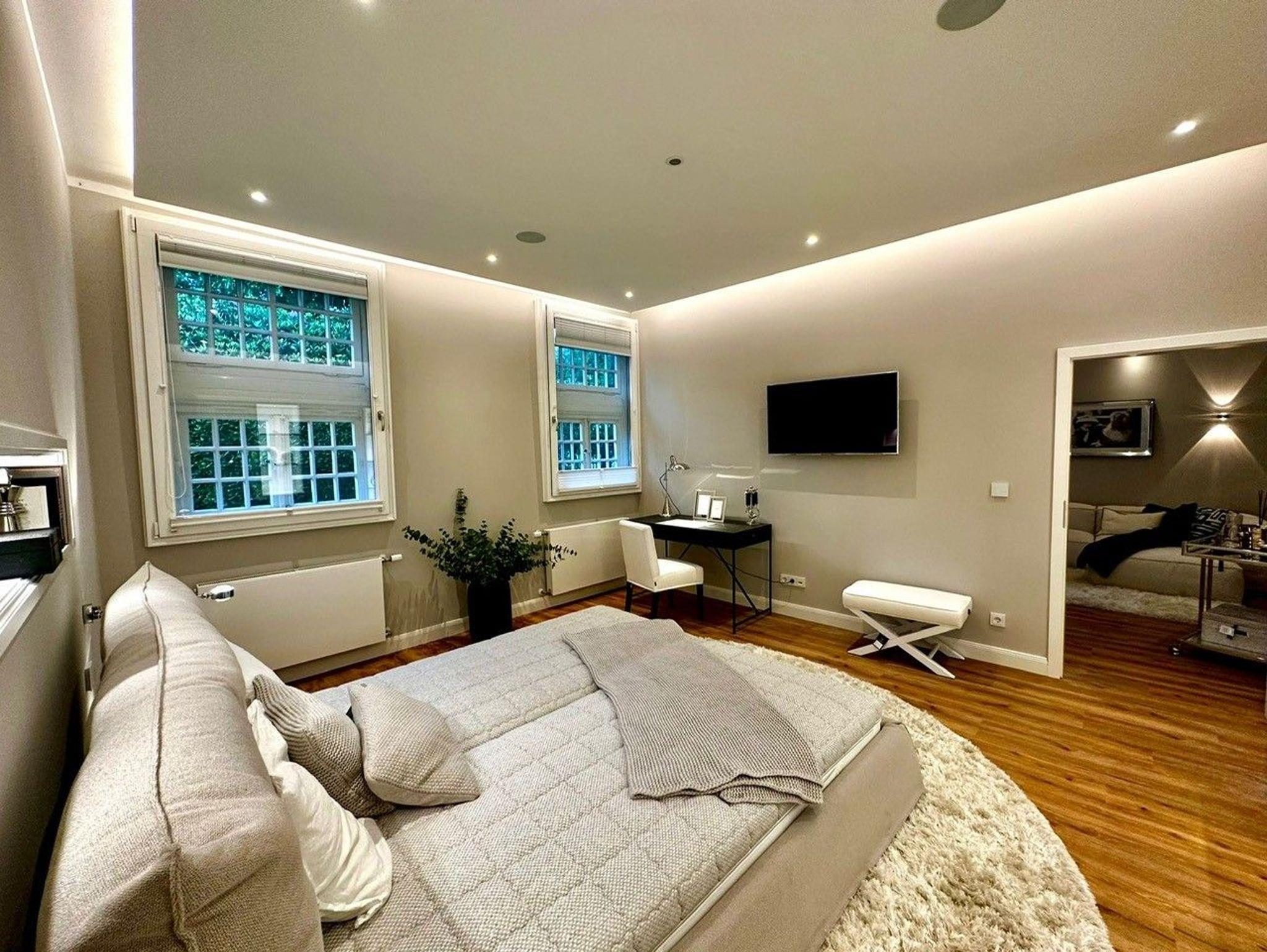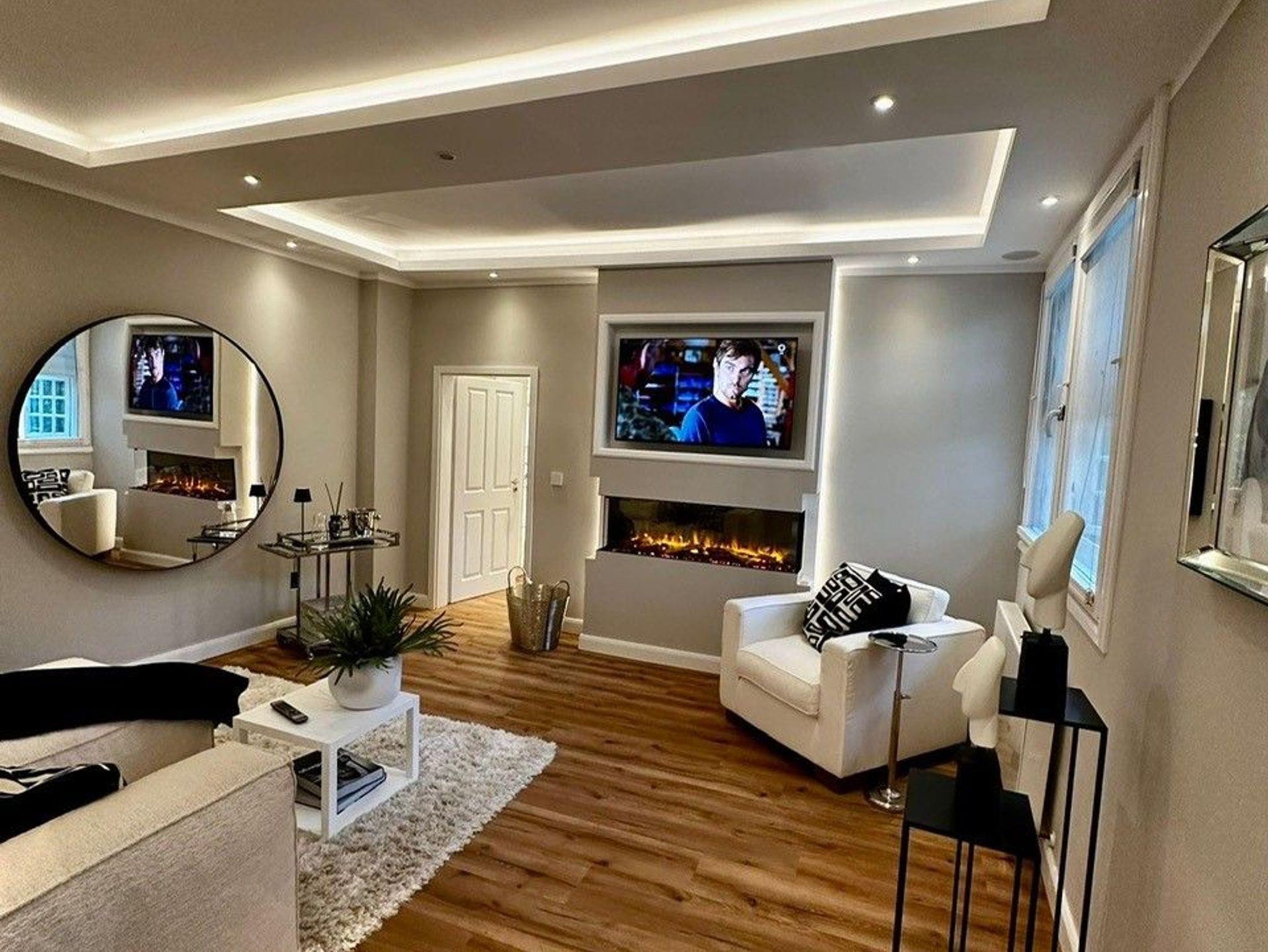 Vom Flurbereich gelange Sie durch eine Doppelflügeltür, die auch komplett offen stehen kann, in das gemütliche Wohnzimmer mit einem luxuriosen Elektrokamin für behagliche und gemütliche Abende. Ein helles bequemes Sofa lädt zu entspannten Momenten ein. Natürlich verfügt das Wohnzimmer über einen großen Flat-TV, der in das WLAN eingebunden ist, so dass man seine Lieblingsserien und Filme mit den entsprechenden Anbietern streamen kann (eigener Zugang ist notwendig). Vom Wohnzimmer gelangt man in das schöne Schlafzimmer, dass mit hellen Möbel und einem gemütlichen Doppelbett mit separaten Matratzen eingerichtet ist. Ein kleiner Schreibtisch ermöglicht ein Arbeiten im Homeoffice. Die Schränke bieten sehr viel Stauraum.
