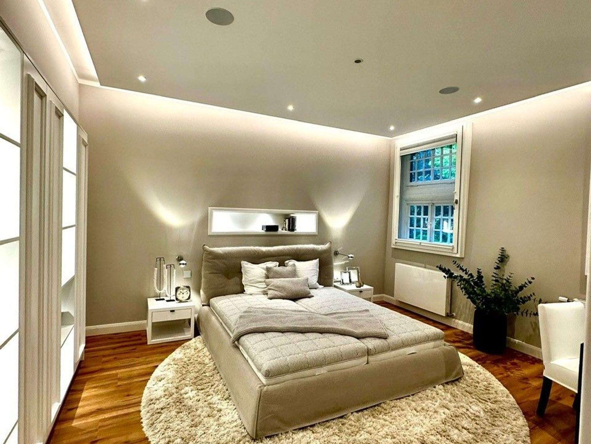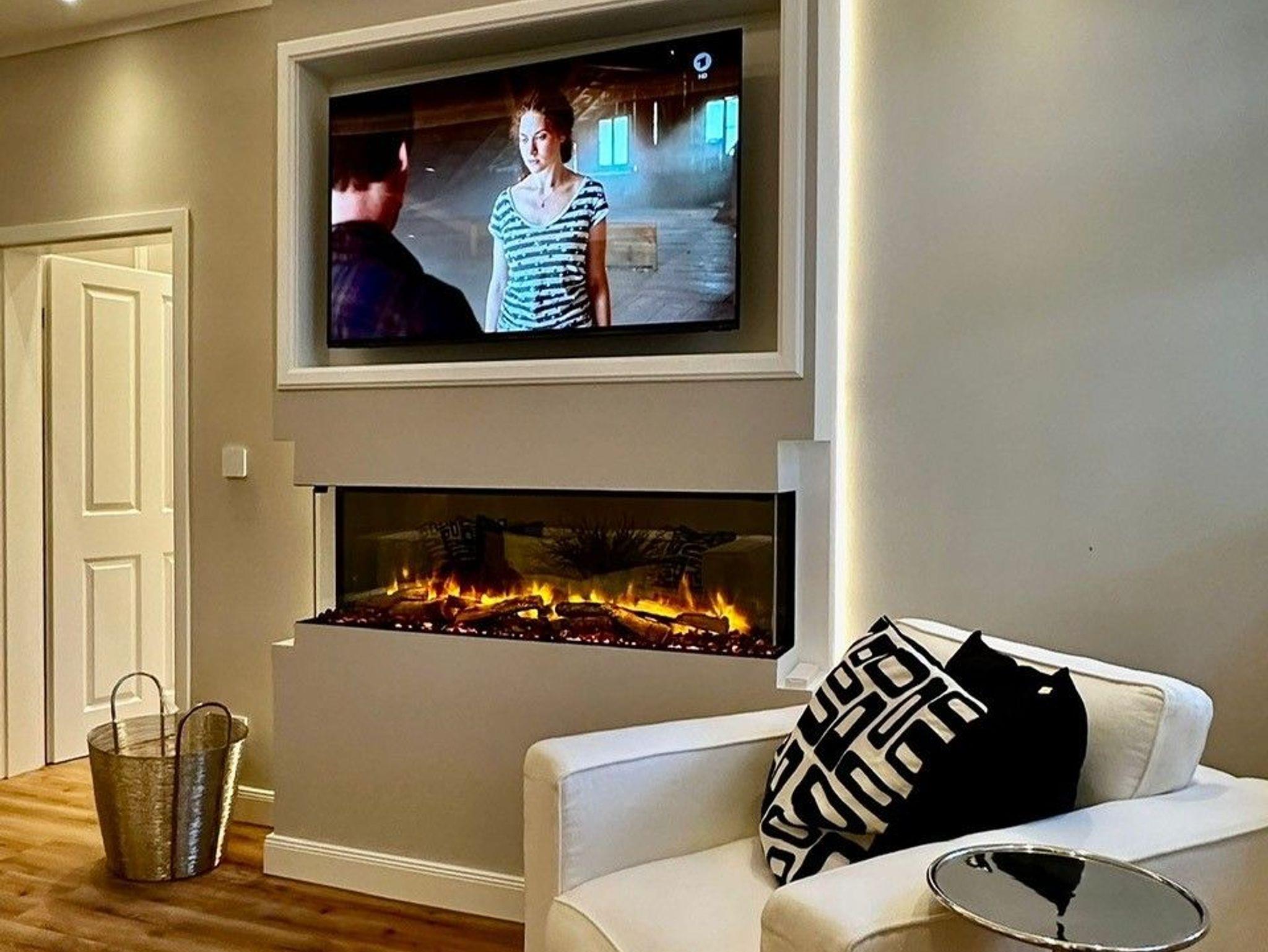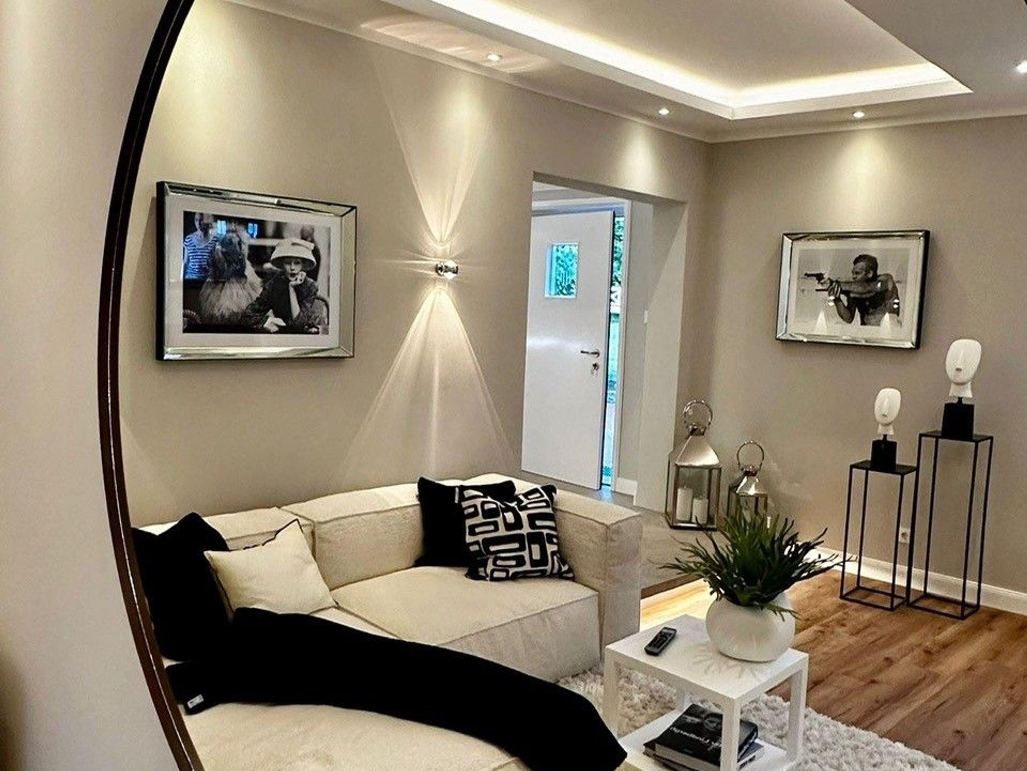 Vom Flurbereich gelange Sie durch eine Doppelflügeltür, die auch komplett offen stehen kann, in das gemütliche Wohnzimmer mit einem luxuriosen Elektrokamin für behagliche und gemütliche Abende. Ein helles bequemes Sofa lädt zu entspannten Momenten ein. Natürlich verfügt das Wohnzimmer über einen großen Flat-TV, der in das WLAN eingebunden ist, so dass man seine Lieblingsserien und Filme mit den entsprechenden Anbietern streamen kann (eigener Zugang ist notwendig). Vom Wohnzimmer gelangt man in das schöne Schlafzimmer, dass mit hellen Möbel und einem gemütlichen Doppelbett mit separaten Matratzen eingerichtet ist. Ein kleiner Schreibtisch ermöglicht ein Arbeiten im Homeoffice. Die Schränke bieten sehr viel Stauraum.
