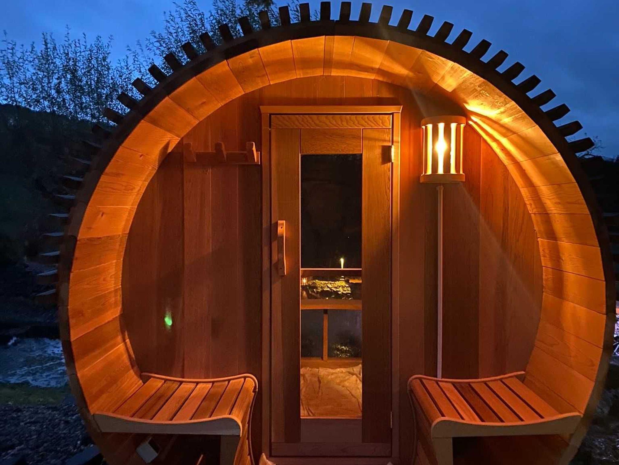 Vor Ort gibt es eine sehr schöne Außensauna in Form einer Panoramasauna, die von unseren Gästen selbständig genutzt werden kann. Bei der Ankunft zeigen wir unseren Gästen, wie sie die Sauna selbständig anmachen können. Unsere Gäste können dadurch morgens früh um 6 Uhr aber auch abends um 10 Uhr noch in die Sauna. Sobald man in die Sauna geht, dreht man das Schild vor der Sauna einfach auf besetzt. So ist garantiert, dass man die Sauna alleine nutzen kann.