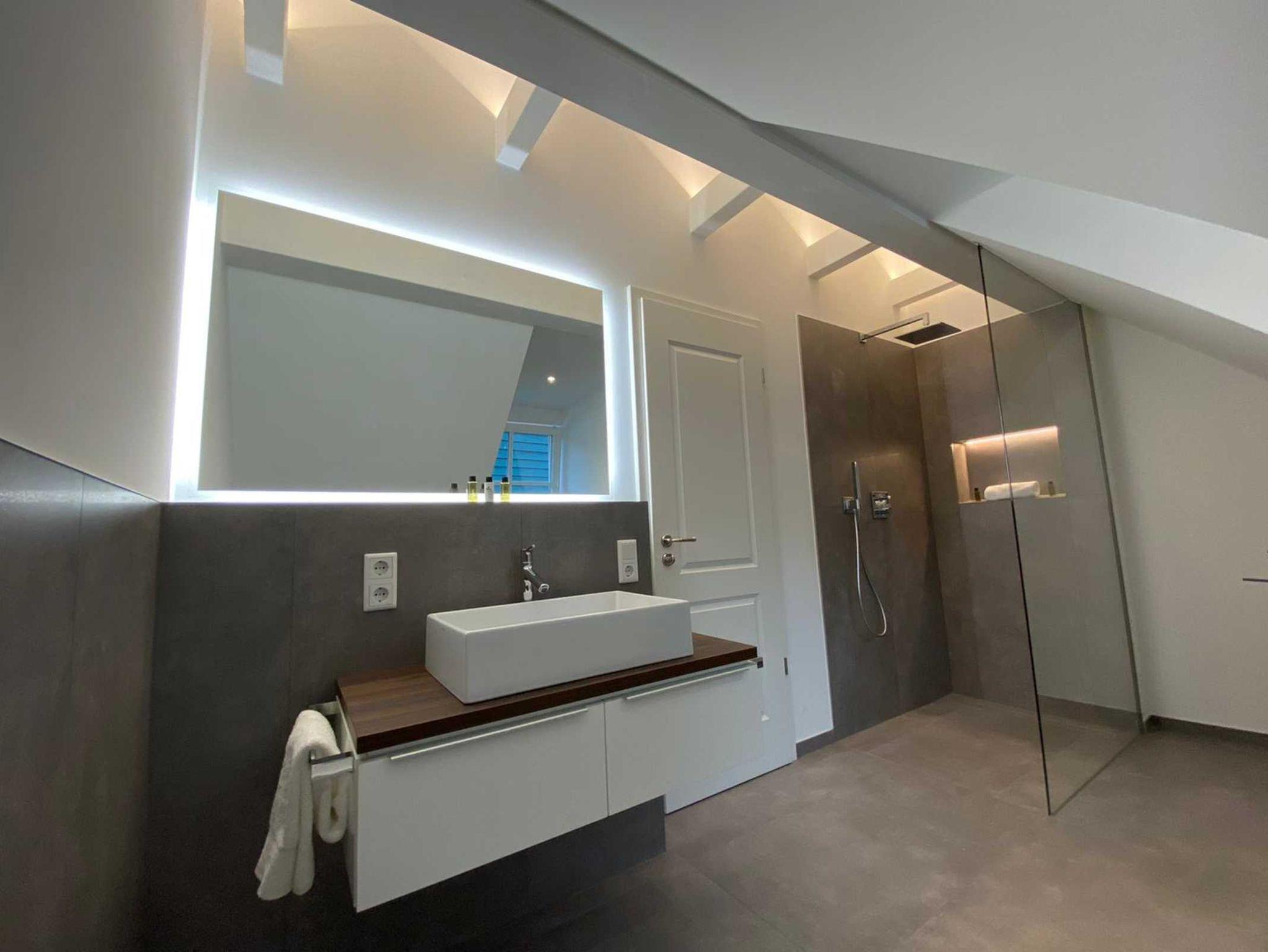 Wenn man die Apartmenttür öffnet, tritt man ein in einen großzügigen und hellen Wohn- / Essbereich. Hier finden Sie eine große, moderne Küche mit Kochinsel, die keine Wünsche offen lässt. Sie ist ausgestattet mit Backofen, Herd, Mikrowelle, Kühlschrank mit 3 Sterne Fach, Nespressomaschine, Kaffeemaschine, Wasserkocher, Geschirr, Gläser usw.. An die Kochinsel schließt sich ein Tisch mit Platz für 4 Personen an. Im Wohnbereich finden Sie einen Sessel, Couchtisch und ein Schlafsofa in Bettqualität (1,60 x 2,00 m). Das Schlafsofa verfügt über eine Matratze und einen Lattenrost. Zudem ist ein Fernseher vorhanden, der ans WLAN angeschlossen ist, so dass sich Ihre aktuellen Serien und Filme über die entsprechenden Anbieter streamen lassen. Im Wohnbereich lassen sich die Fenster mittels Verdunkelungsplissees verdunkeln. Vom Wohn- / Esszimmer gelangen Sie ins helle Schlafzimmer. Das Schlafzimmer verfügt über ein gemütliches Doppelbett (1,80 x 2,00 m, getrennte Matratzen), von dem aus man aus dem Fenster in die herrliche Landschaft blicken kann. Die Fenster lassen sich durch entsprechende Plissees komplett verdunkeln. Zudem befindet sich im Möbel unter dem Fenster ein Fernseher, den man aus dem Möbel herausfahren kann. Weiterhin befindet sich im Schlafzimmer ausreichend Platz zum Verstauen der Anziehsachen.