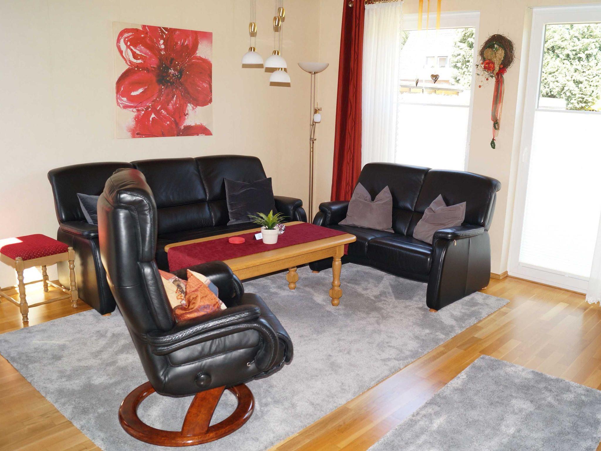 Wohnzimmer mit Ledercouch und Fernsehsessel, LED-TV 42 Zoll (106 cm) Full HD mit Smart-TV-Funktion (u. a. Netflix, Amazon Prime etc.)