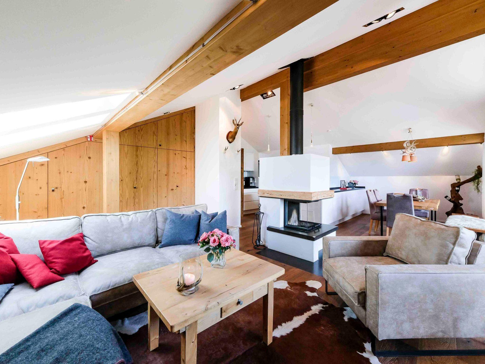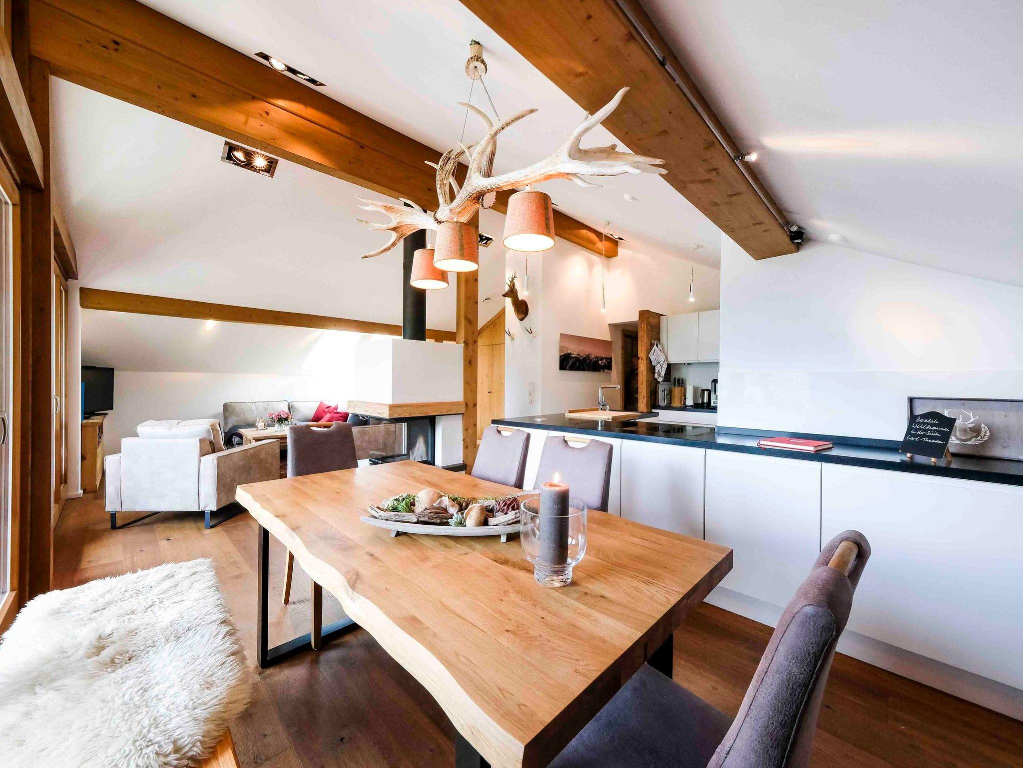 Die Suite „Carl-Theodor“ befindet sich im Dachgeschoss mit hohen Decken und einem großen Panorama-Fenster das den direkten Blick auf den Tegernsee und die imposanten Berge erschließt. Der Dachbalkon lädt zum ausgiebigen Sonnenbaden und zur Brotzeit im Freien ein. Die sehr hochwertige Ausstattung umfasst neben einem Essbereich und einem Wohnbereich eine rundum-sorglos Küche mit Backofen, Mikrowelle, Kaffee-Automat, Geschirrspüler und Induktionskochfeld. Die Einrichtung ist luxuriös und geschmackvoll und verbindet gleichsam das Ländliche mit dem Neuen. Überall finden sich Altholz-, und Feinstein-Materialien, die Wärme und Geborgenheit vermitteln, hierzu gehört auch eine Fußbodenheizung und eine offene Feuerstelle für kühle Abende. Die Suite umfasst zwei Räume mit je zwei Schlafplätzen à 90x200cm Boxspringbetten sowie ein Bad mit Dusche und Badewanne und ein weiteres separates WC.