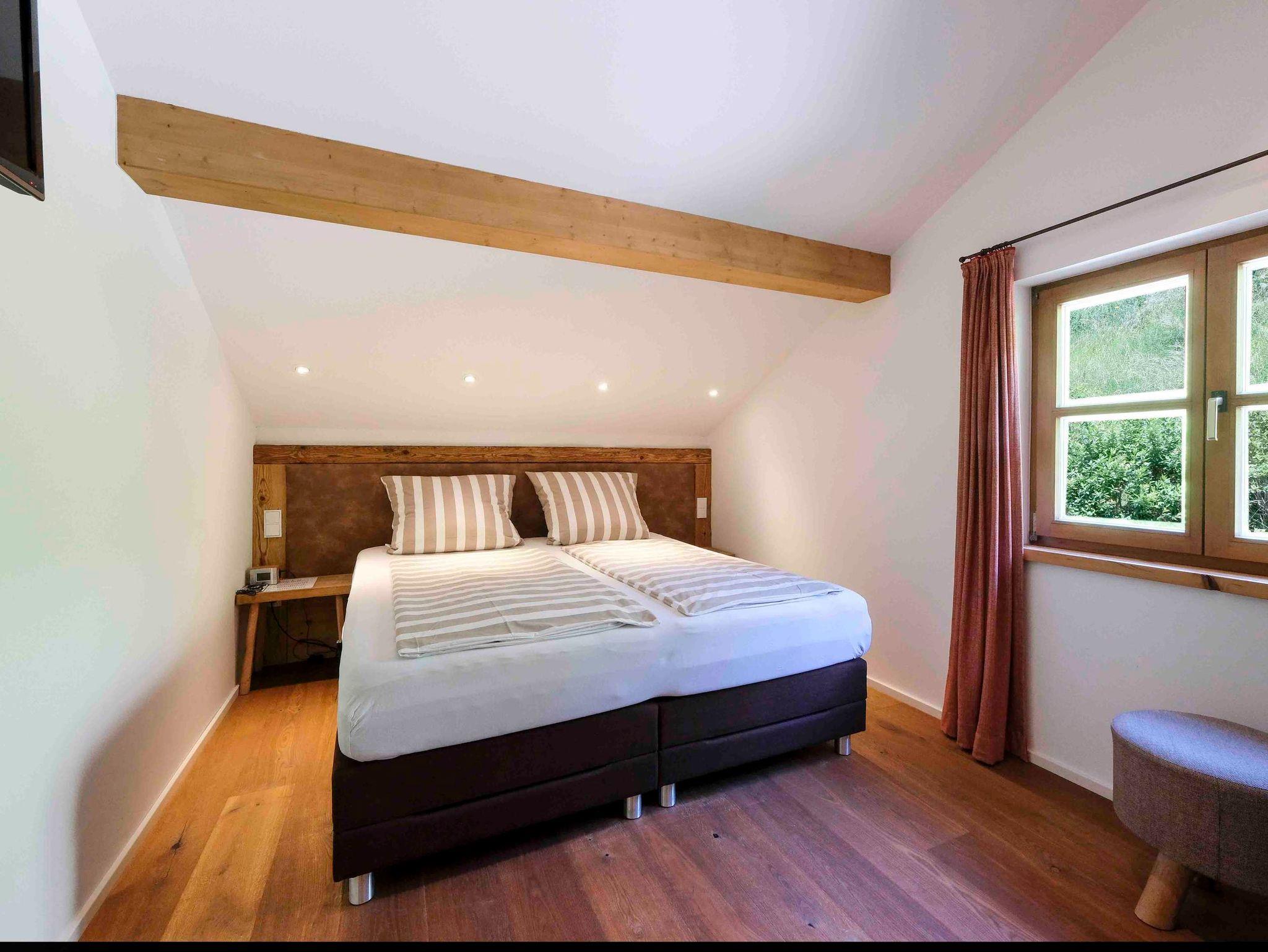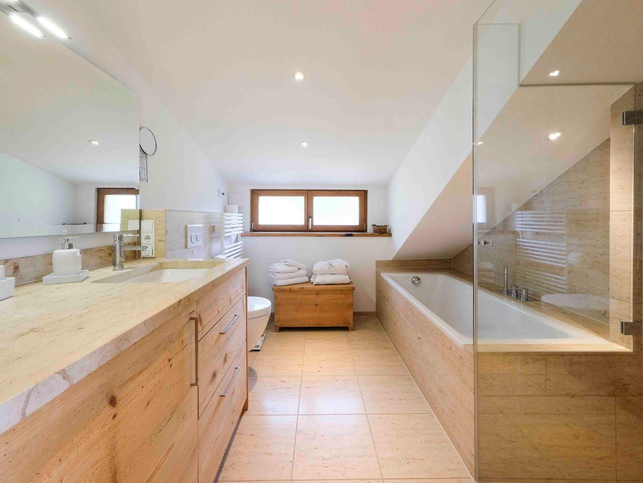 Die Suite „Carl-Theodor“ befindet sich im Dachgeschoss mit hohen Decken und einem großen Panorama-Fenster das den direkten Blick auf den Tegernsee und die imposanten Berge erschließt. Der Dachbalkon lädt zum ausgiebigen Sonnenbaden und zur Brotzeit im Freien ein. Die sehr hochwertige Ausstattung umfasst neben einem Essbereich und einem Wohnbereich eine rundum-sorglos Küche mit Backofen, Mikrowelle, Kaffee-Automat, Geschirrspüler und Induktionskochfeld. Die Einrichtung ist luxuriös und geschmackvoll und verbindet gleichsam das Ländliche mit dem Neuen. Überall finden sich Altholz-, und Feinstein-Materialien, die Wärme und Geborgenheit vermitteln, hierzu gehört auch eine Fußbodenheizung und eine offene Feuerstelle für kühle Abende. Das Schlafzimmer bietet ein 180x200cm Boxspringbett. In dem Bad befinden sich Dusche und Badewanne. Darüber hinaus gibt es ein weiteres separates WC.