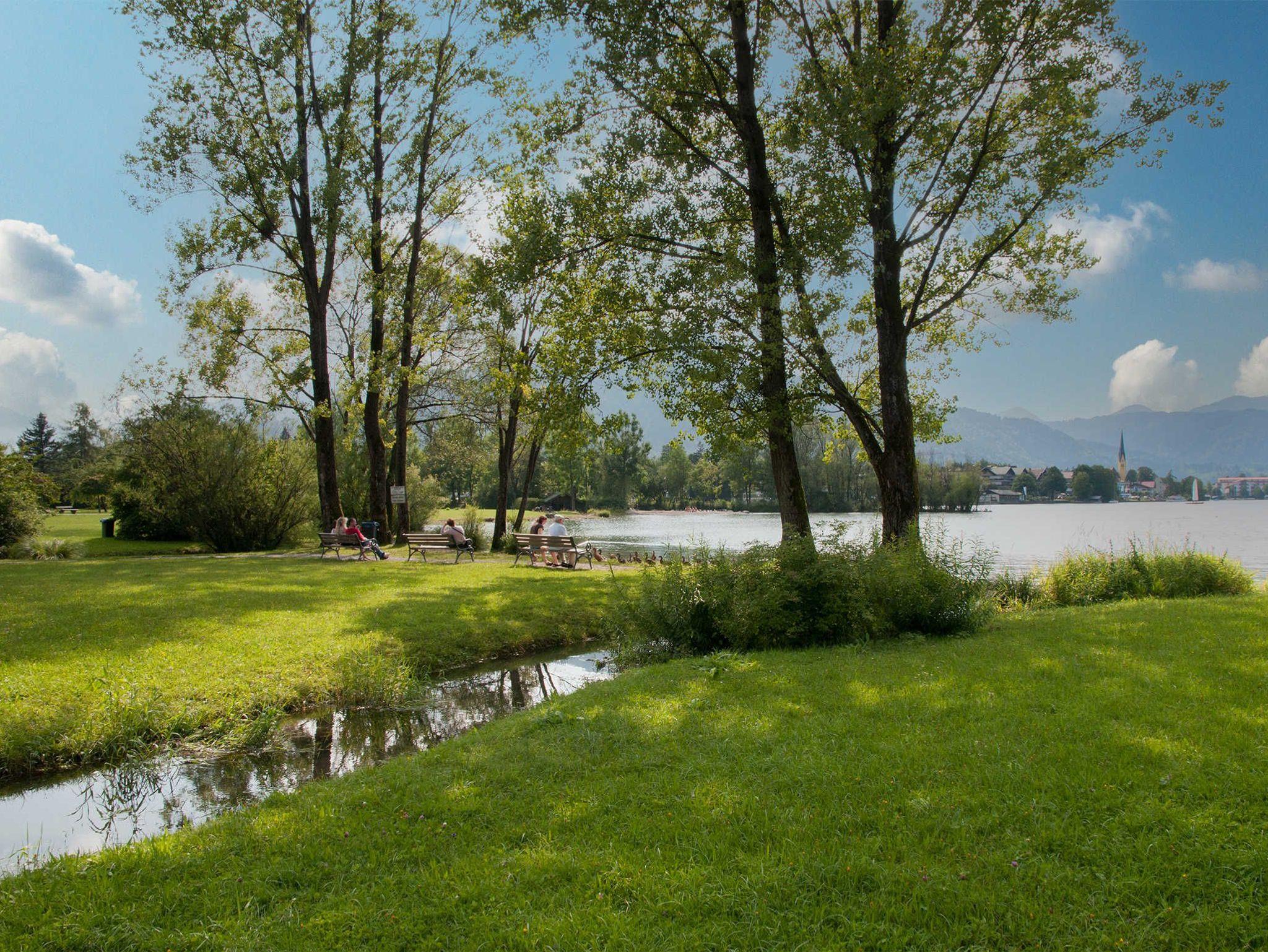 Von der Ferienwohnungen aus erreichen Sie in wenigen Geh-Minuten das Ufer des Tegernsees: Genießen Sie dort die wunderbare Aussicht auf den bekannten Malerwinkel in Rottach-Egern und die umliegende Bergwelt.