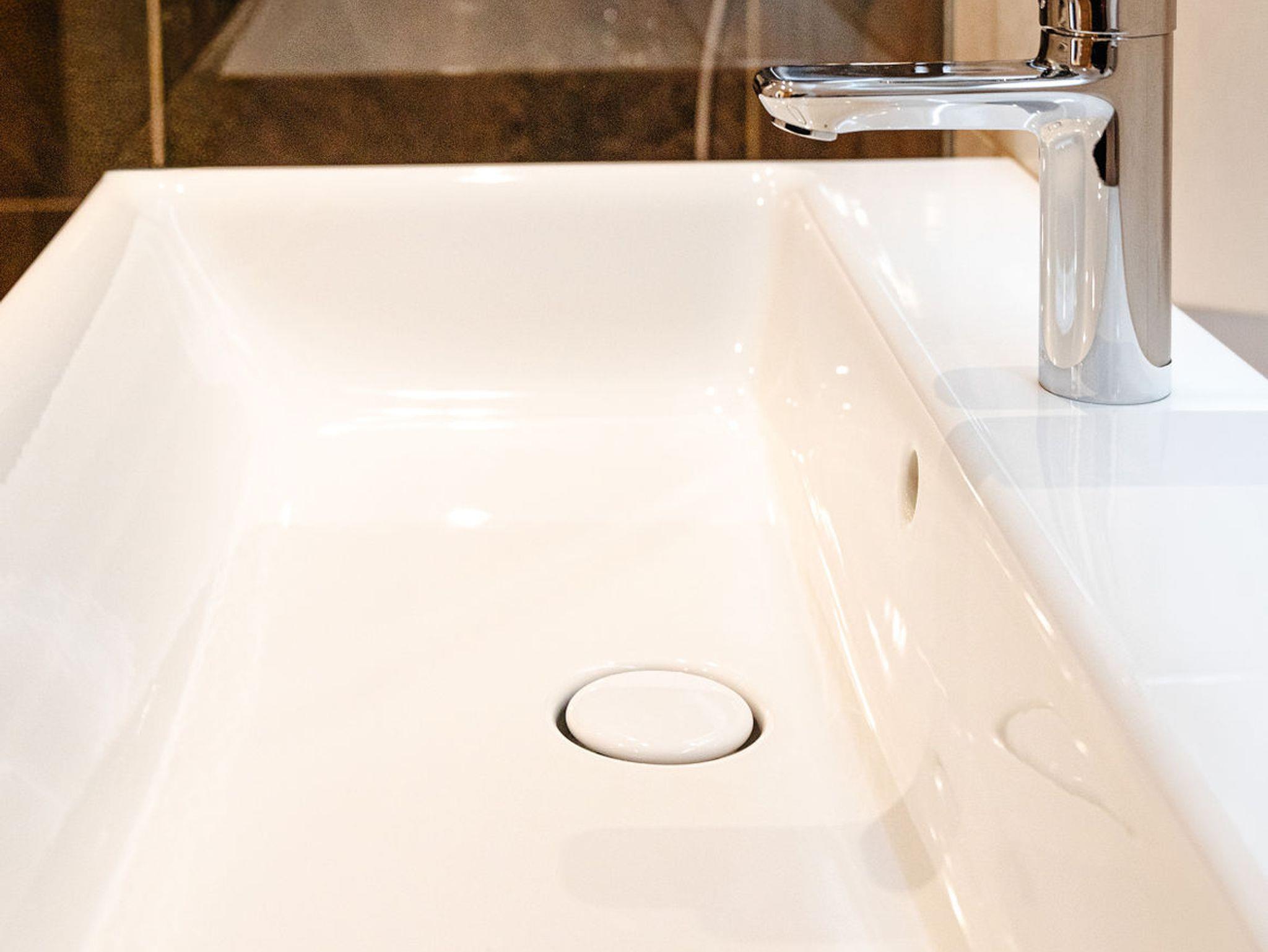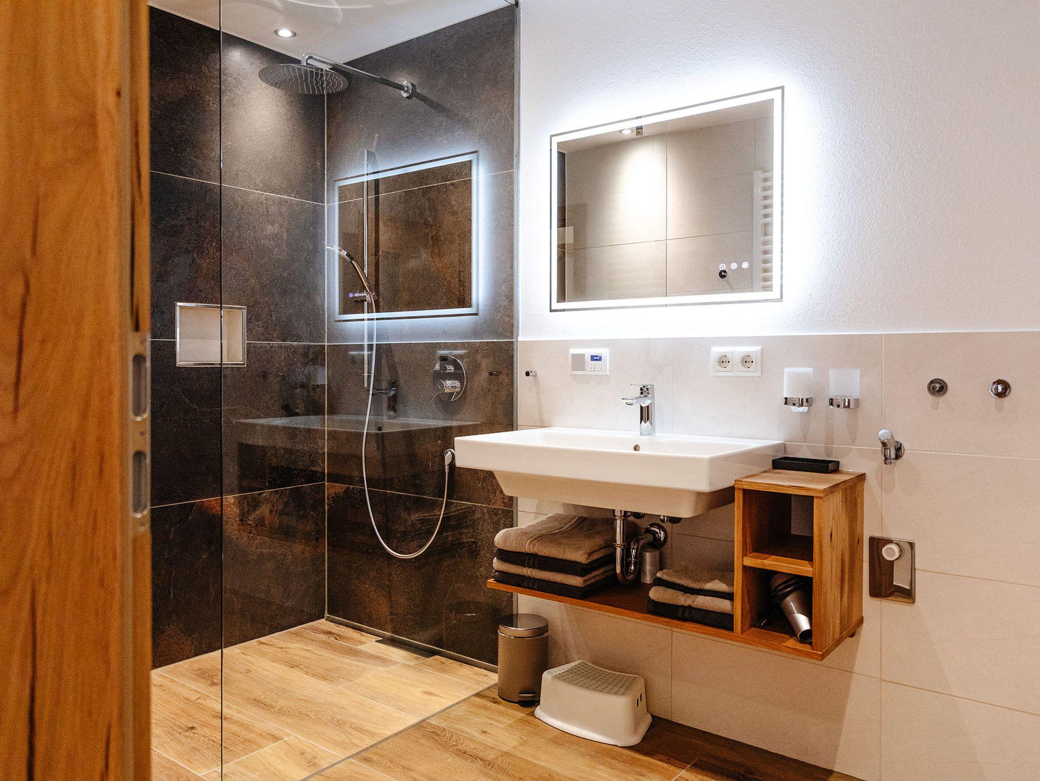 Im großen Badezimmer erwartet Sie eine begehbare, bodengleiche Regendusche mit großem Duschbereich in harmonischer Farbgebung für ruhige, edle Stimmung.