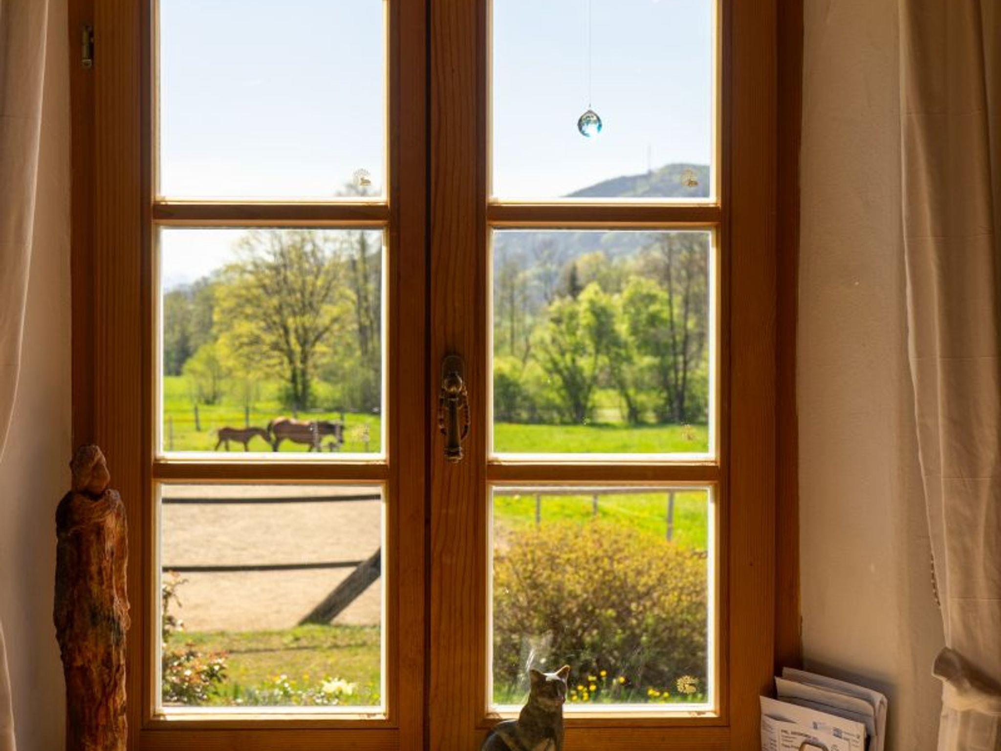 Gemütlich eingerichtete Ferienwohnung auf dem Bauernhof mit Doppel- Einzel und Etagenbetten. Die Wohnung besitzt ein großes Panoramafenster mit Blick auf unsere Wiesen und Tiere. Der Wohnbereich lädt zum gemütlichen Beisammensein ein und durch das große Fenster erleuchtet das Appartement bei Sonnenschein im goldenen Schein. Im Wohnzimmer ist bei Bedarf eine zusätzliche Schlafmöglichkeit für 2 Personen vorhanden. Es gibt eine voll ausgestattete Küche, ein Bad mit Badewanne & WC und ein Bad mit Dusche & WC. Unser Haus besitzt einen wunderschönen Garten mit Terrasse und Blick auf die Berge.