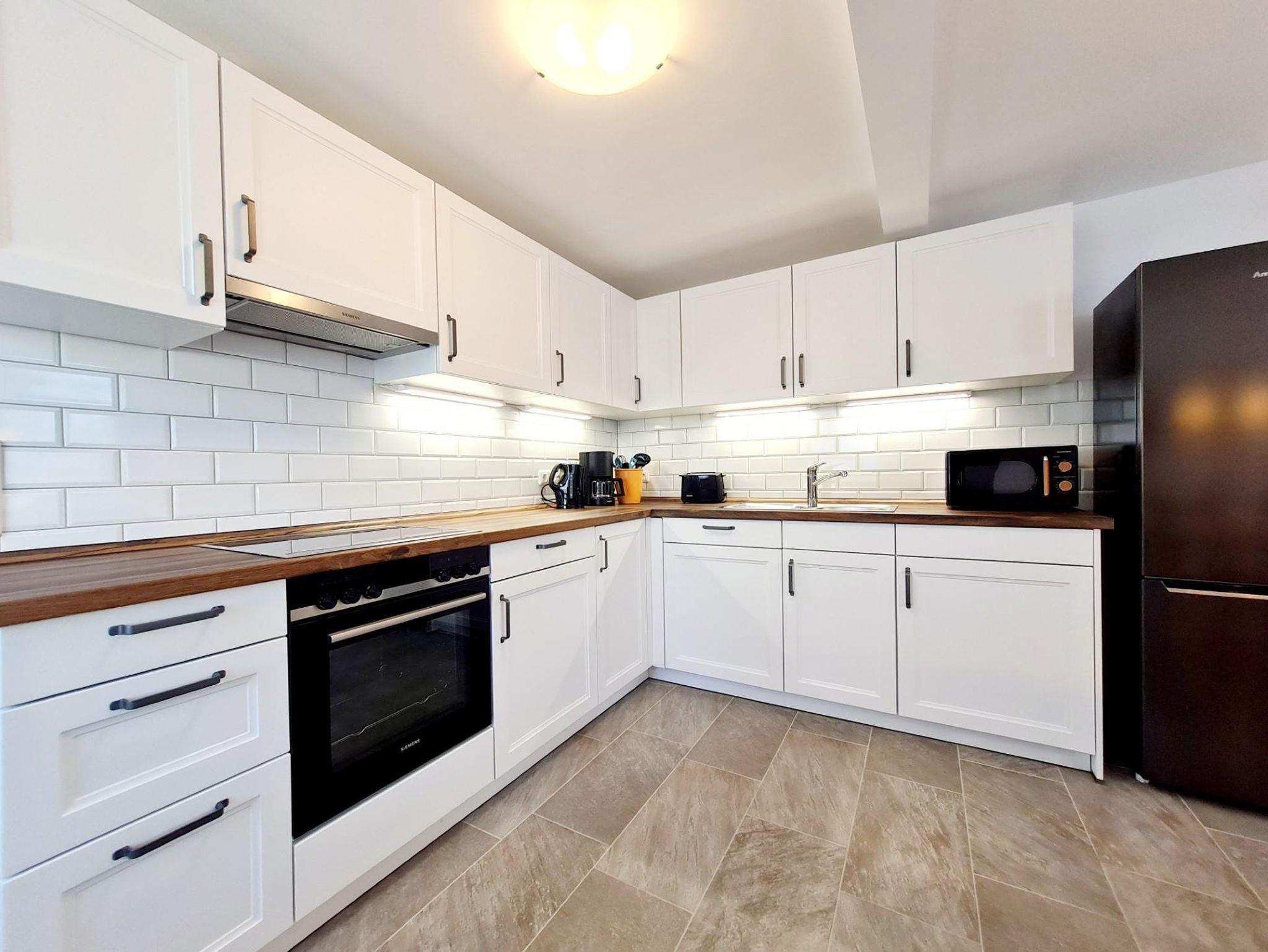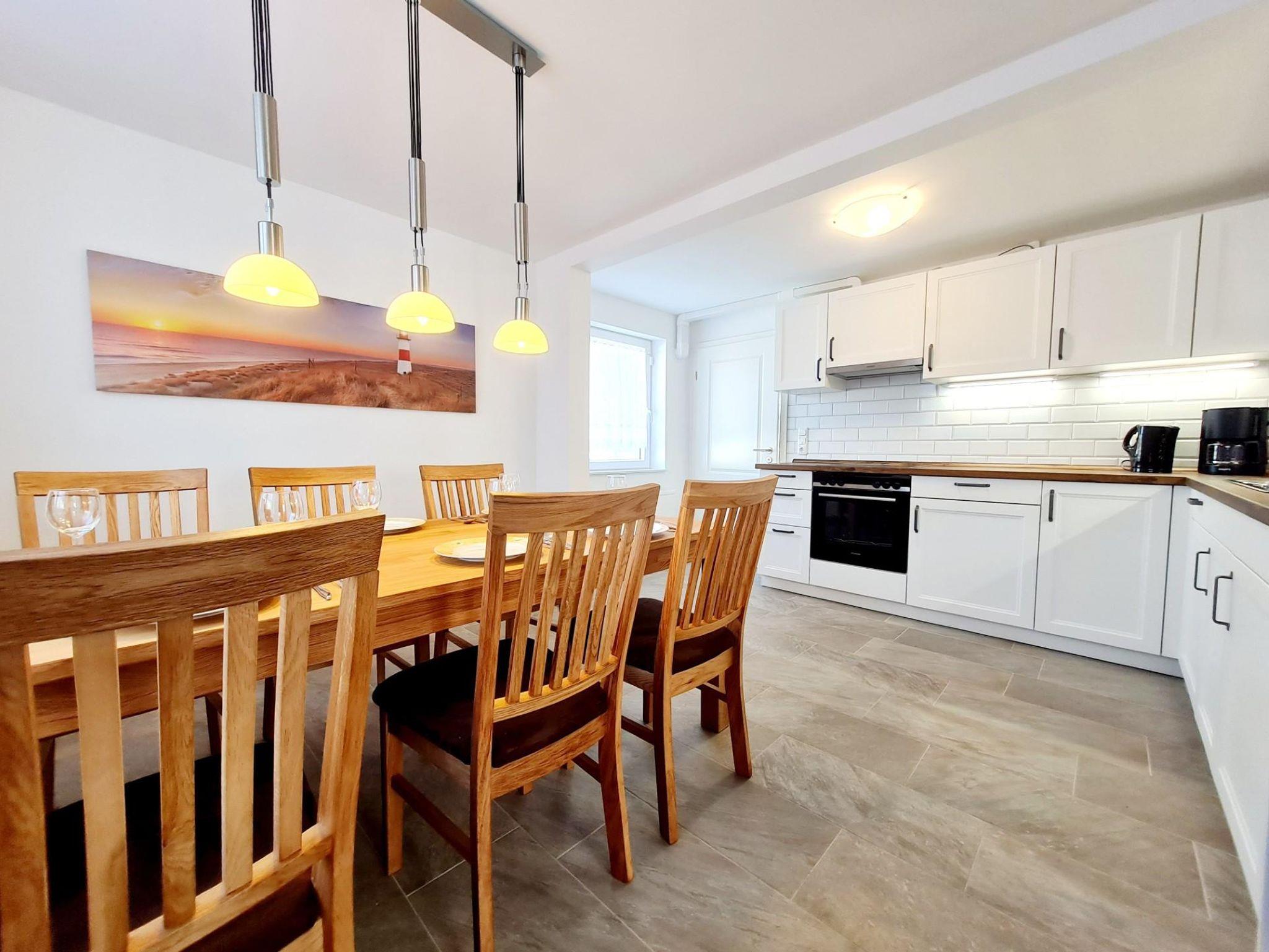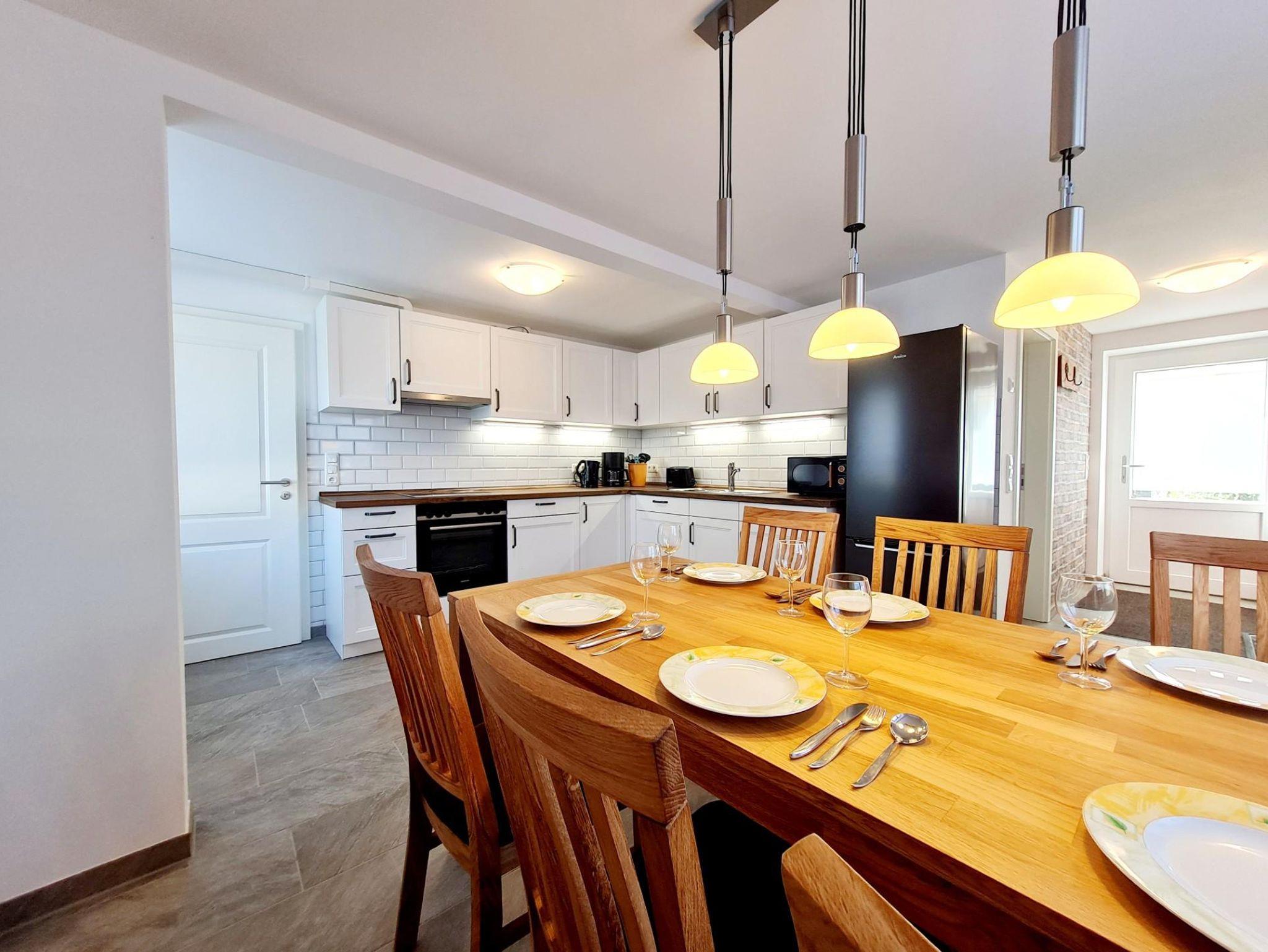 Die neue Küche ist komplett ausgestattet und verfügt über einen großzügigen Esstisch für gemeinsame Mahlzeiten.