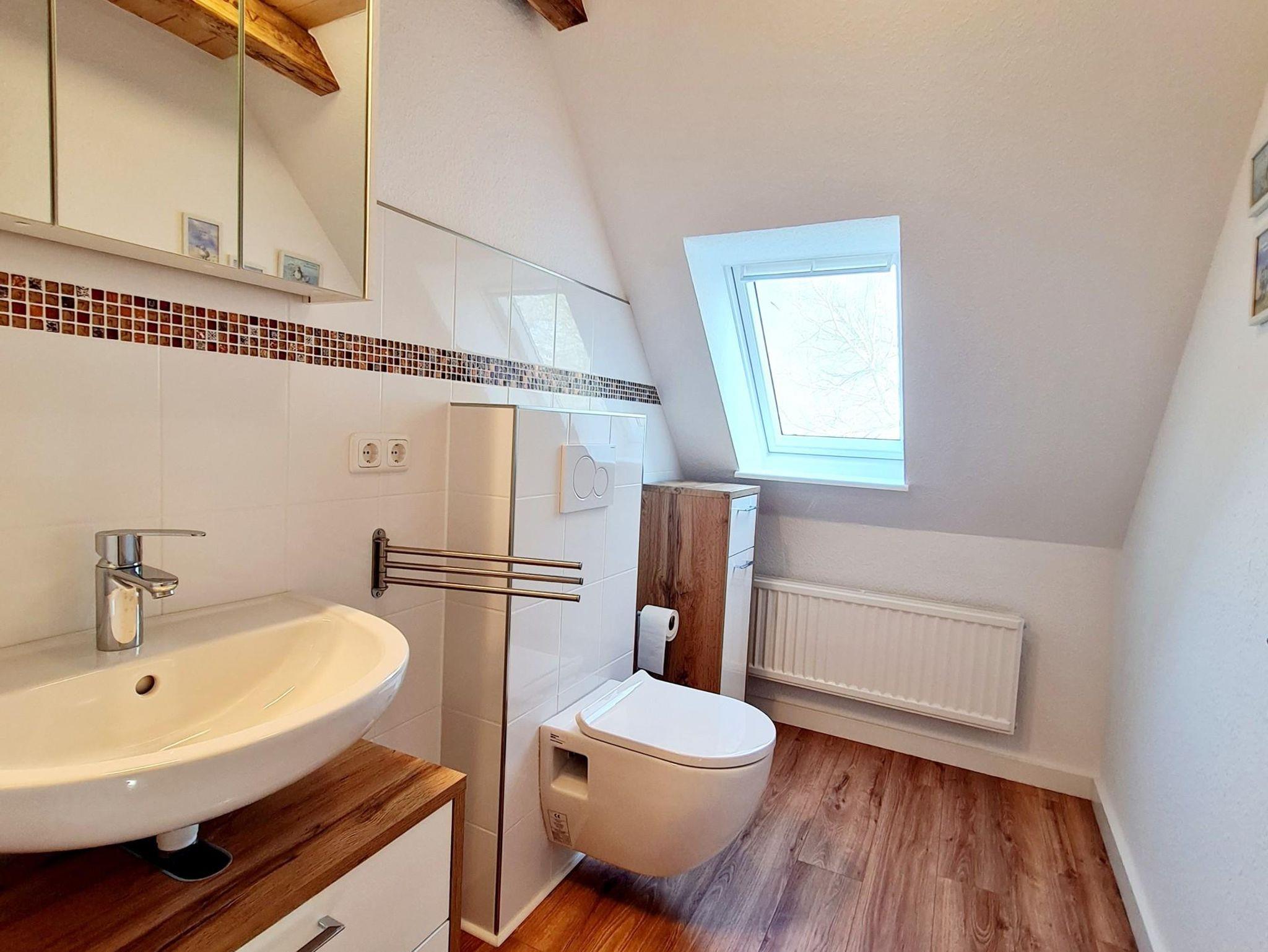 Das Duschbad bietet zwei Waschtische sowie ein WC. Zusätzlich steht ein weiteres WC im Obergeschoss zur Verfügung.