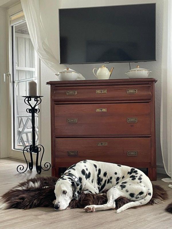 Direk am Esszimmer schließt sich eine geräumige retrofarbene Küche mit Spülmaschine, Herd (Induktion) mit Backofen und Dunstabzughaube, einen Kühlschrank mit Gefriermöglichkeit sowie Kaffeemaschine, Toaster und Wasserkocher, TM 5 an. Ein besonderer Hingucker ist die gestaltete Rückwand mit typischen Motiven unserer Urlaubsregion wie den Westerhever Leuchtturm, Schafen, Lämmer, Deichen und das Meer.