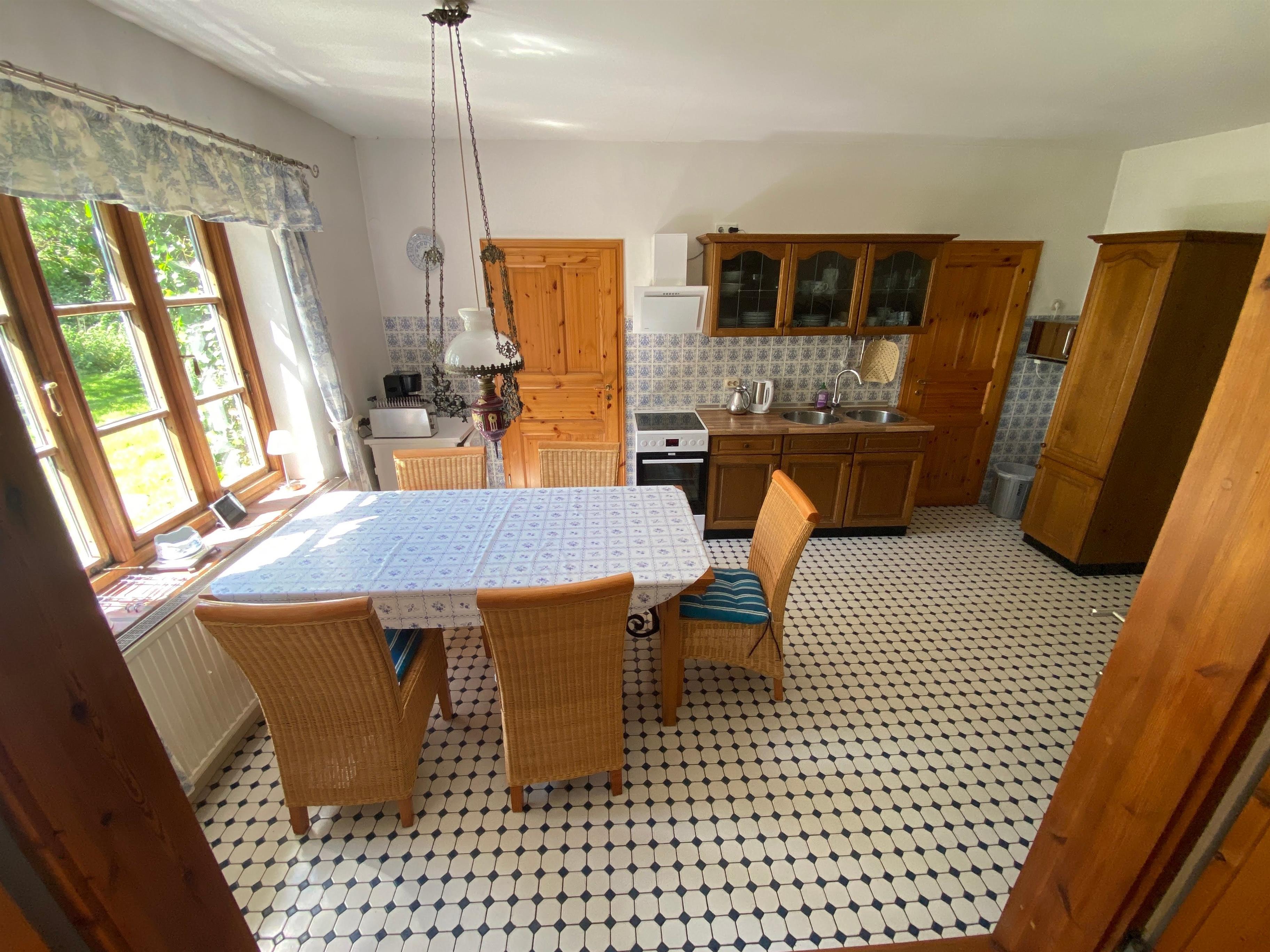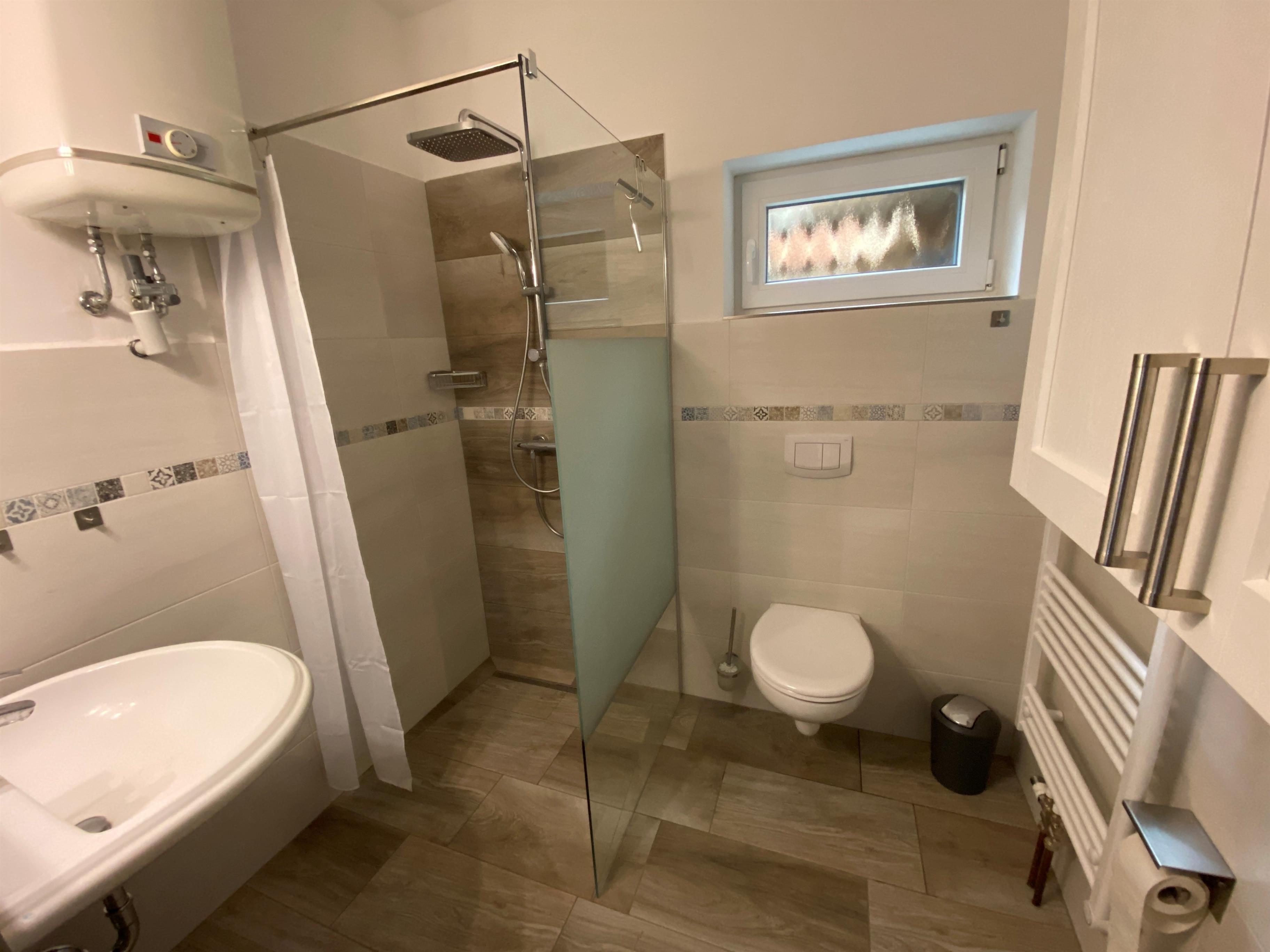 Ferienwohnung 2 im Erdgeschoss mit ca. 75m² und eigener Terrasse sowie zwei Schlafzimmern für bis zu fünf Personen. Ein Schlafzimmer hat ein Ehebett und ein Schlafzimmer hat ein Dreier-Etagenbett. Das Badezimmer wurde Anfang 2022 komplett saniert.