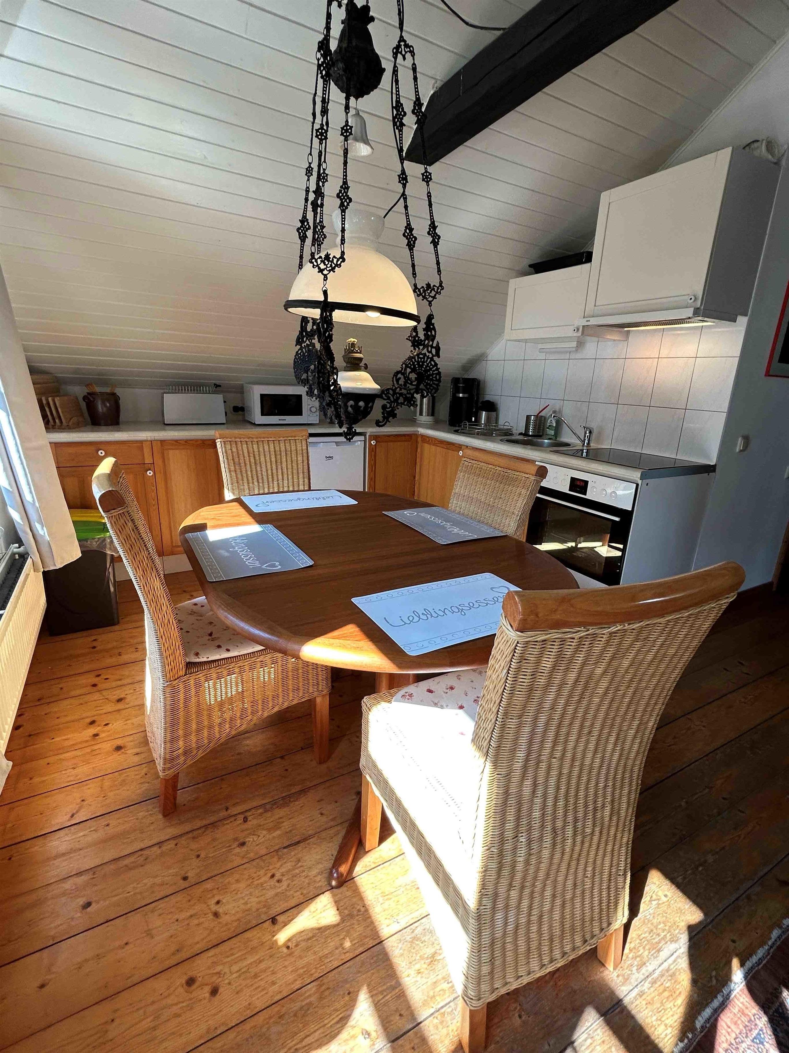 Die Ferienwohnung 3 liegt im Dachgeschoss, hat eine Größe von ca. 70m² und ist für bis zu 4 Personen geeignet. Sie hat ein Schlafzimmer mit Doppelbett sowie ein Schlafsofa im Wohnbereich (160x200cm). Diverse Sitzgelegenheiten sind auf dem Grundstück vorhanden.
