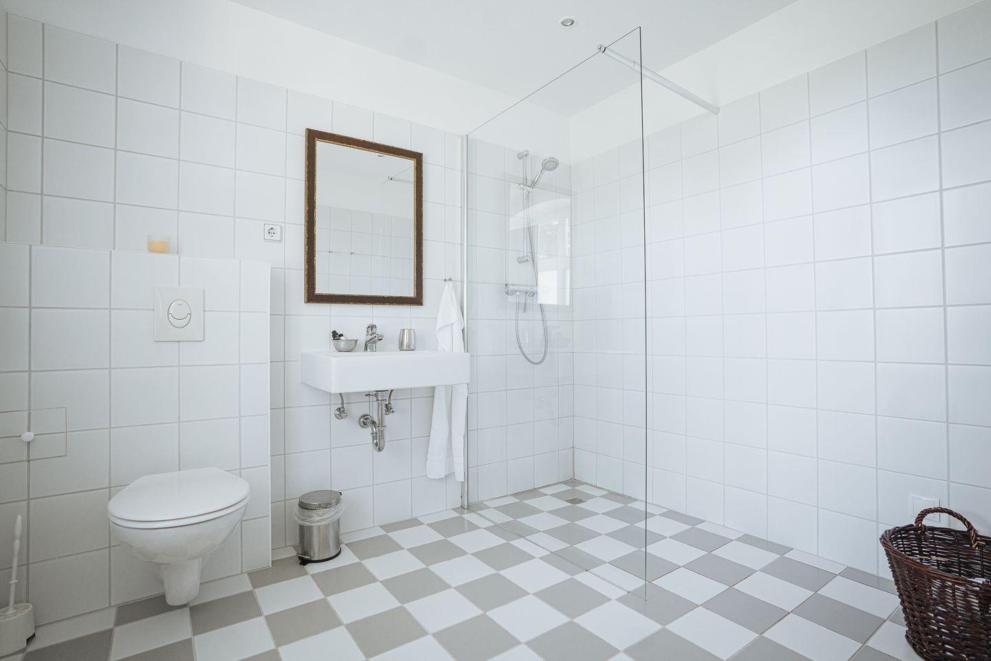 Es gibt ein Schlafzimmer (180er Doppelbett) sowie ein Badezimmer mit Fenster, bodengleicher Dusche, WC, Waschbecken, Spiegel und Haartrockner.