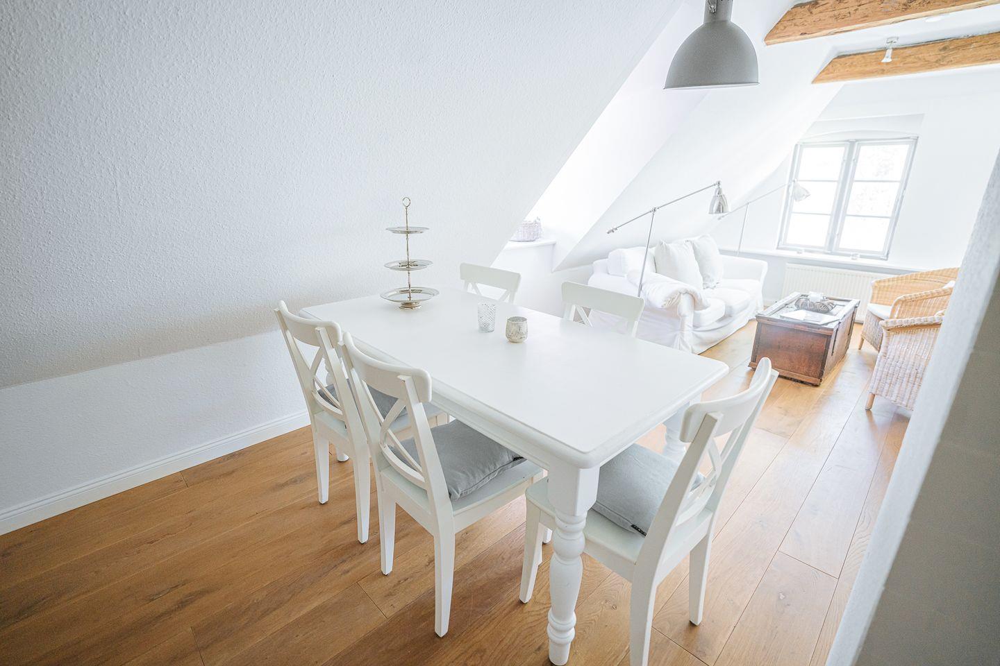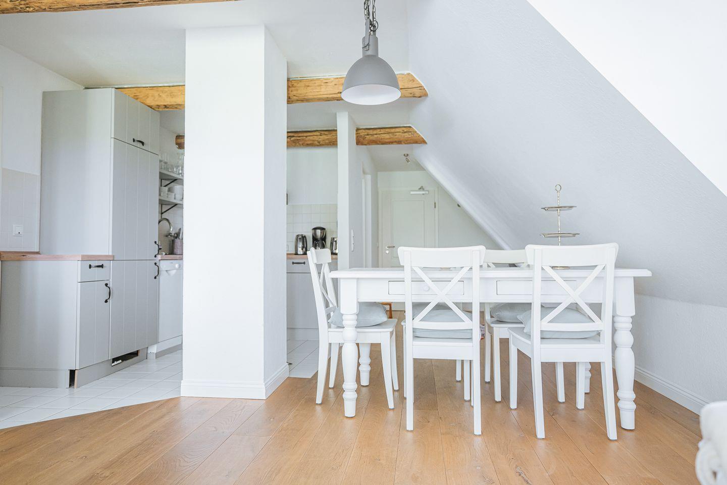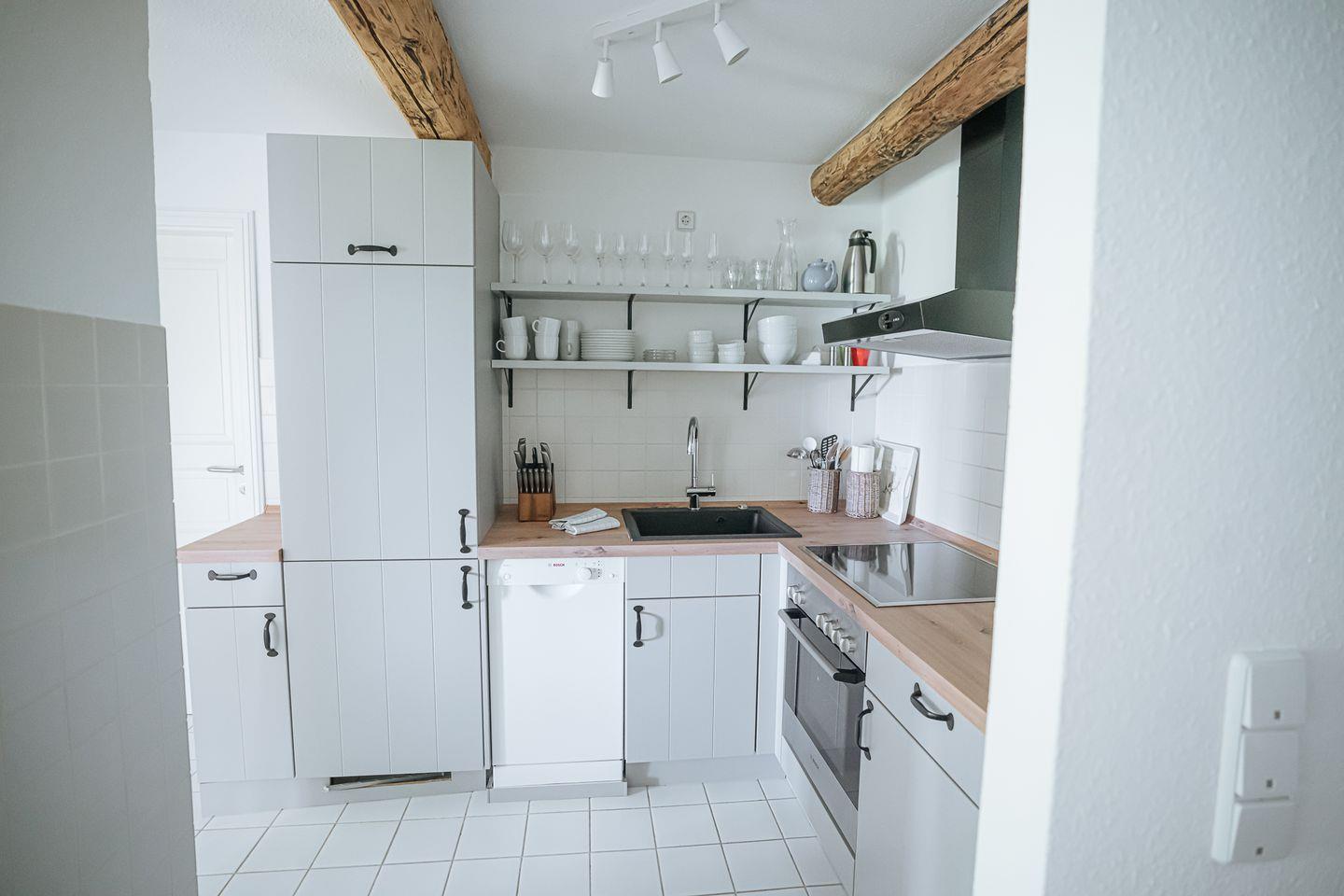 70 qm, 1. OG, bis 5 Personen, Sichtgebälk, sehr schönes Giebelzimmer, Holzdielen, großer Wohn-/Essbereich, großes Schlafzimmer mit max. 3 Betten, zweites Schlafzimmer mit Doppelbett, neues Bad mit ebenerdiger Dusche. Komplett ausgestattete, neue Küche mit Backofen und Geschirrspüler.
