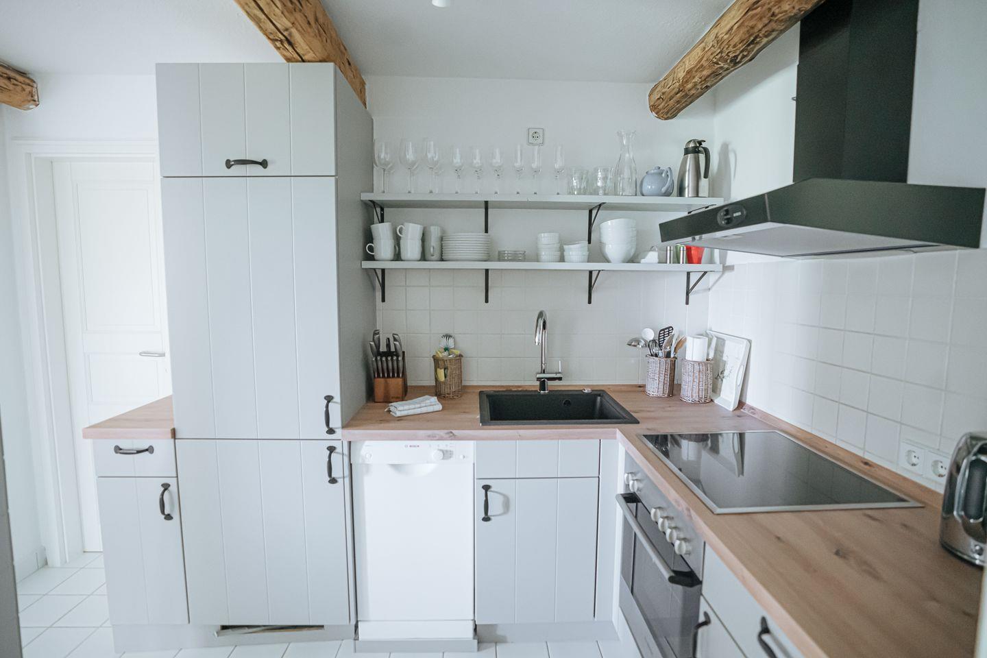 Die Küche ist zum Wohnzimmer offen gestaltet, voll ausgestattet und somit ist eine komplette Selbstversorgung möglich. Cerankochfeld, Backofen, Kühlschrank mit Gefrierfach, Spülmaschine, Kaffeemaschine , Wasserkocher, Toaster, Mixer und Küchenutensilien. Das Badezimmer verfügt über eine bodengleiche Dusche, WC, Waschbecken, Spiegel und Haartrockner.