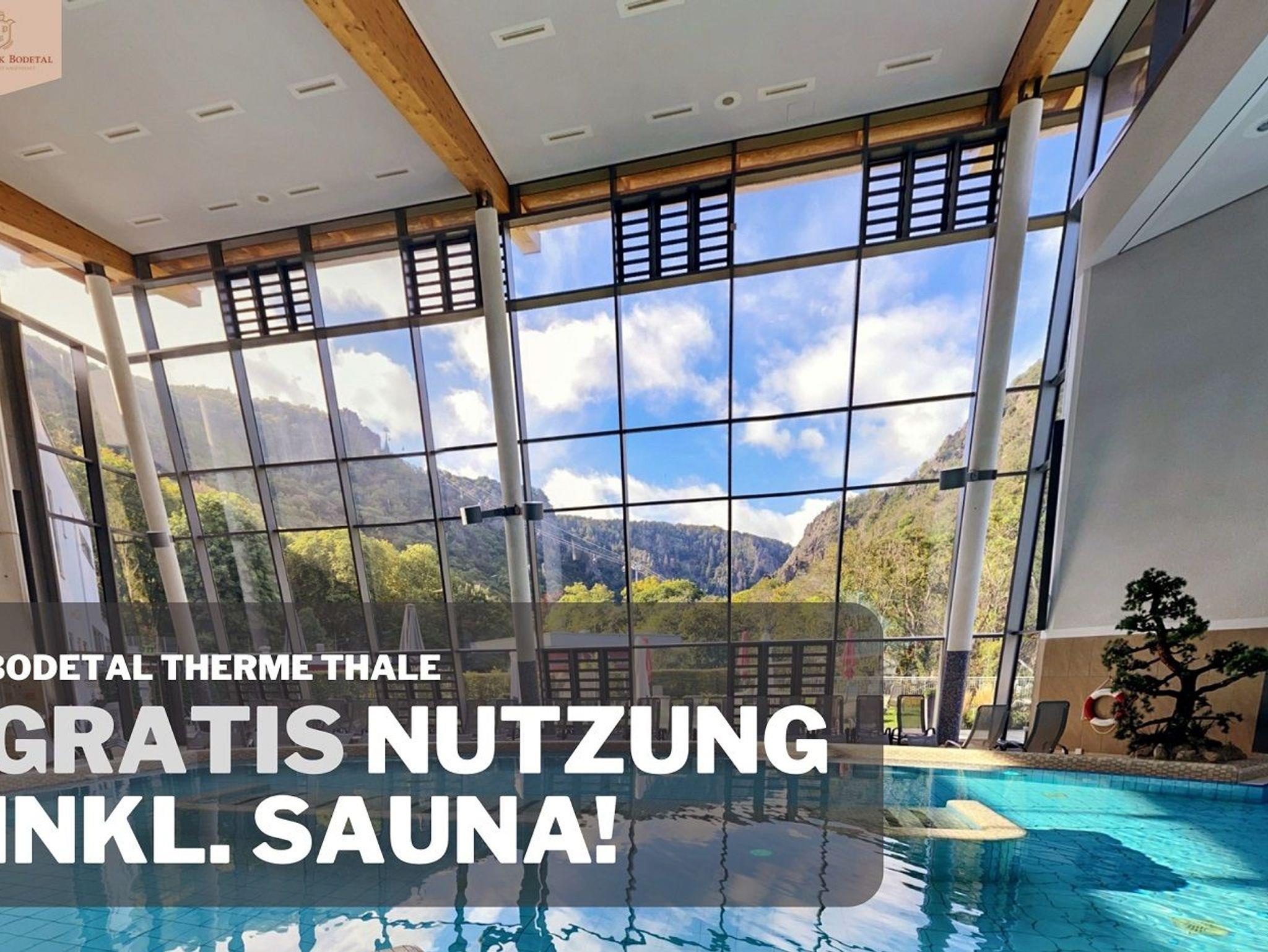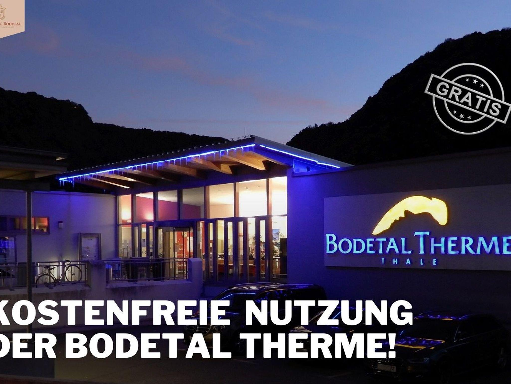 Als kleines Dankeschön für Ihre Reservierung bei uns, möchten wir Ihnen den Eintritt in die nahegelegene Bodetal-Therme schenken, insofern diese geöffnet ist. Die Therme ist nur 2 Gehminuten entfernt und ein idealer Ort für Entspannung und Wellness.