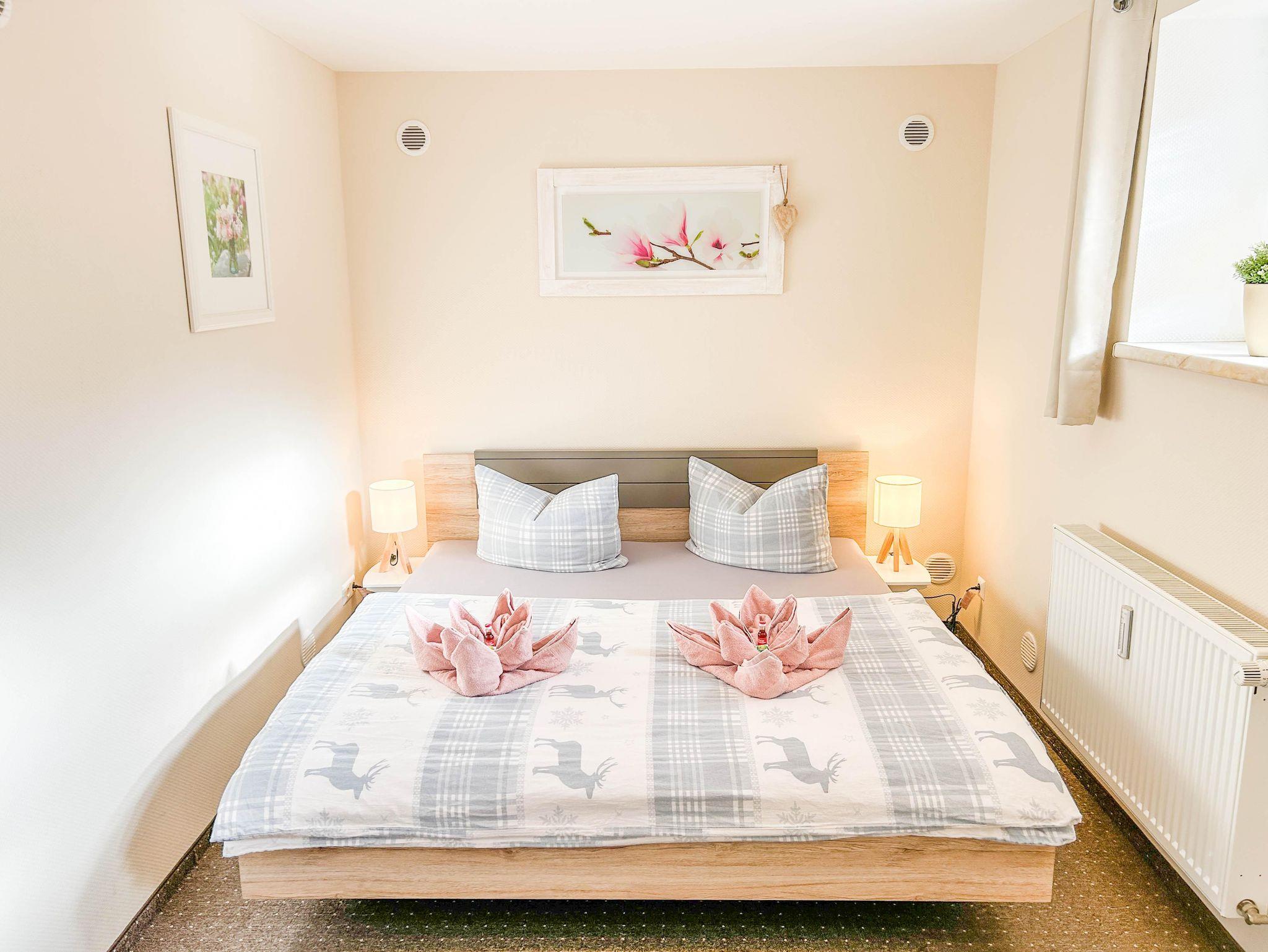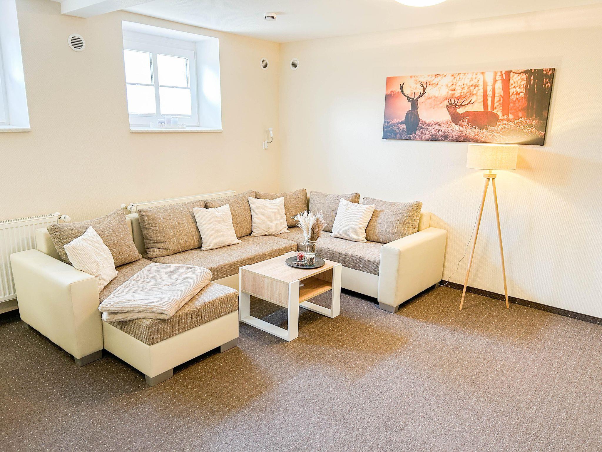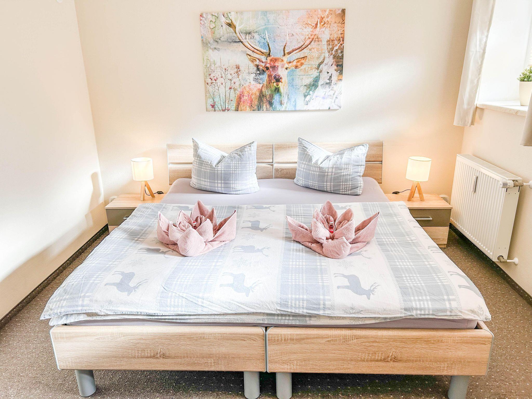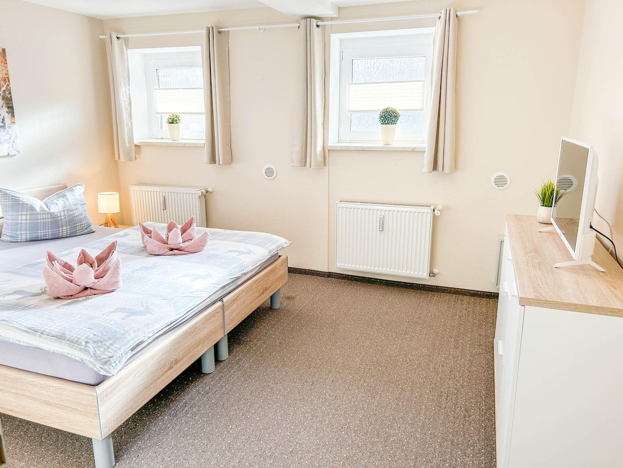 Unser komfortables 72 m² Apartment befindet sich im ruhigen Stadtzentrum von Thale und ist ideal für 1-4 Personen. Die Ferienwohnung verfügt über ein komplett ausgestattetes Küchen-Wohnzimmer mit Geschirrspüler, Filterkaffeemaschine, Wasserkocher, Toaster, Cerankochfeld, Ofen, Kühlschrank mit Gefrierfach und Mikrowelle. Der Wohnbereich ist mit einer bequemen Eckcouch und einem großen Fernseher (inklusive Magenta TV) ausgestattet. Die Ferienwohnung hat zwei gemütliche Schlafzimmer, die jeweils mit einem Doppelbett (180x200) und einem Smart-TV ausgestattet sind. Darüber hinaus steht auf Wunsch für die kleinen Gäste ein Reisebett (mit Matratze + Bettlaken und, falls gewünscht, mit Bettwäsche), ein Kinderhochstuhl sowie ein Töpfchen und ein Toilettensitzverkleinerer zur Verfügung. Das Apartment verfügt über eine Terrasse, einen separaten Eingang und einen Parkplatz auf dem Grundstück. Bettwäsche und Handtücher (in der Erstausstattung) sowie WLAN sind inklusive. Nichtraucherwohnung / Haustiere sind nicht erlaubt.