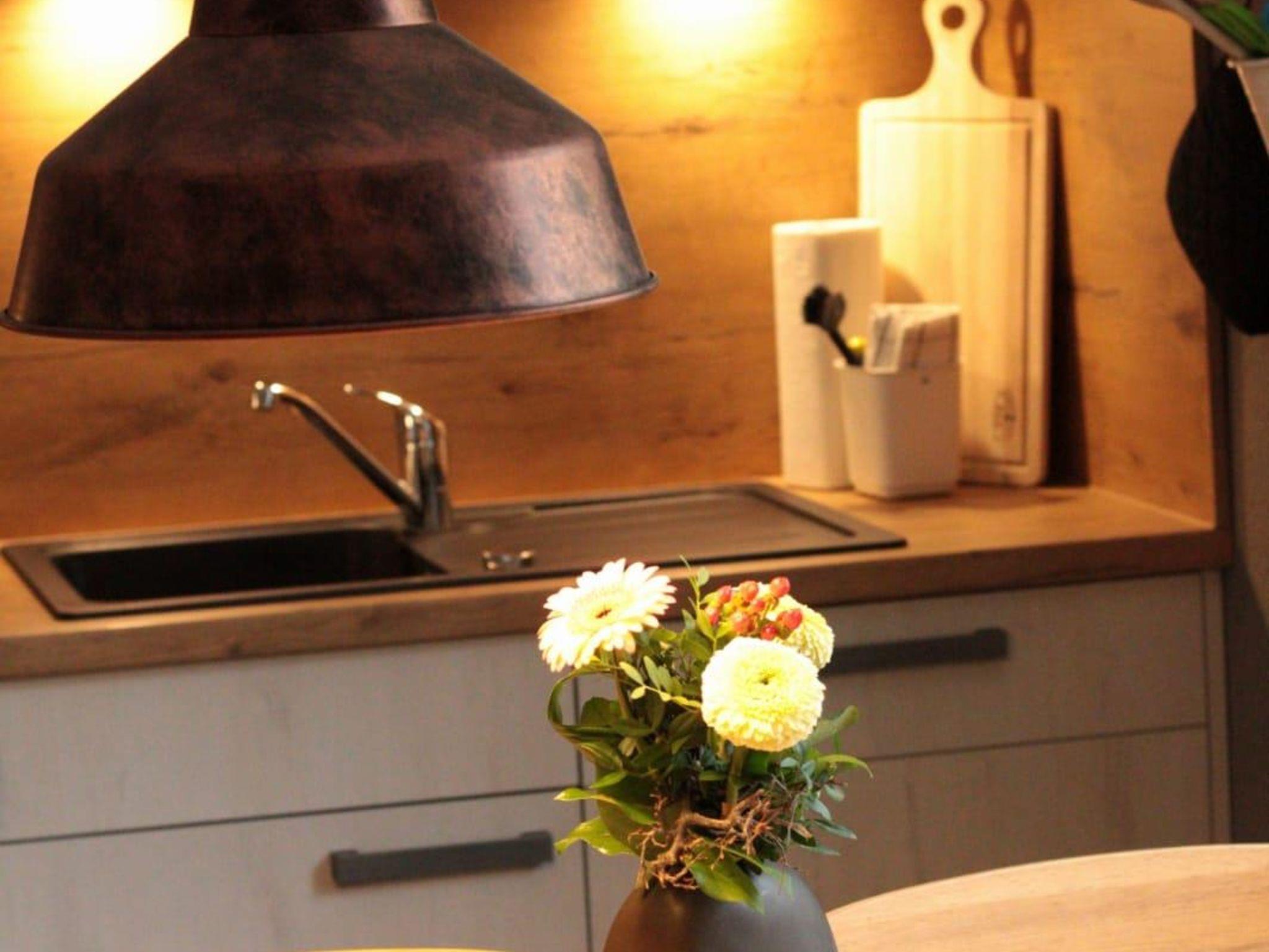 • Küche: Spülmaschine, Herd, Backofen, Kühlschrank mit Gefrierfach, Kaffeemaschine, Toaster, Wasserkocher, Mikrowelle, Esstisch mit bis zu 6 Stühlen und kleinem Kamin (Holz gegen kleinen Aufpreis mgl.)