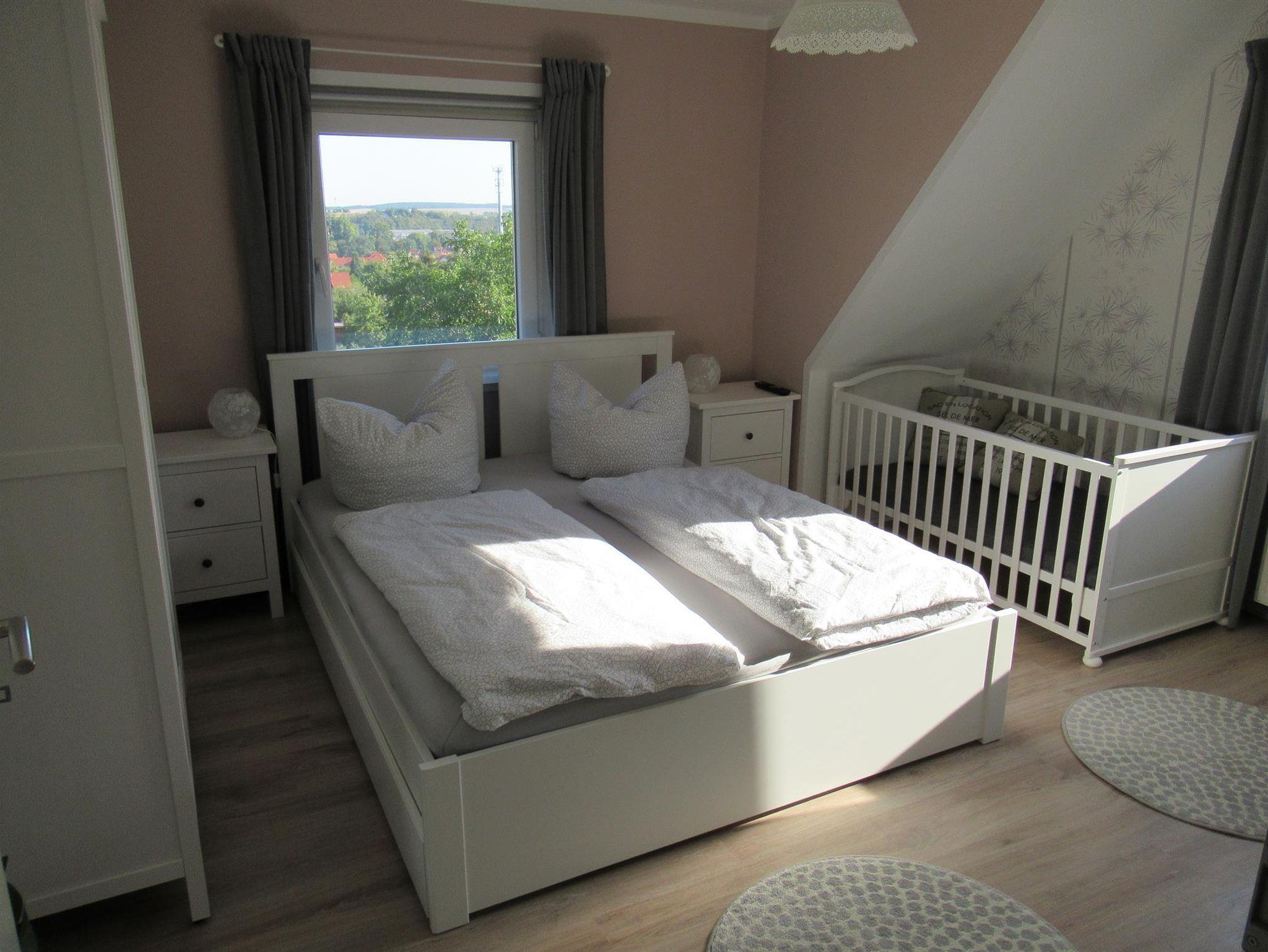 • Schlafzimmer: Doppelbett (1,60 x 2,00 m), Kleiderschrank, TV, Babybett